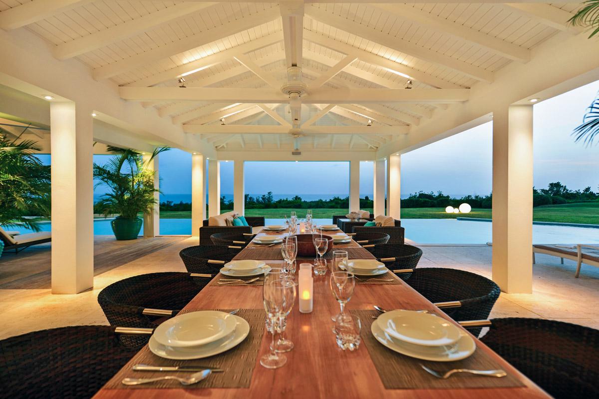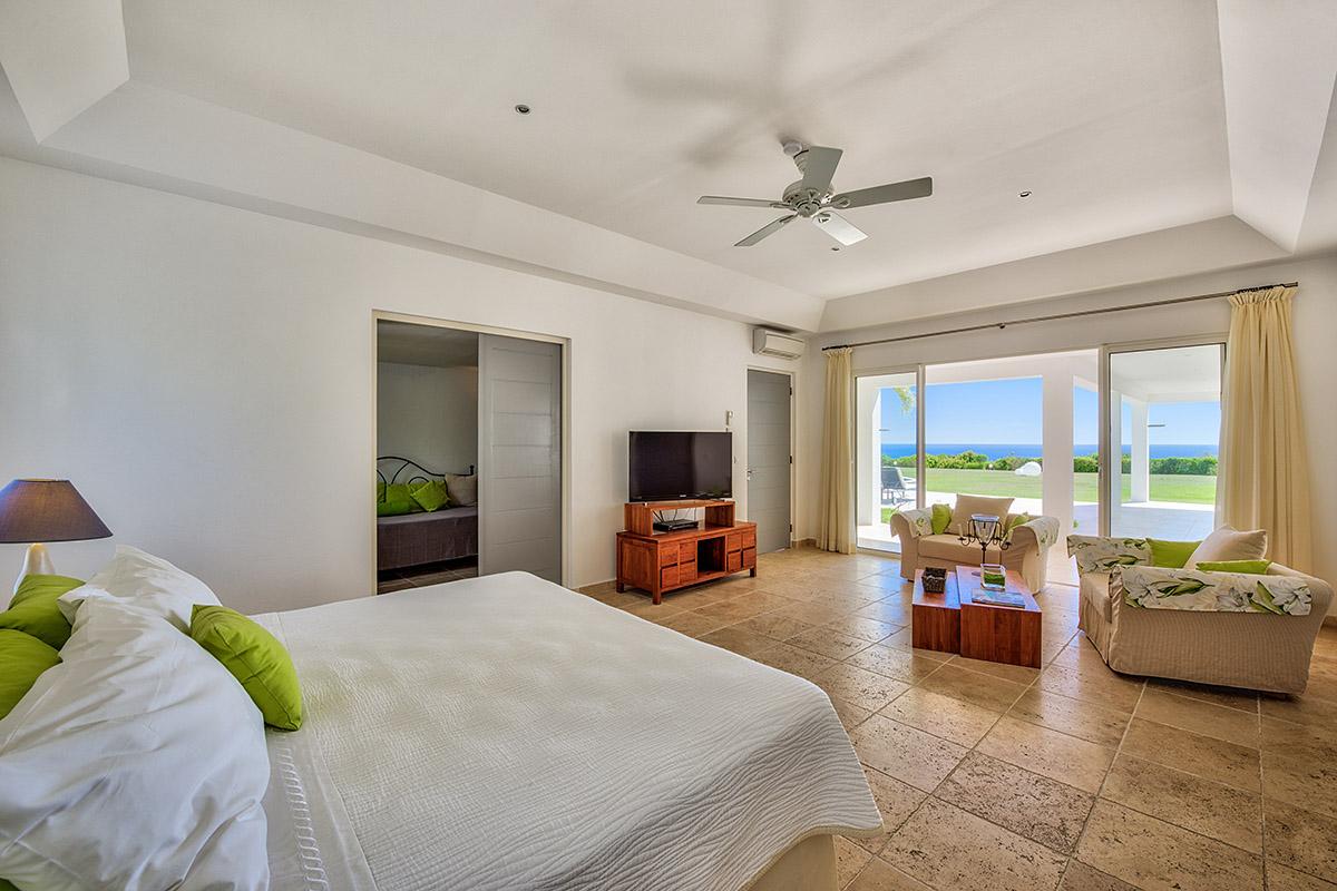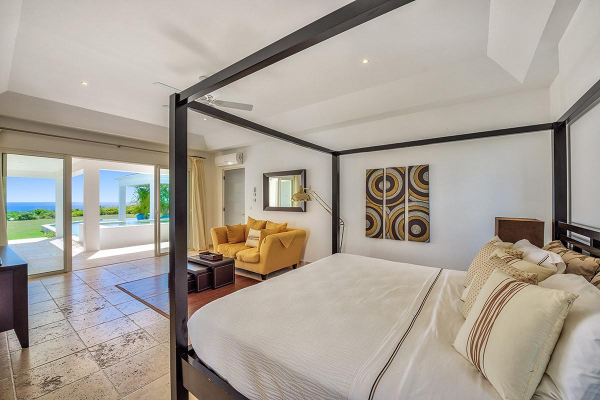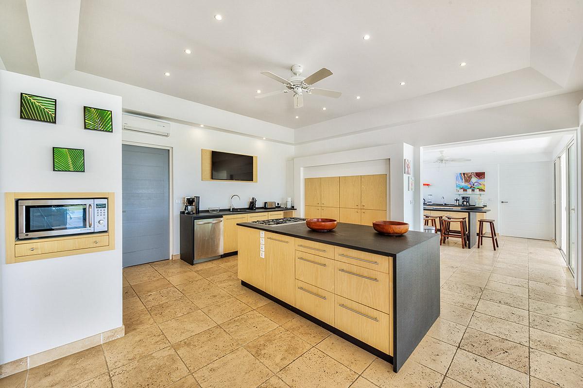 Ambiance is open, airy and spacious; a perfect villa for an extended family, weddings or company retreat. It has everything you need to enjoy the day from dawn until dusk. The overall décor is sleek, elegant and contemporary but never boring. The large interior living room, perfect for conversation or entertainment, tastefully mixes natural elements and rich tones; dark wood and teak, wicker, cream and pops of color. Pocket doors disappear into the walls enhancing the view. Although sea views and breezes abound, the great room is fully air conditioned.