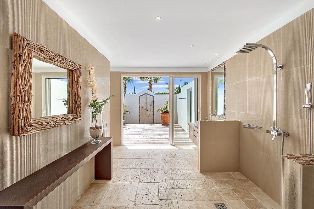 The four equal size bedrooms are spacious and comfortable. Two sit on each end of the villa. The décor creates a serene atmosphere blending designer touches and art; neutral tones of beige, brown, black or grey and white with individual pops of rich color. Each room has private seating, sea views and beautiful spa style bathrooms in travertine, stone and wood. Three bathrooms have private outdoor showers; one has a sea view.