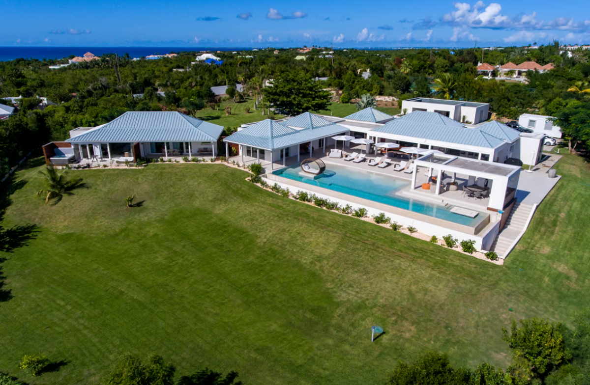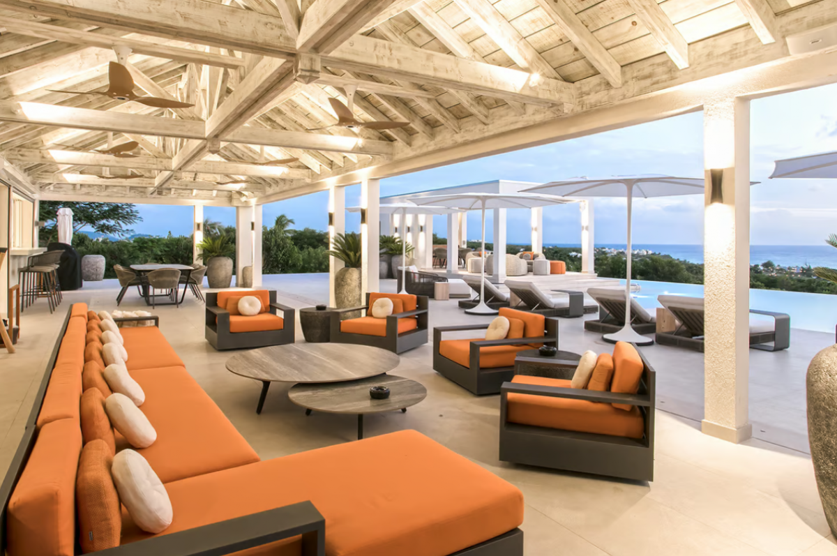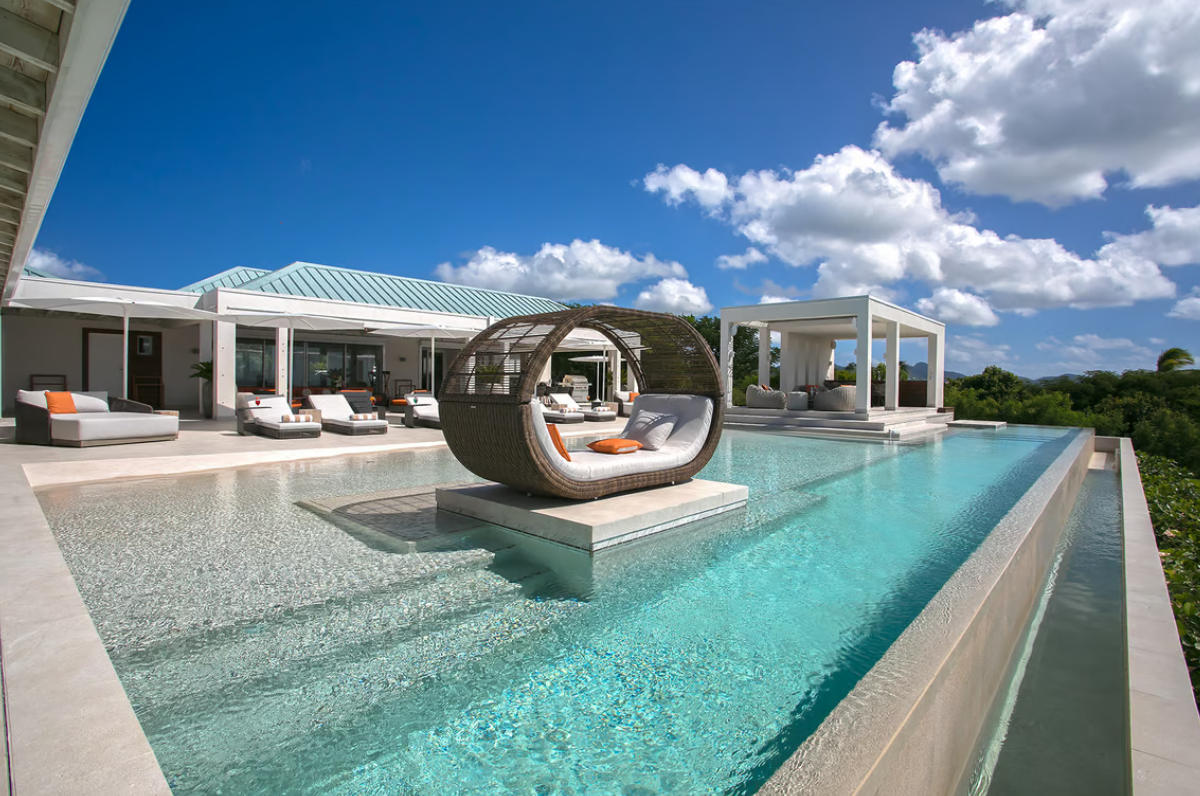 Experience the epitome of luxury at Avanti, a five-bedroom St Martin villa in Terres Basses that welcomes you with a palm tree-lined, gated driveway and stone fountains. The home features breathtaking 180-degree ocean views, a lush lawn, and an L-shaped saltwater pool with a built-in table, seating area, and "island" daybed.