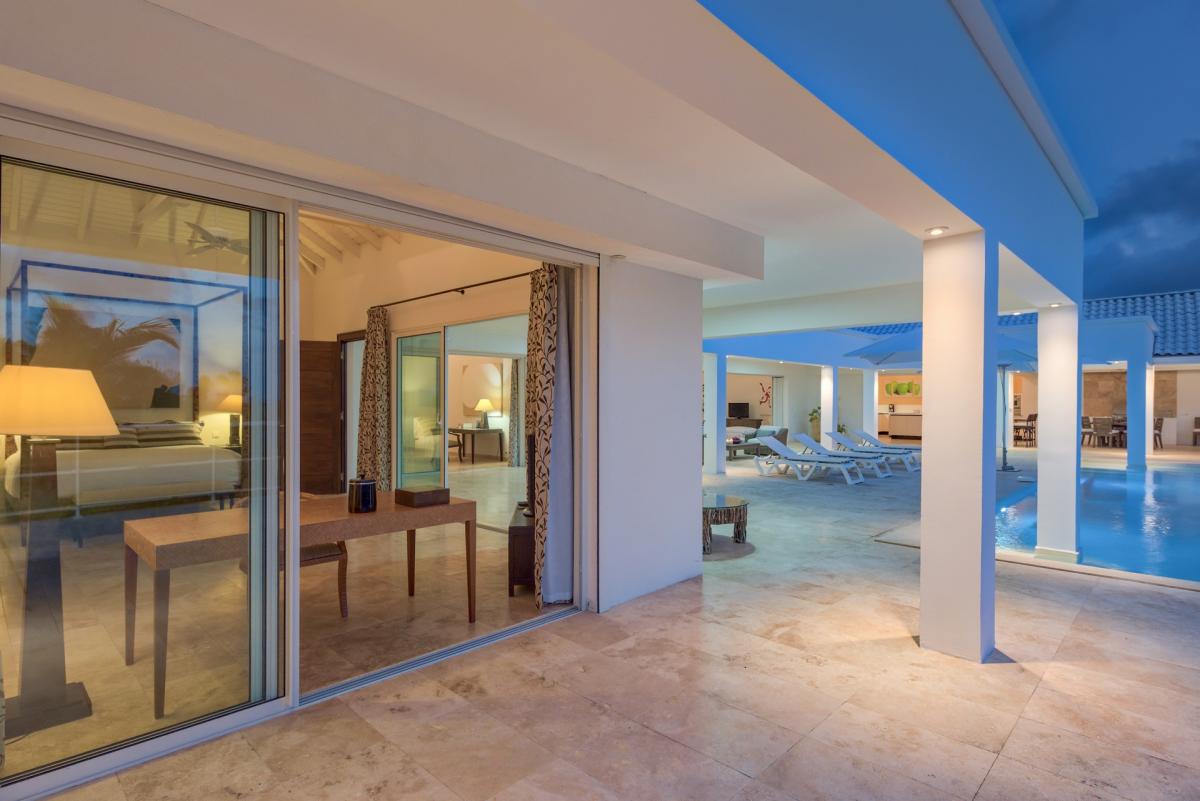 The grand living room is open, airy with an opulent contemporary attitude. Floor to ceiling doors disappear into the wall providing unobstructed views and breezes. Sand color travertine tiles flow seamlessly from indoors to outdoors. Gorgeous designer furniture detailed in beautiful dark woods, comfortable upholstered seating and tasteful art create a relaxing interior lounging area. The color scheme is relaxing in cream, off white and taupe. The sleek and stylish open plan kitchen is open to the view and the exterior dining room, while the barbeque is adjacent to the kitchen. Throughout the villa, pots filled with tropical plants dot the terraces creating a Feng shui attitude.