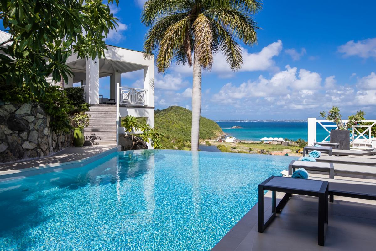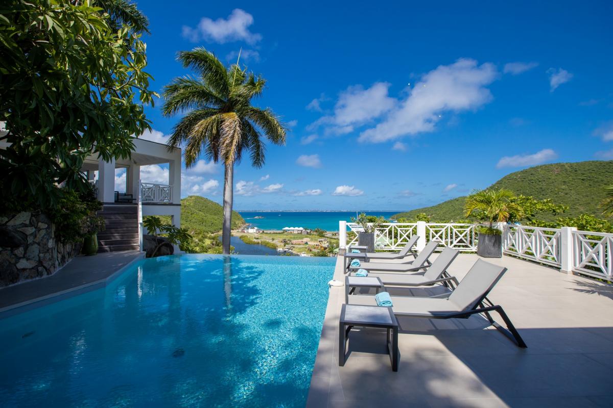 Casa Sand is a beautiful 3 bedroom villa nestled in the hills of Anse Marcel with spectacular ocean views. Surrounded by lush tropical vegetation, the villa has a large infinity pool, a spacious terrace with outdoor dining area, and a charming gazebo built into the hillside. Fully air conditioned, Casa Sand has a large living/dining area with an open plan gourmet kitchen. Very stylish and comfortable, the living area is filled with objets d’art with glass sliding doors opening the whole length onto the pool terrace. The three bedrooms each have en suite bathrooms. The master and second bedroom can be accessed from the living area, and the 3rd bedroom has it’s own separate entrance from the terrace. Casa Sand is very secluded and tranquil, but an easy 5-minute drive to Anse Marcel beach.