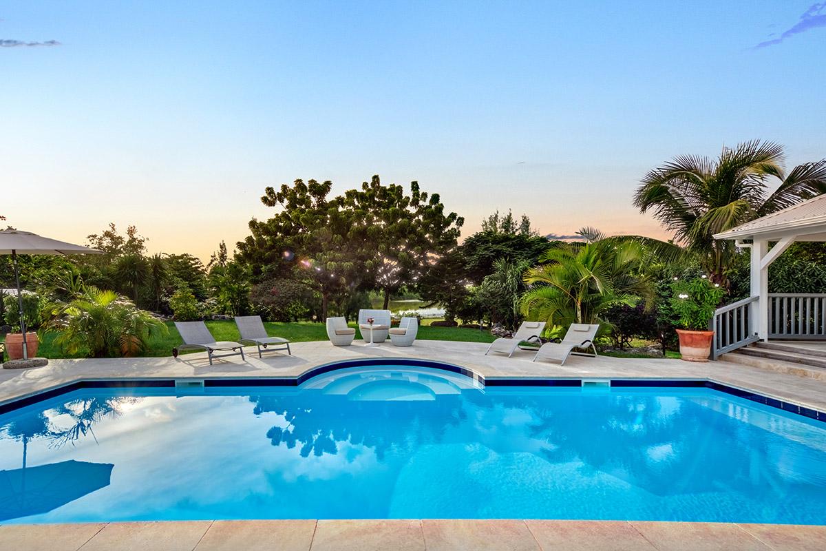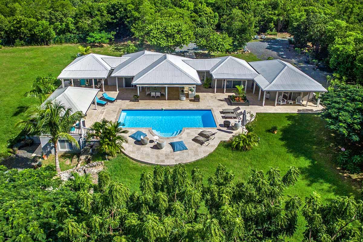 The main house is filled with charming Caribbean touches with a contemporary twist. The exterior’s soft grey and white colors and Creole flourishes well suit the tropical green setting. It is a very well curated villa, both inside and outside, filled with interesting colors, textures and décor. The overall mood is serene. The terraces are defined with travertine tiles. A large pool sits at the edge of the terrace and lawn. A spacious gazebo and deep verandahs provide generous covered spaces for dining and lounging. Stylish white wick furniture, adorned with interesting fabrics and colors, invite you to relax.