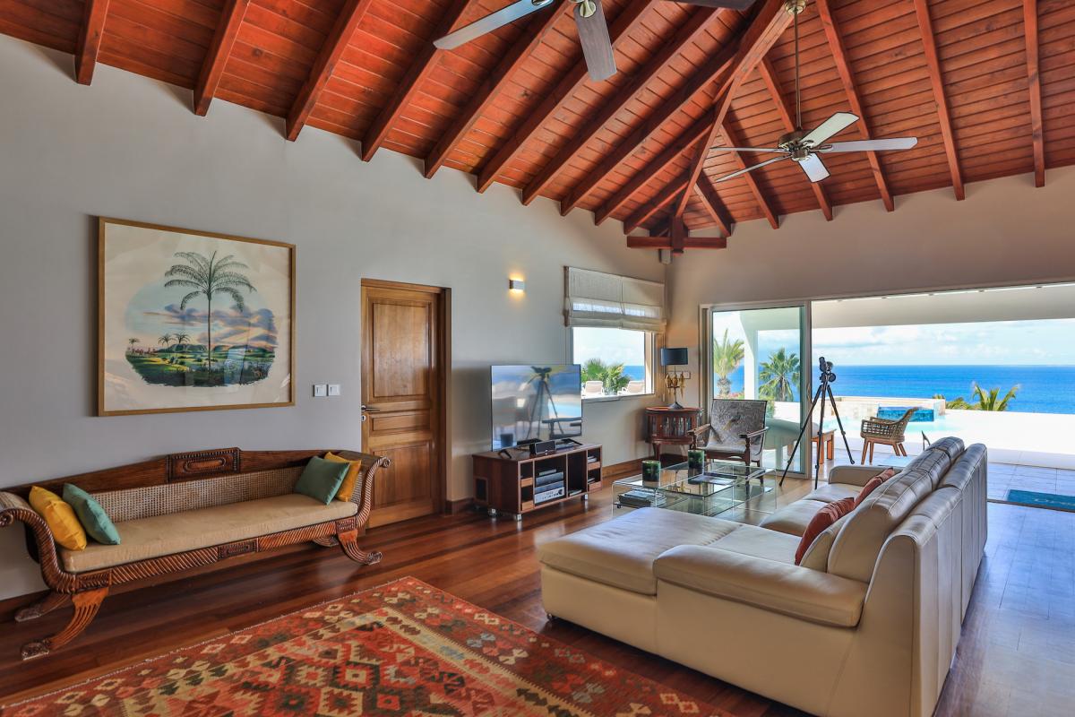 This contemporary yet exotic villa provides the best of stylish indoor and outdoor living. Expansive terraces, in sand color stone inset with tropical plants, create a perfect flow from indoor out to the sea. Center stage is the large main pool accented with an encased Jacuzzi. A smaller plunge pool creates a private little oasis. Covered terraces filled with elegant teak furniture provide comfortable spaces to gather for lounging and dining.
