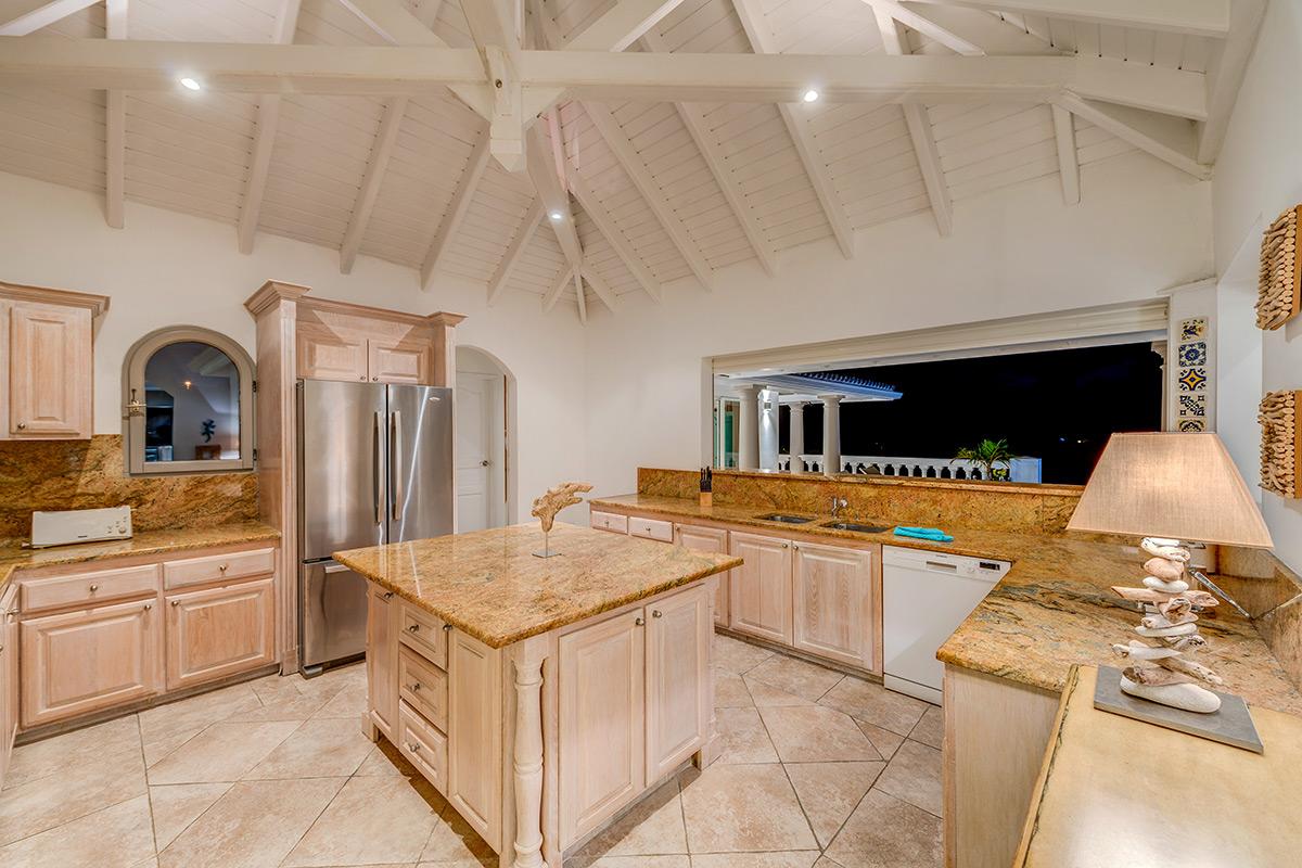 Each interior room has a sea view. The large open plan great room, fully open to the terrace by floor to ceiling sliding glass doors, has a serene attitude. Comfortable seating in taupe with soft pops of color is accented with light woods and interesting accessories. Arched doors and windows add an exotic touch. The beautiful French country style kitchen looks out to the sea and the pool area. It’s an inviting space for a professional or amateur chef.