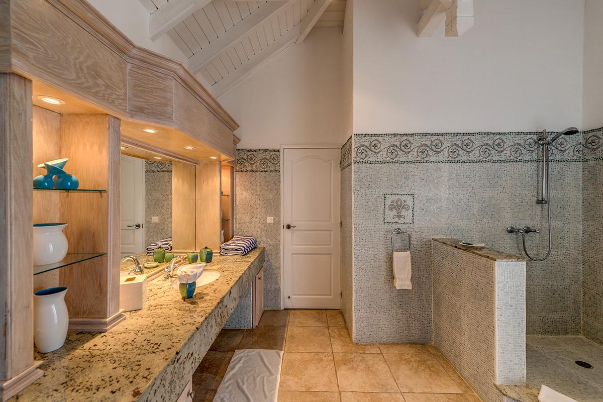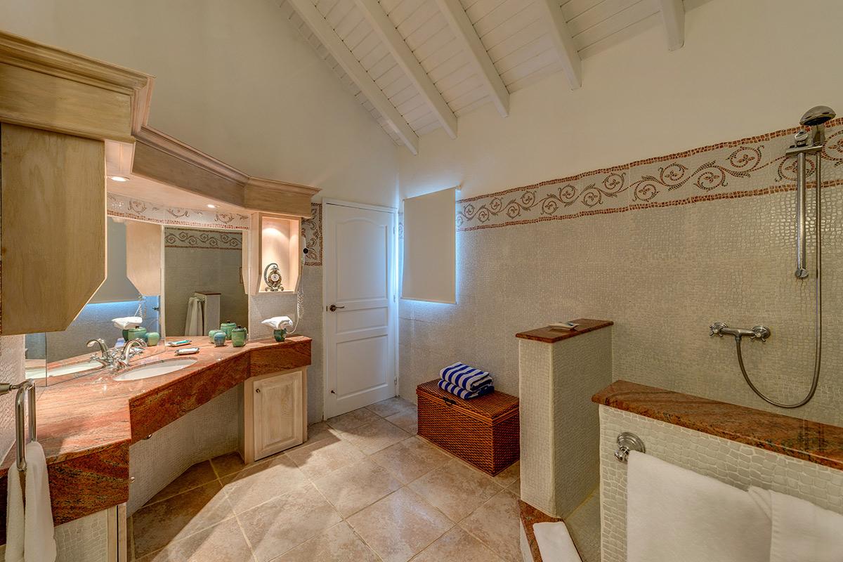 Three equal size bedrooms are on the upper level on either side of the great room each with a sea and garden view. The attitude is softly modern in rich neutral tones accented with interesting art, charming touches and comfortable furniture. The en-suite bathrooms are simply beautiful in exotic mosaic tiles, granite counter tops, flattering lighting and stylish cabinetry. The very private fourth bedroom is on the lower level with a large private terrace; the view encompasses the lush garden. The colorful en-suite bathroom is outfitted in exotic Moroccan blue tiles.