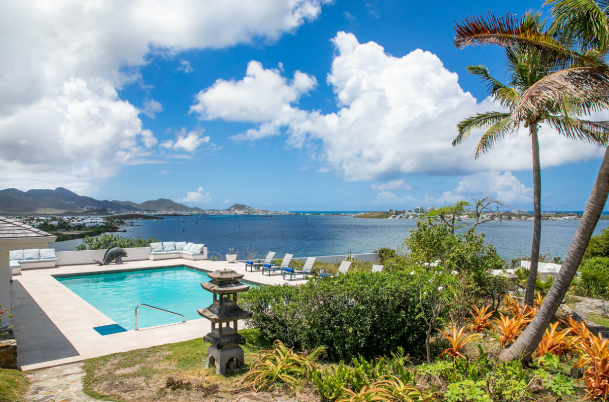 The large swimming pool is located in the garden, steps away from the main house. The pool has a guest bathroom, a shaded sitting area and a wet bar which overlooks the Lagoon and the island of St Martin.