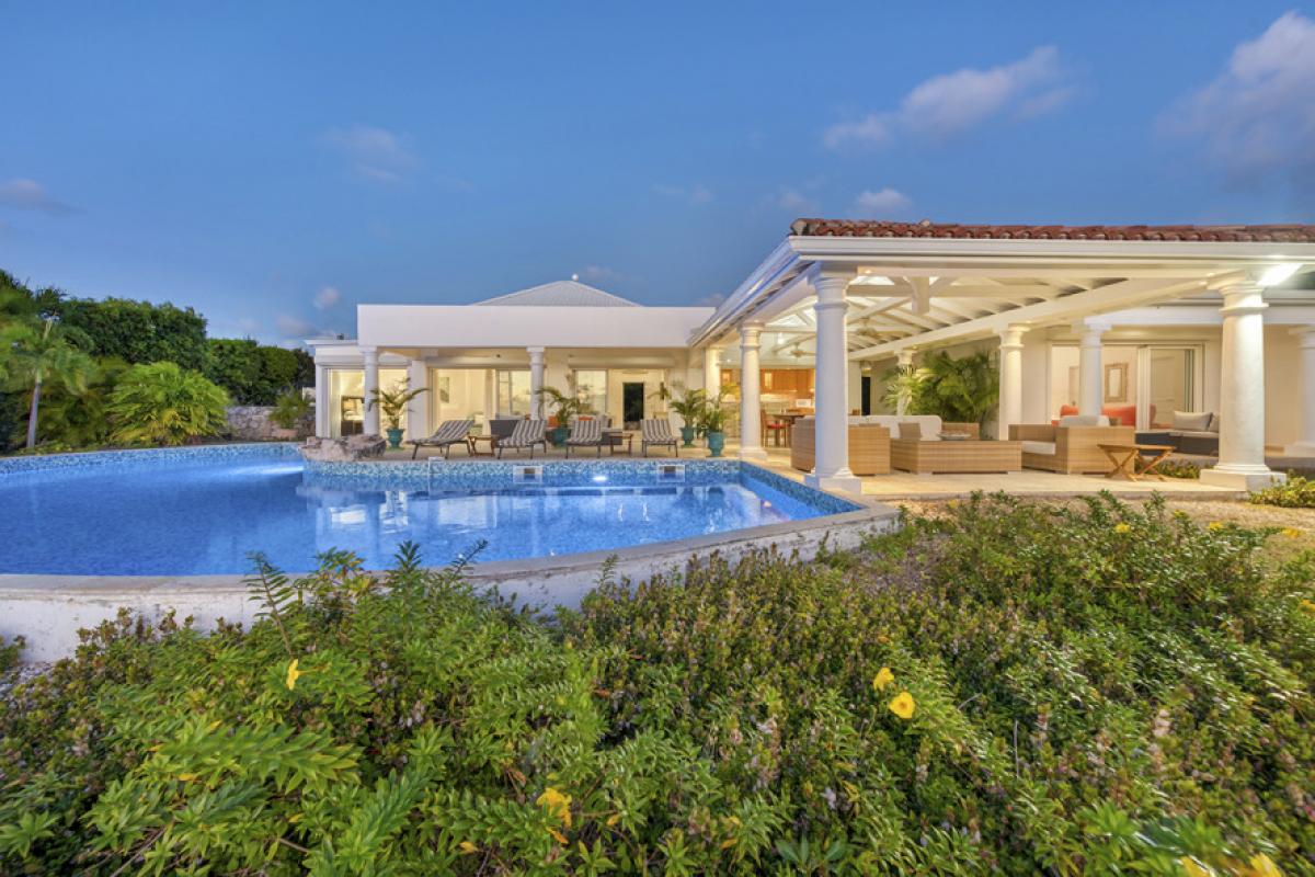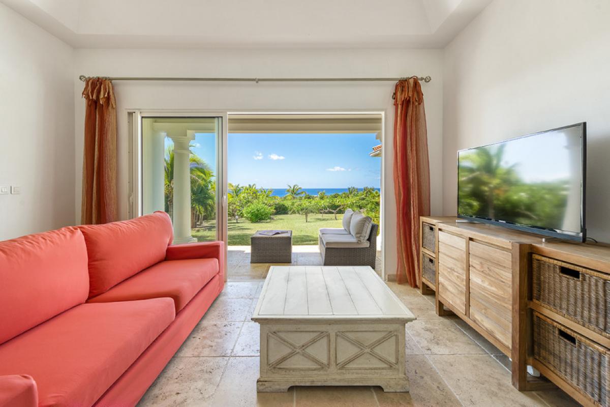 The charming well-equipped kitchen in soft stone tiles, painted teak and soft corals opens to the living space and the outdoors. Eat at the kitchen counter or on the outdoor covered loggia off the pool. Spacious outdoor terraces feature a lounging area with oversized weather resistant wicker sofas and comfortable al fresco dining areas. Contemporary chaises, surrounding the stunning tiled pool, face the sea and gardens.