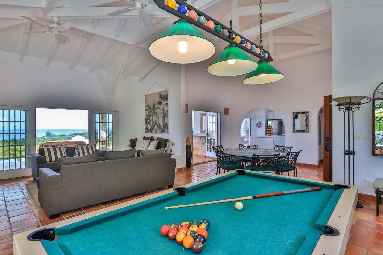 The house is perfect for outdoor living and entertaining with multi-level terraces that descend from the main level to the large horseshoe shaped pool and beyond to the lawn. Multiple al fresco dining and seating areas take full advantage of the view; whether privately or together with friends and family. If you wish to relax inside, while still enjoying sea views, step into the large comfortable living room with 40” flat screen satellite TV/DVD, stereo system, and full sized pool table. Adjacent to the interior dining and living room is a well-equipped kitchen fitted with fine dinner & glass ware and everything required for a gourmet meal. Open to the view, the kitchen connects the chef with the guests or prepare your al fresco meal on the built in gas barbeque.