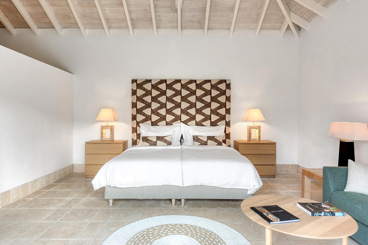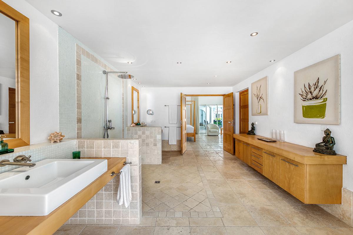 This St. Martin villa rental's principal feature is the oversized wrap-around pool and a central columned gazebo, perfect for al-fresco dining and lounging. The uninterrupted flow between the interior and exterior comes from large glass doors that slide seamlessly into the walls providing a vast living area and adjoining terrace with a stunning backdrop of sea and sky.