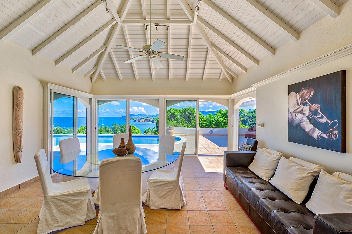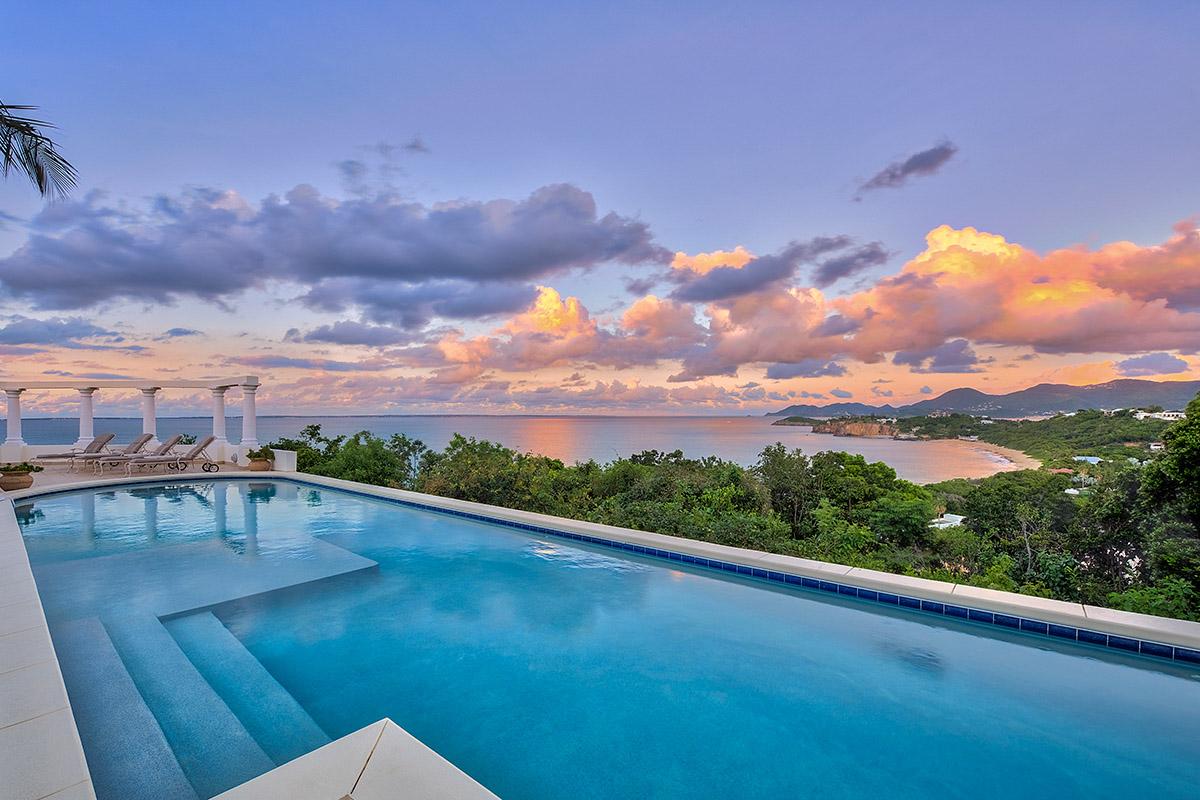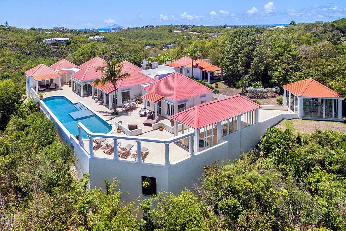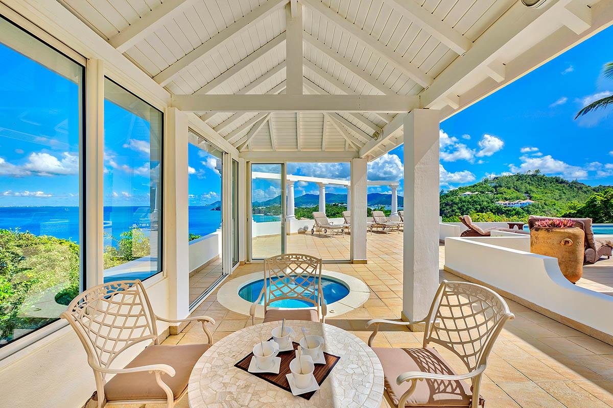 This brand new villa offers spectacular ocean view, a huge custom made kitchen with granite counter tops, a fantastic dining-living room with breathtaking views, a large plasma TV in sitting room with a collection of 200 DVDs and a charming gazebo with stunning views of Baie Rouge beach and Anguilla. This beautiful house turns to a super deluxe fully air conditioned four bedrooms hillside property. The heated pool has been enlarged twice its size, the patio area around the pool is very large and extends towards Bay Rouge. A large shade area has been built for this patio. The patio is extended to the pavilion. The fourth bedroom becomes a large bathroom and a new large bedroom has been added. New large furniture for the main living room and dining room. Plasma TV & DVD in each of the bedrooms. A large gym room has been added with complete equipment and a flat screen TV. A Jacuzzi has been installed in the patio. Free phone calls to USA & Canada (Vonage phone access) and Computer access with Internet high speed connection. Can be rented as a 2-3 & 4 bedroom villa!