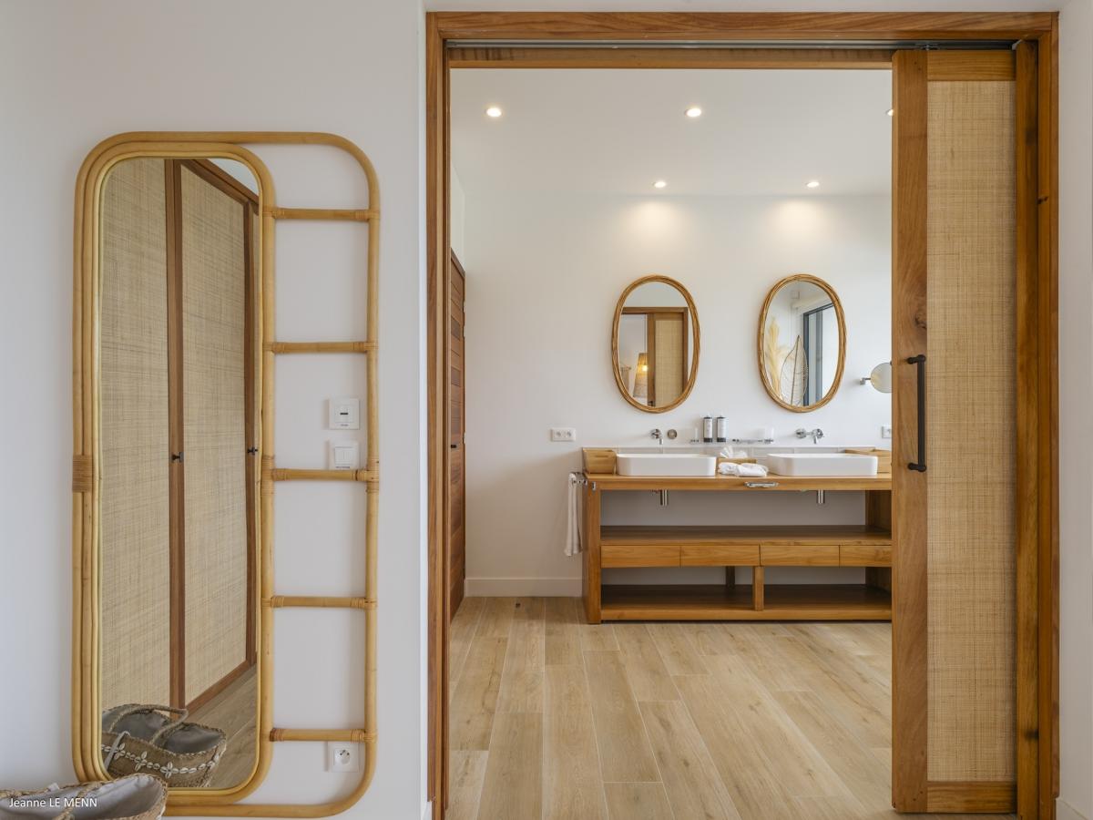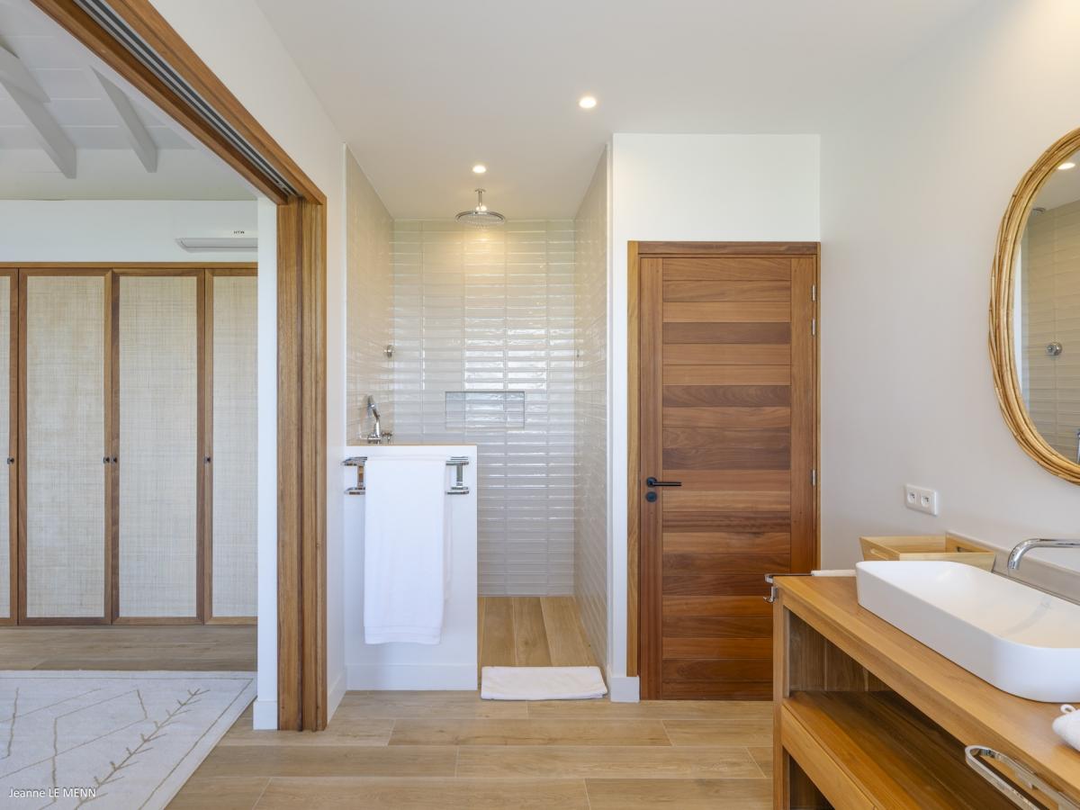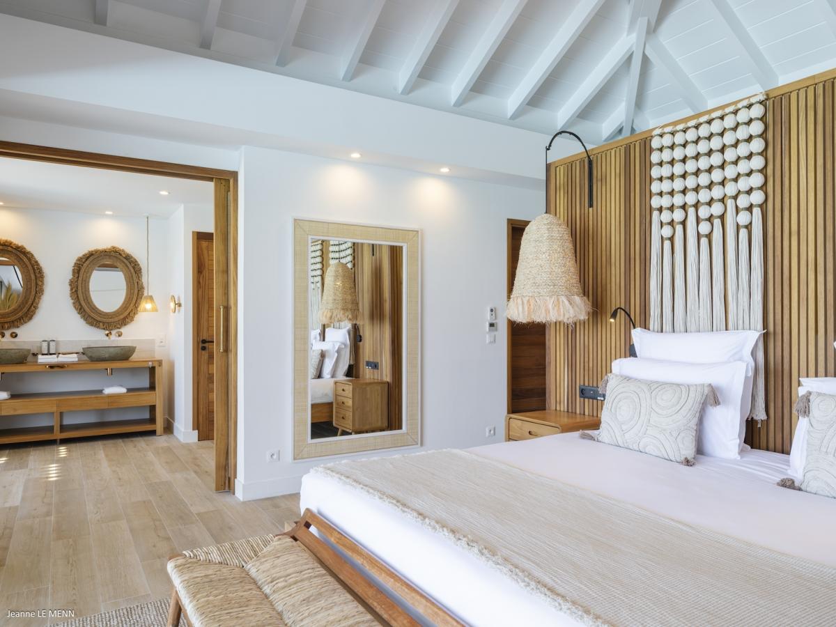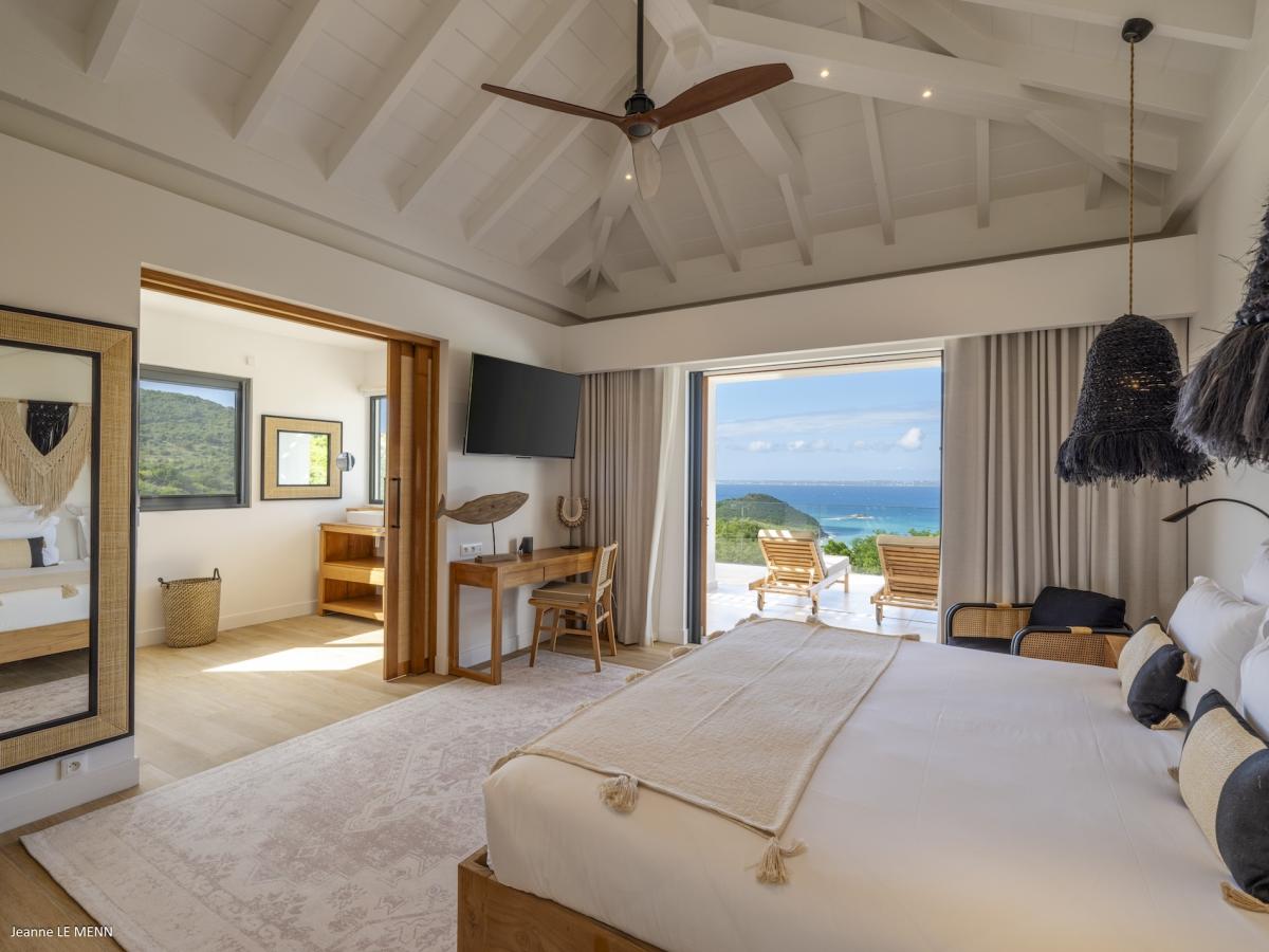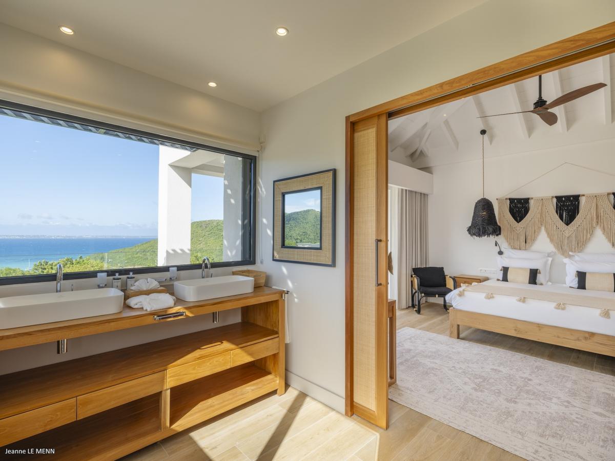 Each of the five bedrooms provides unobstructed views of the horizon and complete privacy. Three of the bedrooms are on the same level as the main living and the remaining two are accessible via a small staircase beside the pool, open onto private terraces. All bedrooms have bright ensuite bathrooms featuring a walk-in closet.