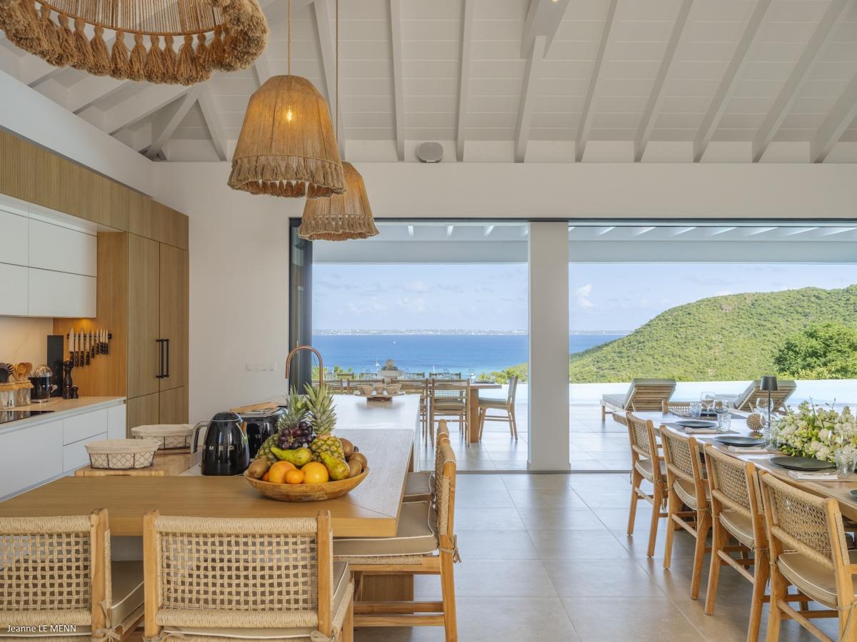 Villa Abaca is an exceptional St Martin villa rental nestled in the heights of Anse Marcel. It is a stunning five-bedroom residence offering breathtaking ocean views and seamless indoor-outdoor living. This luxurious St Martin villa features an expansive living room that connects to an infinity pool, creating a harmonious space filled with natural light.
