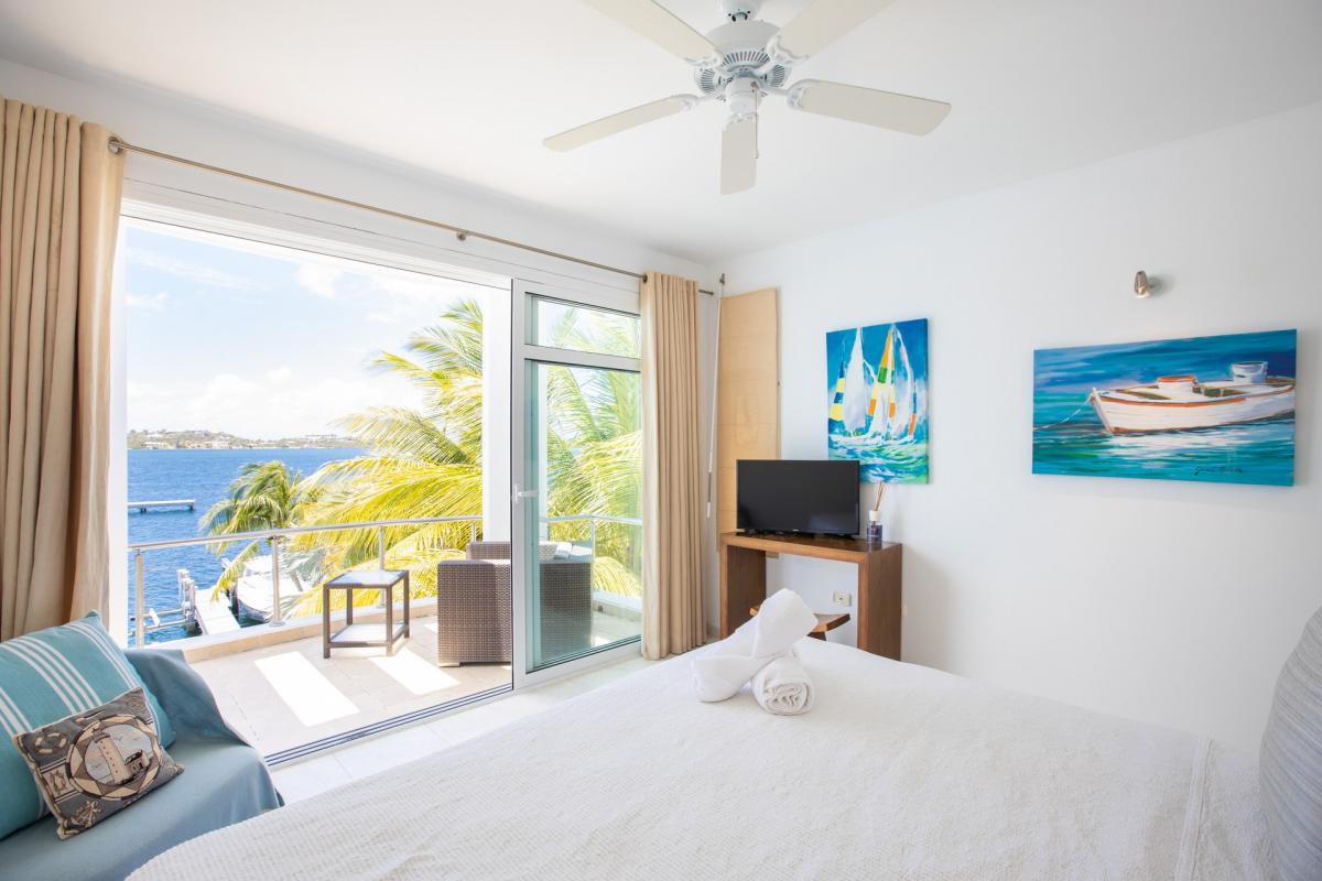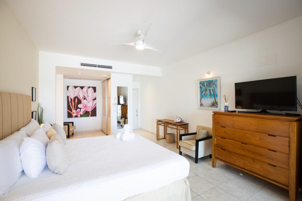Bedroom 4: This room is equipped with a queen-sized bed, a lagoon view, a fan, air conditioning, a TV, and an ensuite bathroom.
