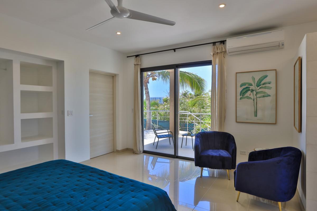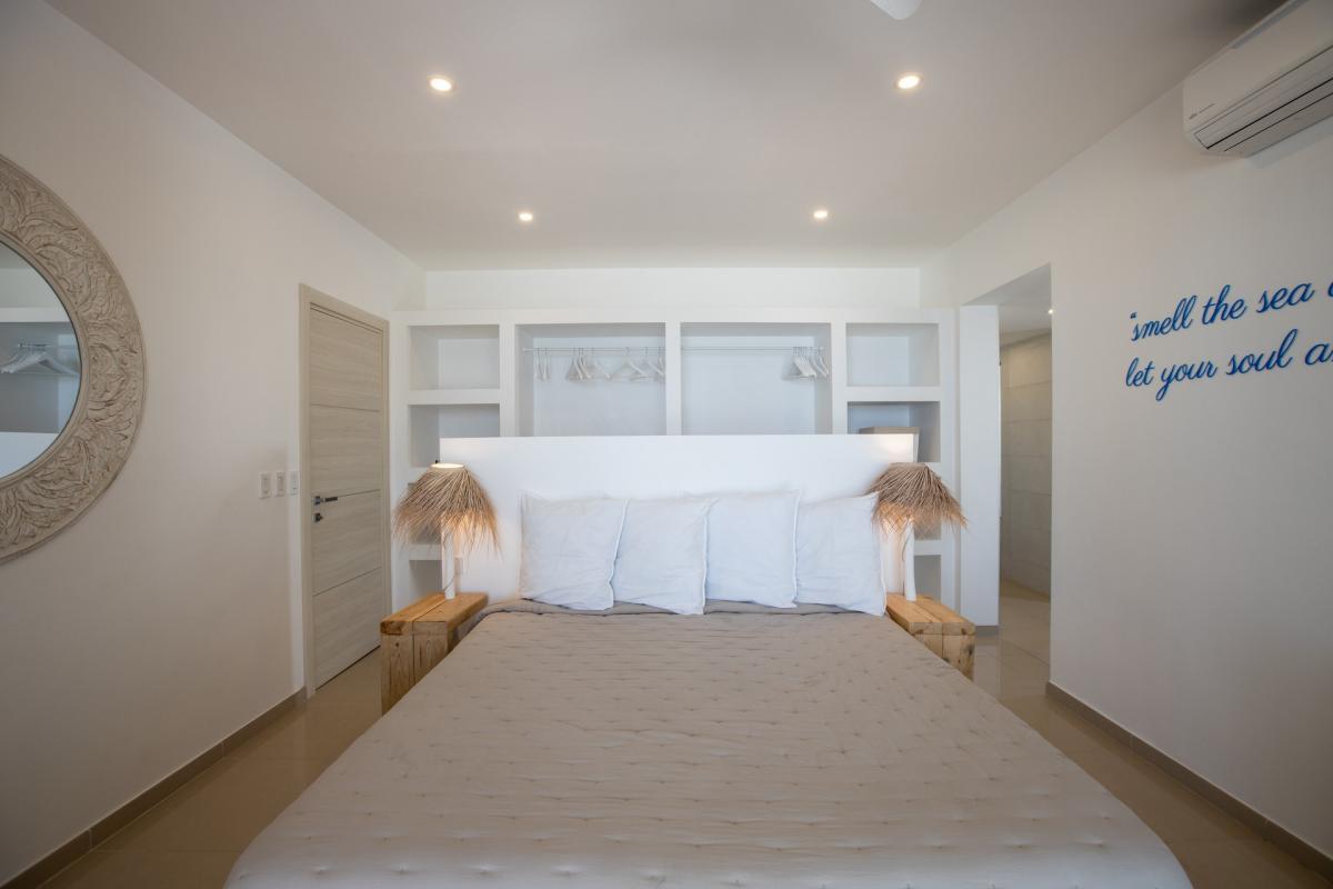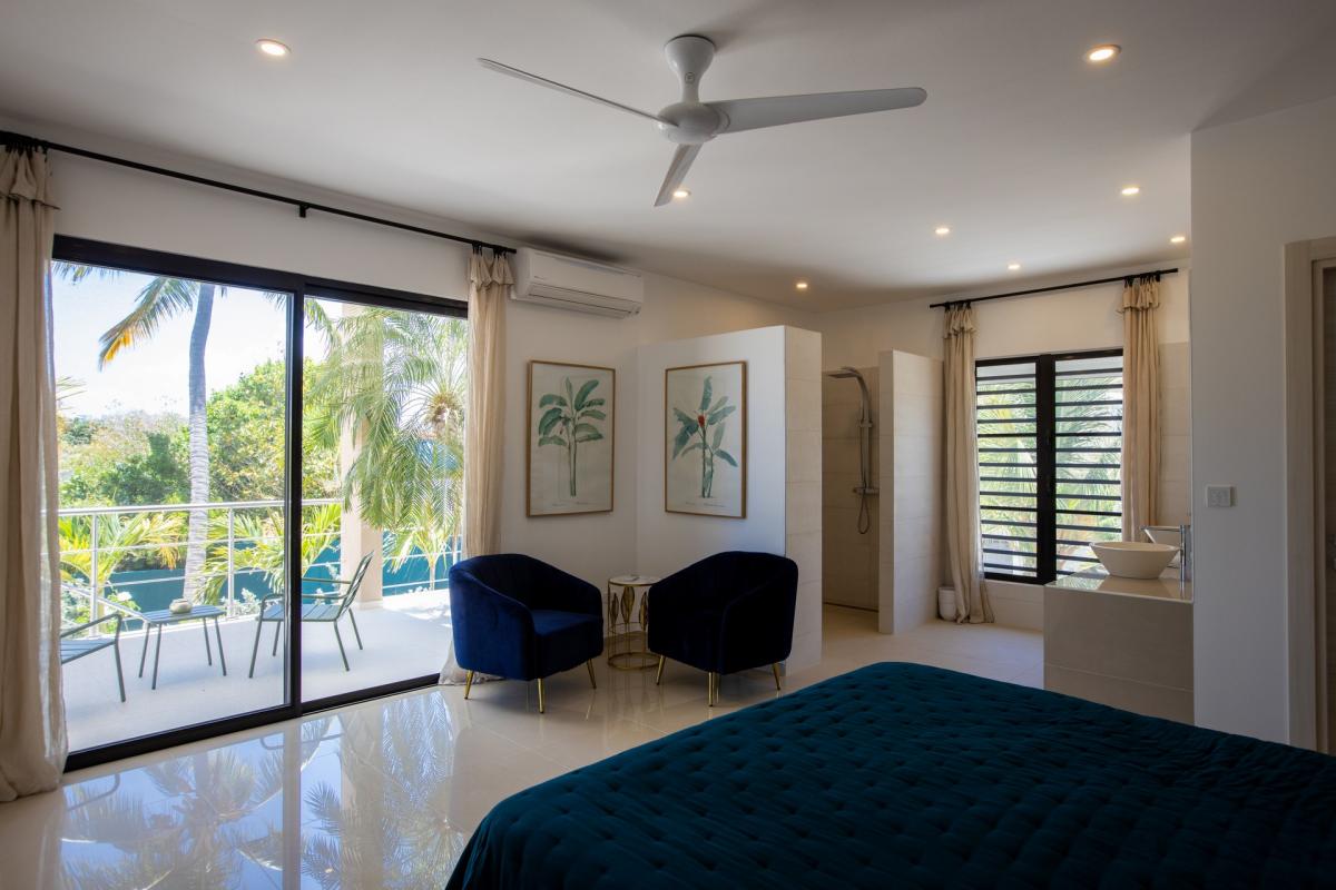 Bedroom 1: This room is equipped with a king-sized bed, a fan, air conditioning, a safe, and an ensuite bathroom. This bedroom has an ocean view.