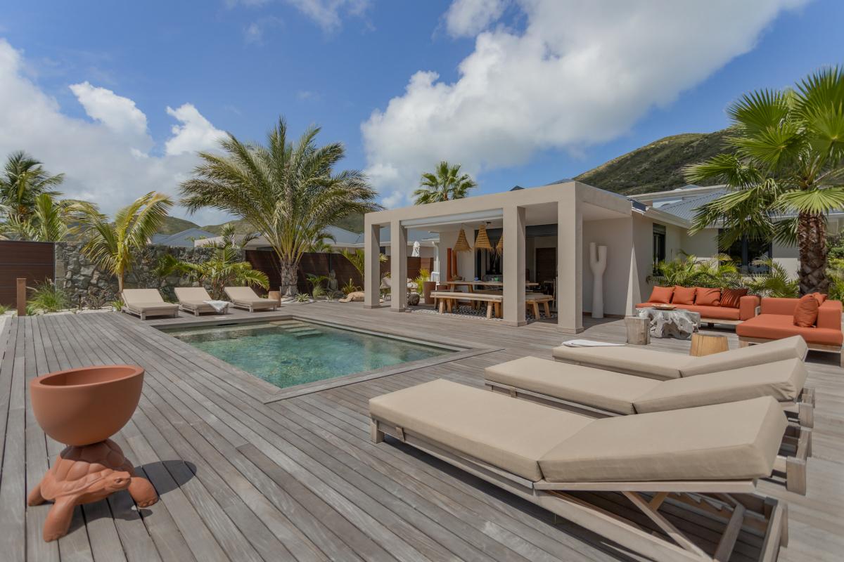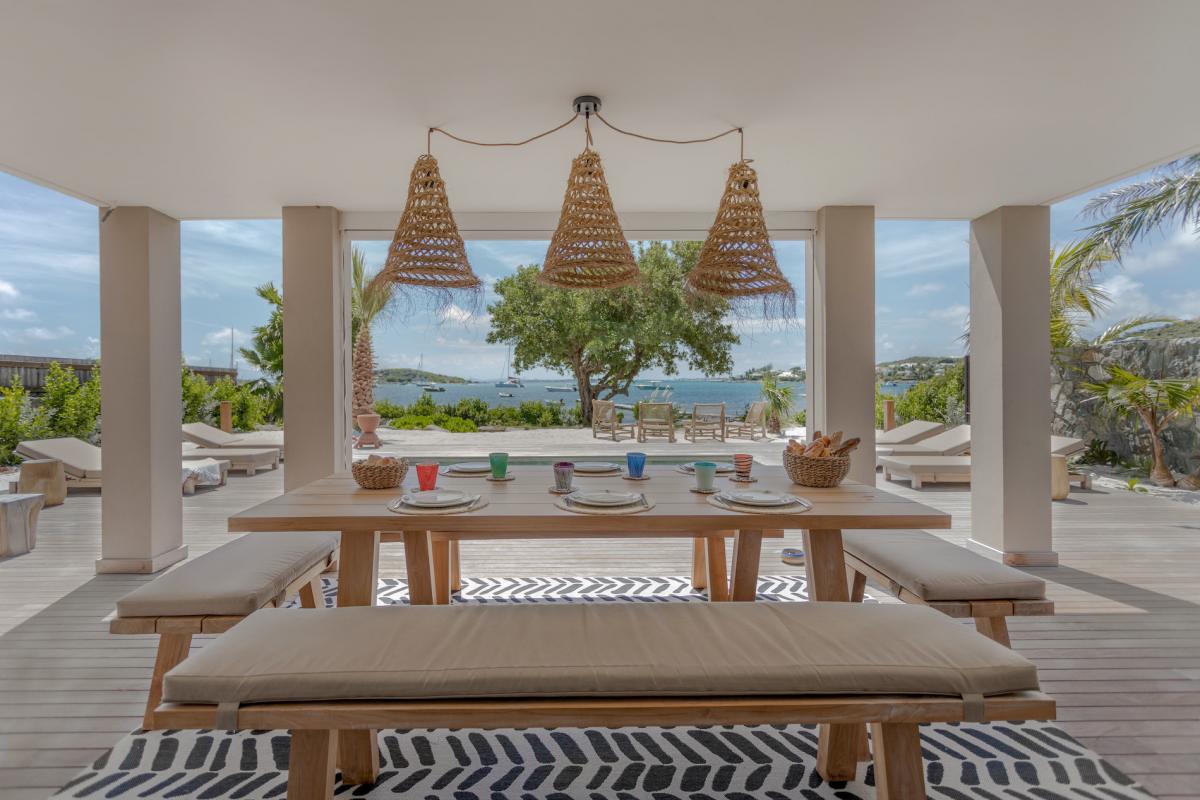 Villa The Beach House, set along the tranquil waters of Cul de Sac Bay in Saint Martin, offers an exquisite balance of modern elegance and Caribbean serenity. This stunning St Martin villa immerses you in a world where natural light, ocean breezes, and sweeping sea views define every moment. Expansive sliding glass doors open the interior to the outdoors, creating a seamless flow between the airy living spaces and the sun-drenched terrace. Guests can enjoy shaded seaside lunches, relax in the outdoor lounges, or savor sunset cocktails beneath the gazebo while gazing toward Pinel and St. Barts—perfect for an unforgettable St Martin vacation.