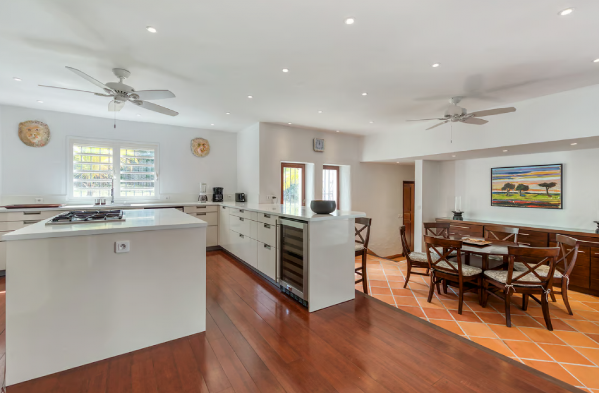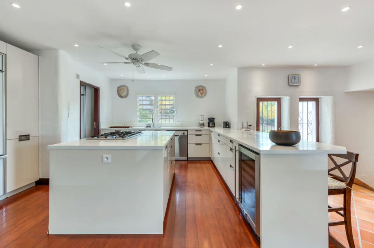 Inside Villa La Hacienda, there is a great room that offers classic Caribbean charm with cool terracotta floors, vaulted Spanish-style ceilings, and rich dark wood accents. There are large pocket doors that open completely to capture the island breeze and stunning sea views. The indoor decor is a sophisticated mix of white and taupe furnishings against elegant dark wood, to create an inviting atmosphere. There is also a modern kitchen that has been newly renovated and is fully equipped.