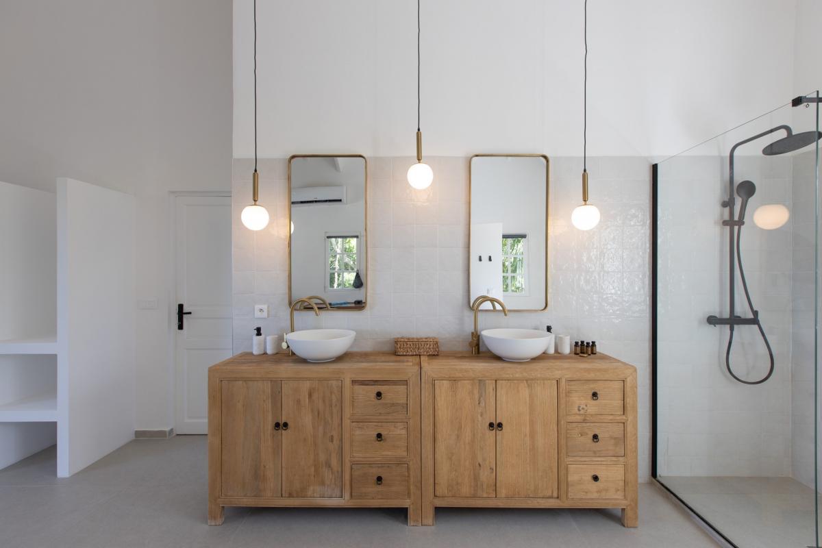 The main level of Villa Les Oliviers holds the primary bedroom with an ensuite bathroom. There are two additional bedrooms with ensuite bathrooms that overlook the pool. One of the bedrooms is accessible from inside the house, while the other is accessed from the terrace, allowing for a seamless blend of indoor and outdoor living. Guests can find the fourth bedroom on the lower level of Villa Les Oliviers. This room serves as a true sanctuary, with its private access through a small path next to the house, a private terrace, and a pond with koi fish.
