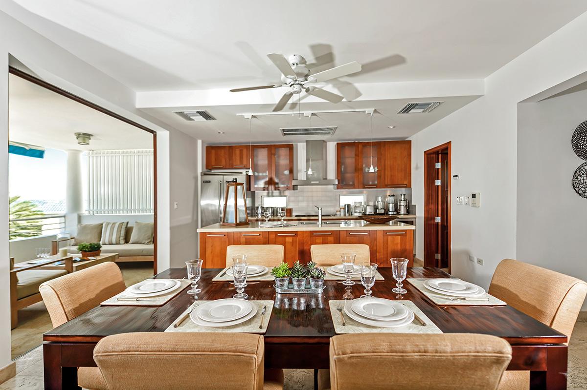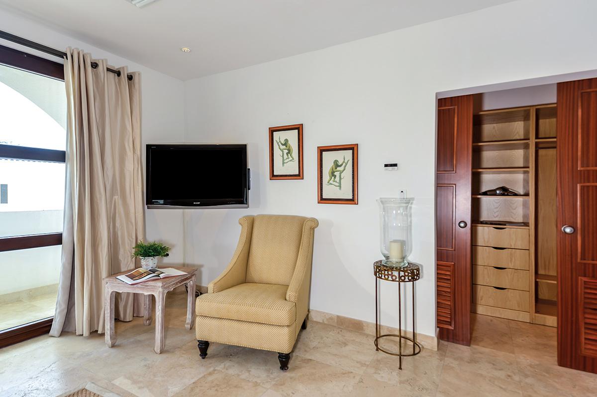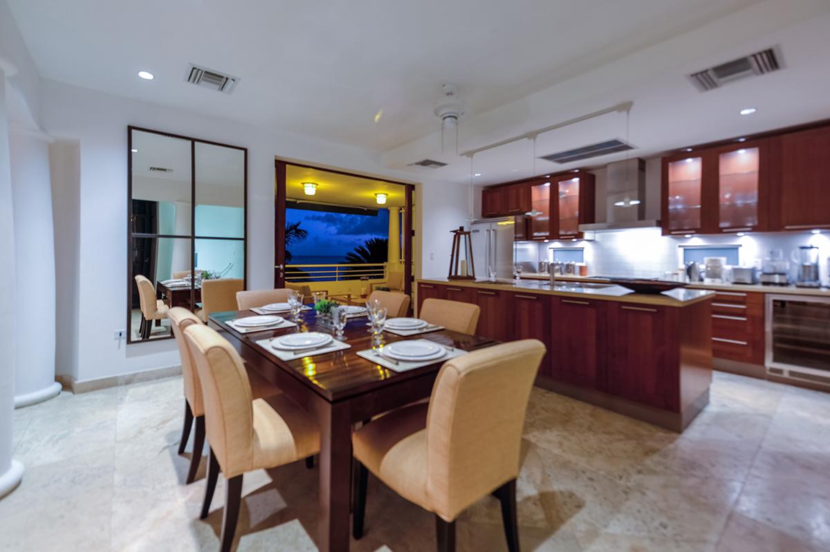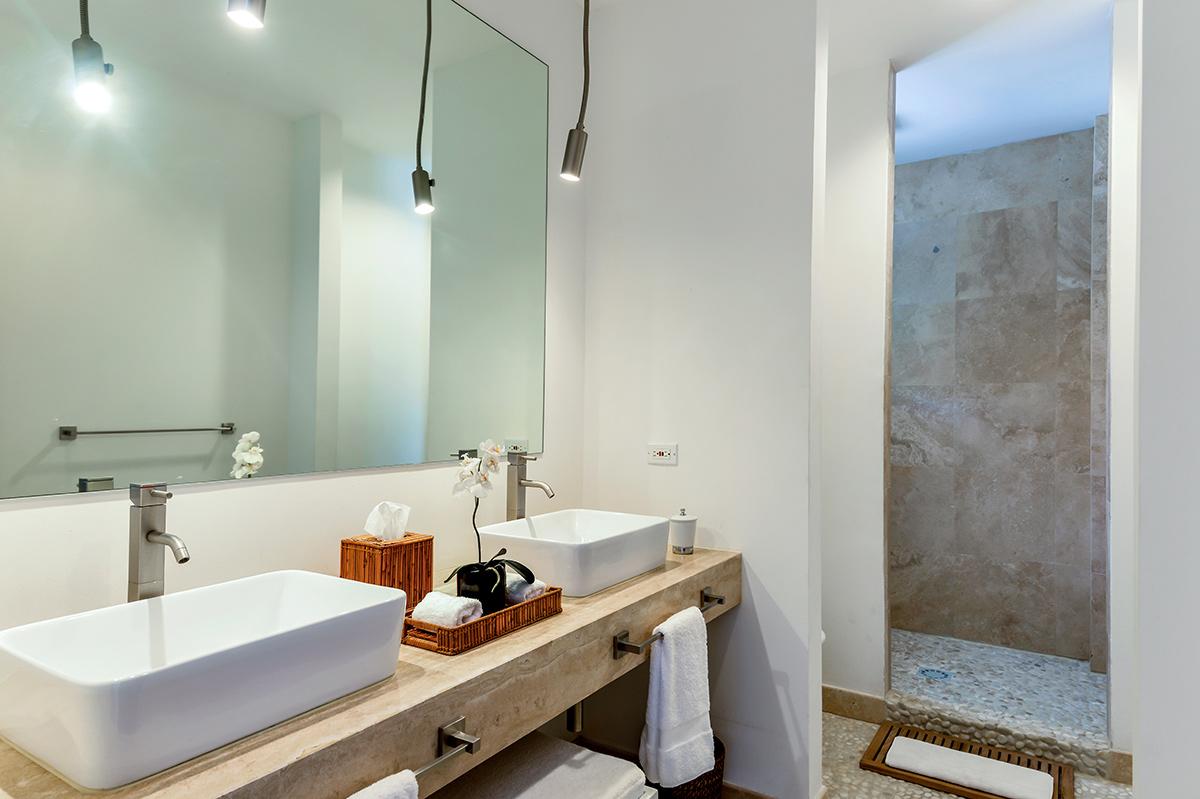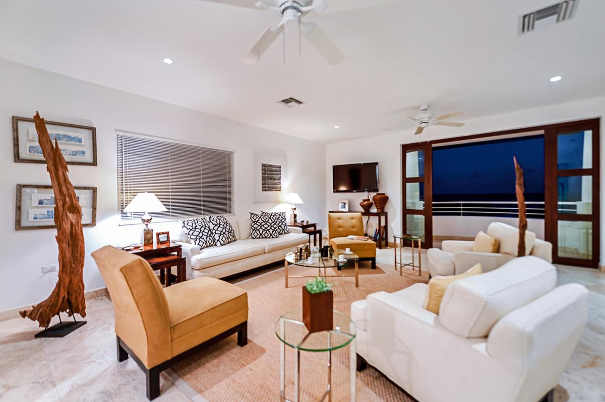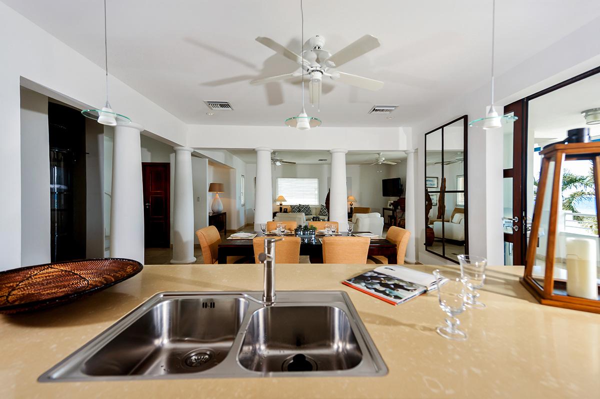 As you drive through the gates into the Shore Pointe development you just continue straight another 70 yards and you will arrive at Villa Luna. The villa includes one parking spot by the front entrance and additional vehicles can park just around the corner. From the parking area there are also a set of stairs up to the bottom of 3 floors that comprise Villa Luna – but don’t worry, there’s an elevator. On the first floor you’ll find 2 almost-identical bedrooms with ensuite bathrooms, flat screen TVs, and access to a small lower terrace (perfect for a quiet morning coffee). The second floor is completely open with a fully equipped kitchen, dining table, and large living room. There is access to a terrace from this level as well – where you’ll find a BBQ and a comfortable outdoor seating area.