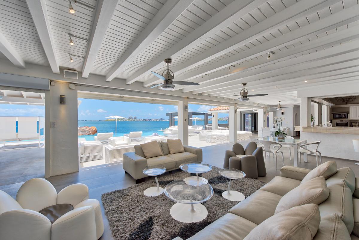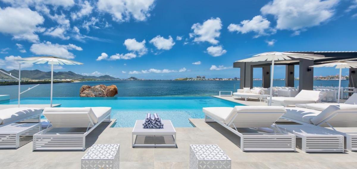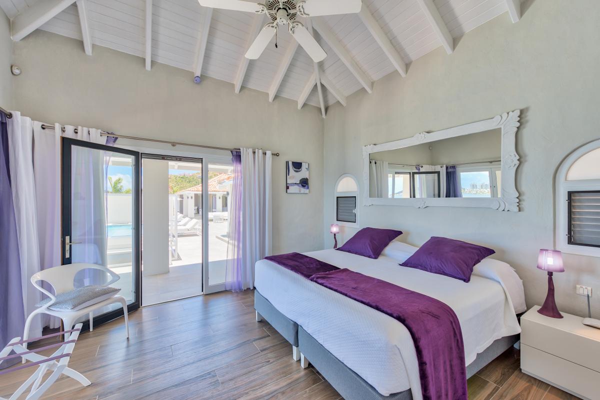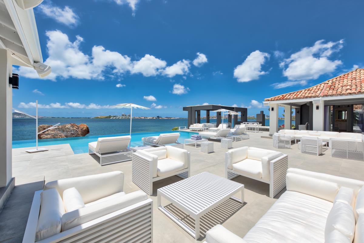 Villa Mirabelle is a gorgeous St. Martin rental located on Simpson Bay lagoon in Terres Basses. This modern St. Martin villa has five bedrooms, all with their own ensuite bathroom. The well equipped kitchen opens onto the terrace and has a view of the lagoon. The covered terrace is equipped with fans, and two aqua bikes are available.