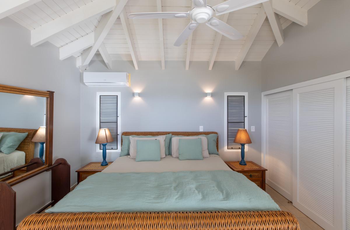 Bedroom 1: This room is equipped with a king-sized bed, an ocean view, a fan, air conditioning, a TV, and an ensuite bathroom.