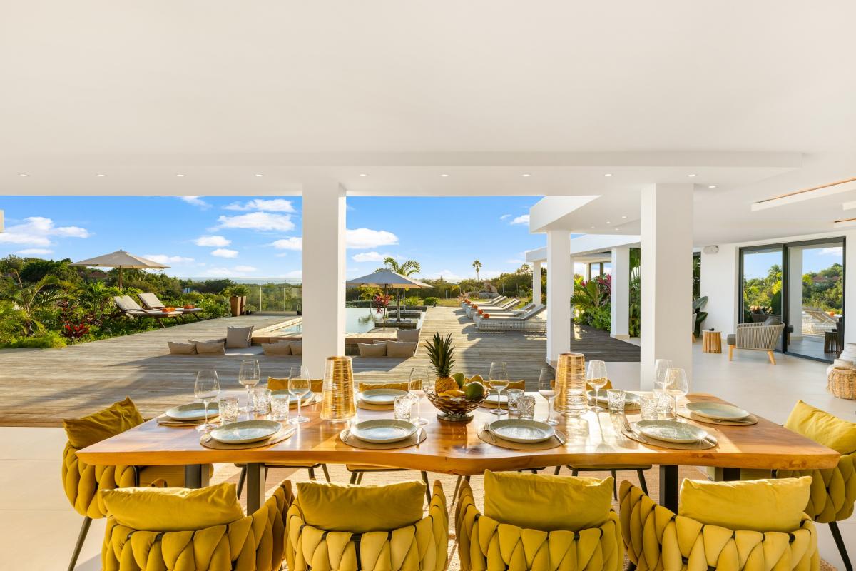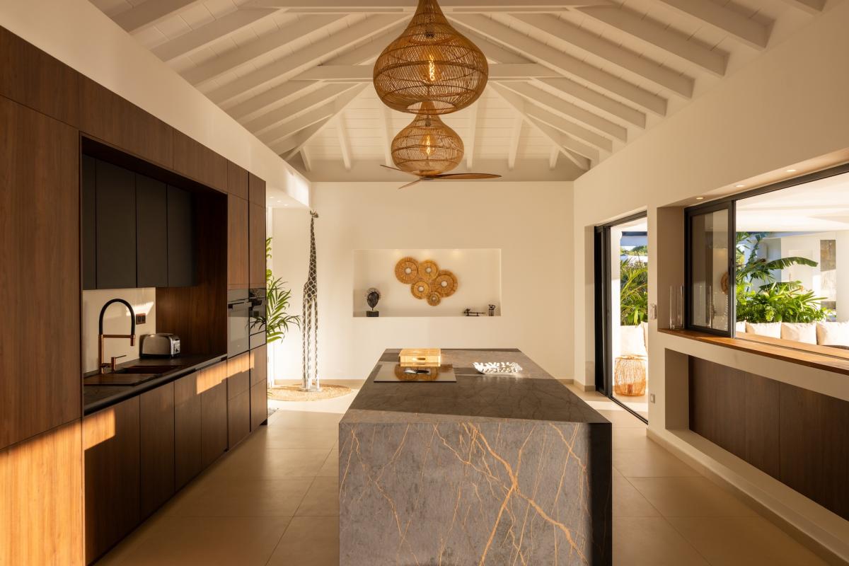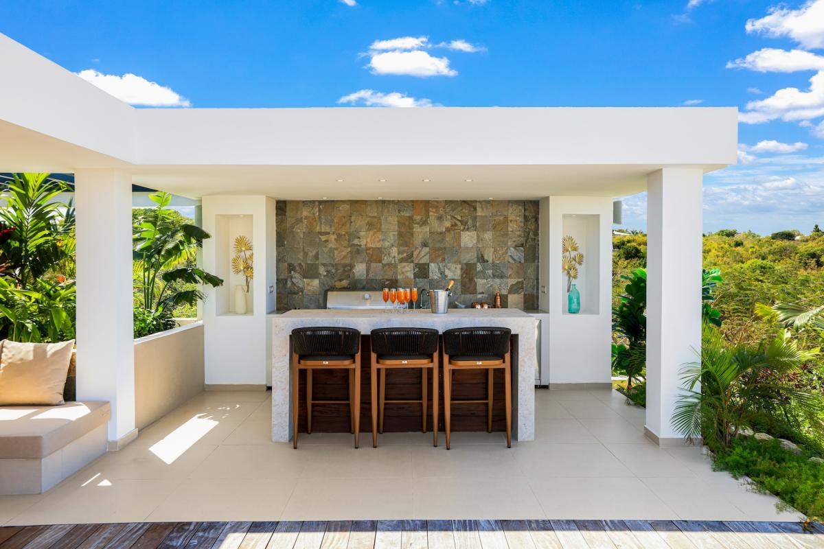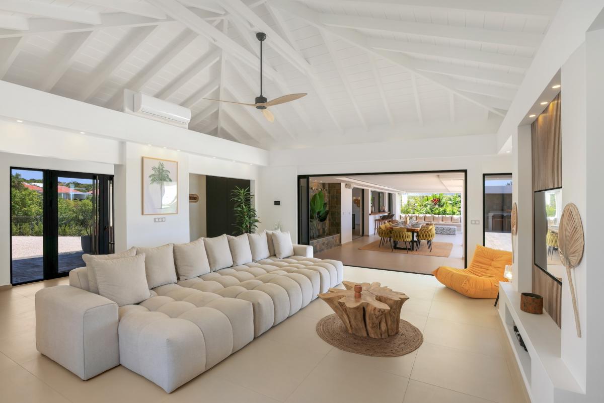 Designed with relaxation in mind, this St Martin villa boasts bright and spacious interiors, including a fully air-conditioned living area and a state-of-the-art kitchen. The expansive terrace features an outdoor bar, ideal for sunset cocktails, while the heated pool, available seasonally, is surrounded by comfortable seating and parasols. Guests can also enjoy a pétanque court for friendly games and a cozy fire pit area with plush outdoor seating, perfect for stargazing and intimate gatherings.