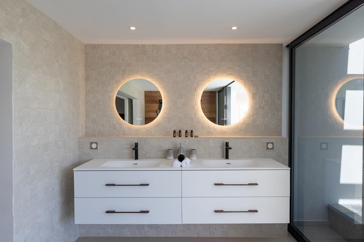 Villa Nuit Jade, nestled in the prestigious Terres Basses residence, is an exceptional five-bedroom retreat that epitomizes modern luxury and timeless elegance. Each bedroom features an en-suite bathroom, ensuring privacy and comfort for all guests. The villa's expansive terrace and heated pool offer breathtaking panoramic sea views, making it a perfect escape for those seeking tranquility and sophistication.