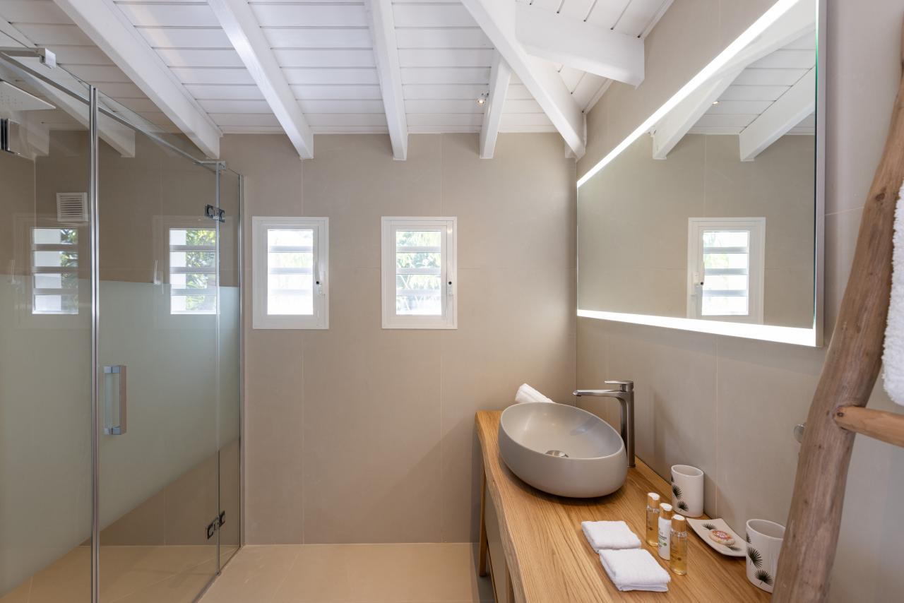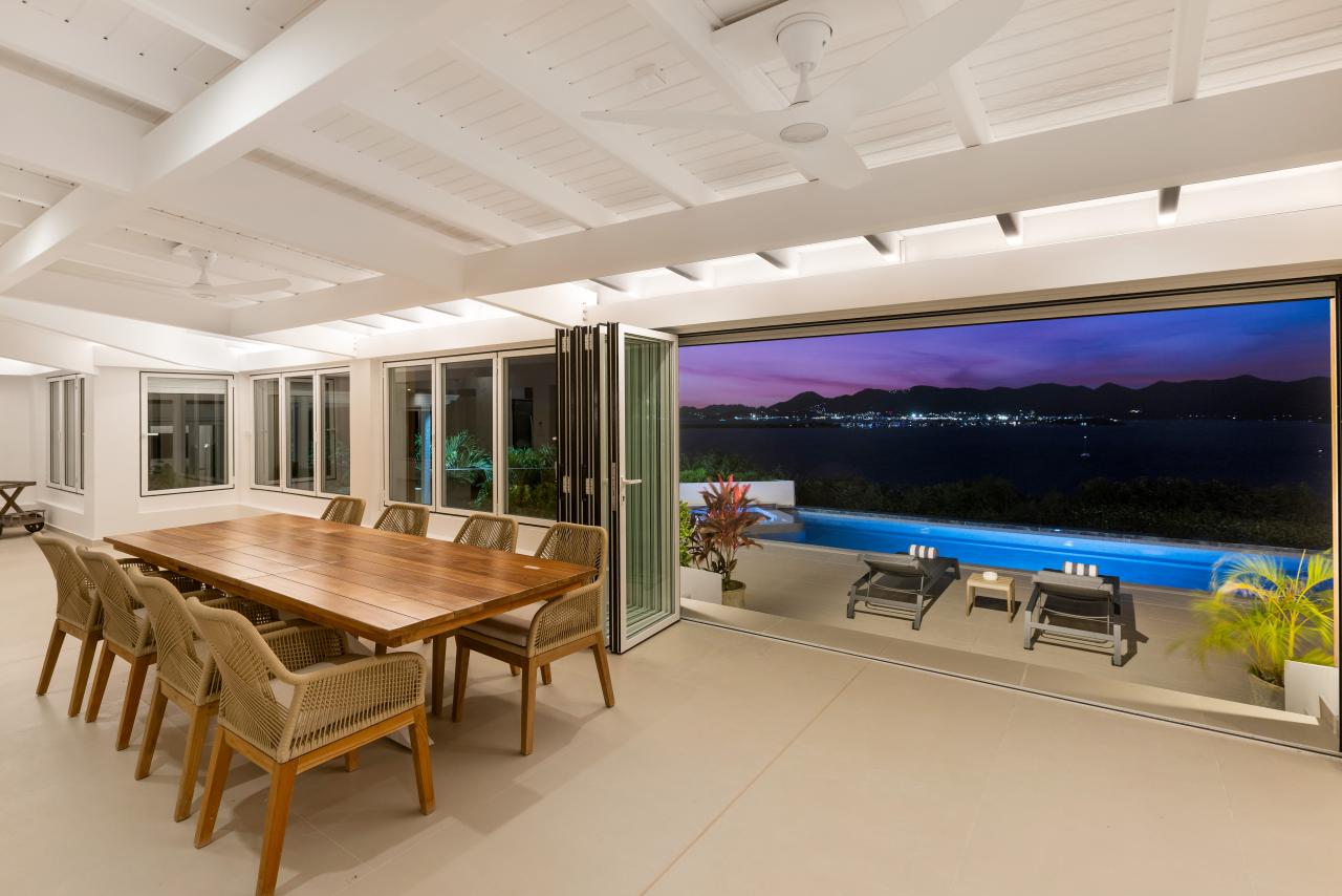 The villa's elegantly furnished terrace extends from the spacious indoor living areas, which create a seamless connection between comfort and nature. There is an outdoor swimming pool, with an inset mini pool and built-in table. It gives guests a place to relax under the Caribbean sun.