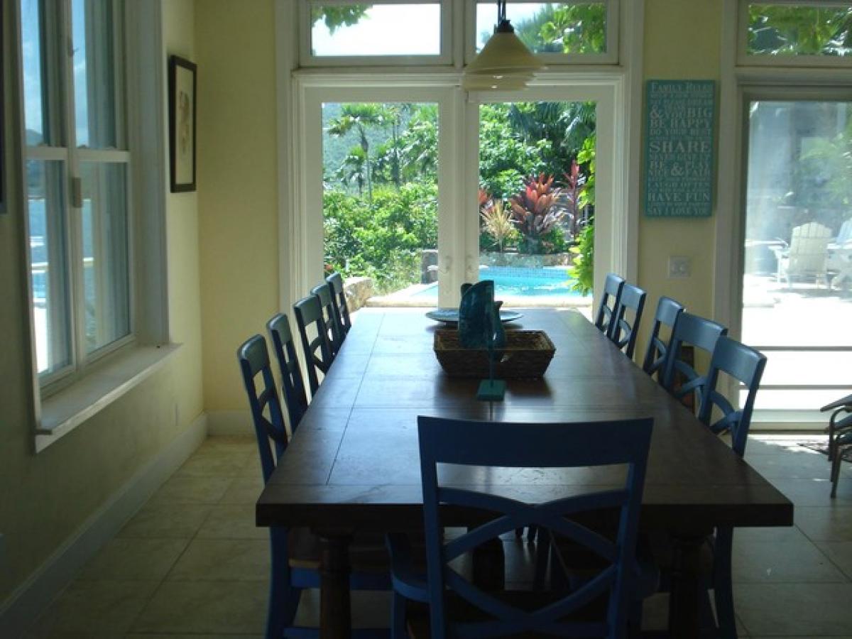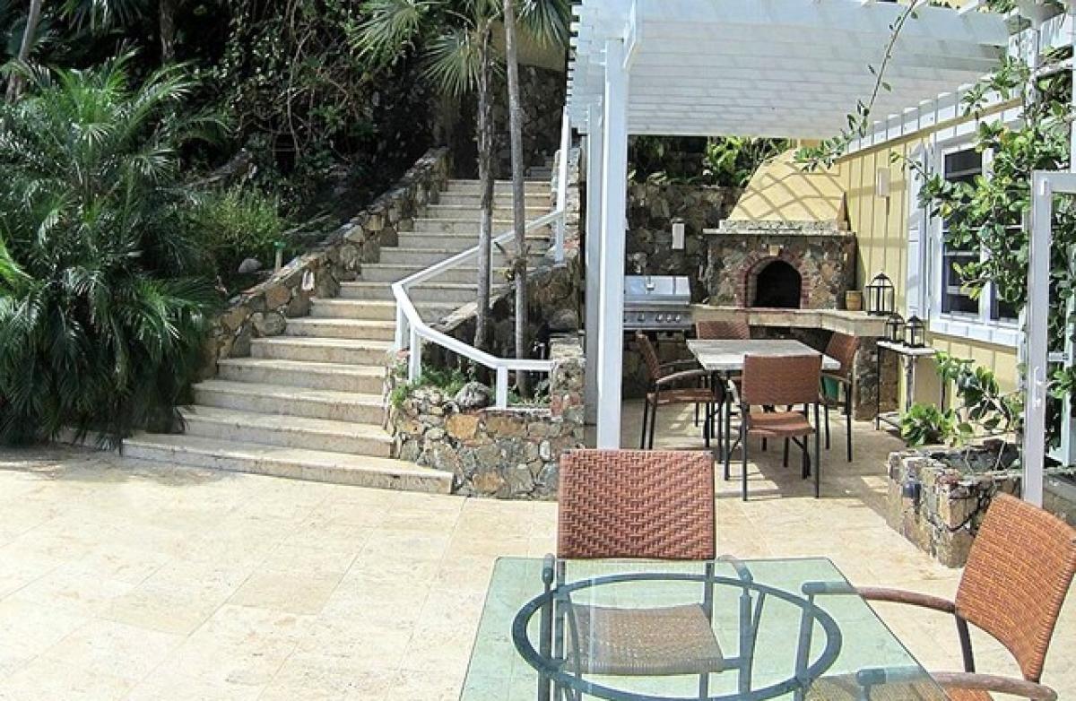 Nestled on the edge of world-renown Magen’s Bay in St. Thomas, Edge of Paradise is a unique combination of charm, luxury and privacy. This Caribbean villa rental is a seclusive, one of a kind getaway surrounded by extraordinary natural beauty. Edge of Paradise includes approximately five-hundred feet of prime ocean frontage and its own beach. The villa overlooks a pristine coral reef that flourishes in the crystal clear Caribbean waters, teeming with life. There are very few rental homes in all of the Virgin Islands that can compare as a charming and luxurious tropical retreat, with its own secluded beach and reef, and none on Magen’s Bay. All three stories of the villa have roofed decks that look out over the sparkling waters of Magen’s Bay, where the long coral reef extends to within a few feet of the shore. The reef is undisturbed and is abounding with colorful sea life. Minutes can turn into hours at Egde of Paradise when observing pelicans, sea turtles, and eagle rays. Dolphin and whale sightings have also been reported in the bay, beyond the reef. Besides the three attached porch decks, the villa has beautiful water decks which sit just above the ocean surface, connected via stairs. This provides easy access to the private beach. The most alluring spot for taking in the breathtaking views is from the large coral stone deck that spans between the villa and the cottage. The coral stone was chosen because of its beauty and its resistance to heat buildup in the sun. Within this area sits an “infinity” swimming pool which has a specially contoured bench seat that faces the Caribbean. A custom made fieldstone hot tub emanates above the coral stone next to the pool. The villa has a gourmet kitchen and an especially large farmhouse dinning table to assure a large group can comfortably share meals together. A spacious pantry attaches to the kitchen, and is equipped with useful cooking appliances and tools. Two large refrigerators allow guests the opportunity to stock up on food and drink supplies for their entire stay with one trip to the grocery store. Alternatively, guests can have the refrigerators filled with their choice of supplies prior to arrival, for a small concierge fee. Either way, the intent is to allow our guest families to spend the most time relaxing, recreating and recharging, and the least time driving about. The great room in Edge of Paradise has a panoramic view of the ocean and multiple french doors that allow inside and outside to mesh smoothly. A collection of DVDs and Netflix are available for indoor entertainment on the large flatscreen tv. An Ipod dock allows guests to play music over the sound system. Wifi is available and cellphone reception is good for all carriers guests have used (ATT, Virgin Mobile, and Verizon). Just outside the kitchen is a charming outdoor kitchen which sits beneath a trellised pergola. This secondary kitchen includes a coral stone dining table, a stainless propane grill and a spectacular and versatile pizza oven. Made of native island fieldstone, this oven is powered by either firewood or propane. In this St. Thomas villa rental, accomodations are as follows: