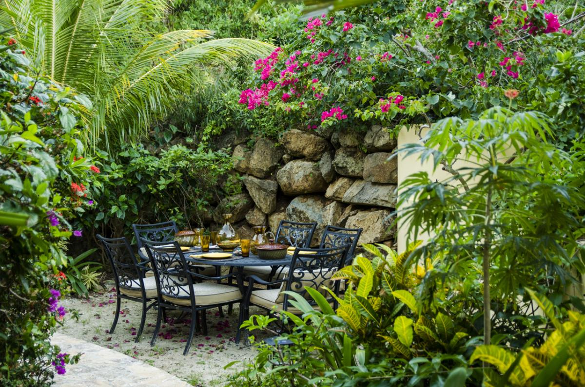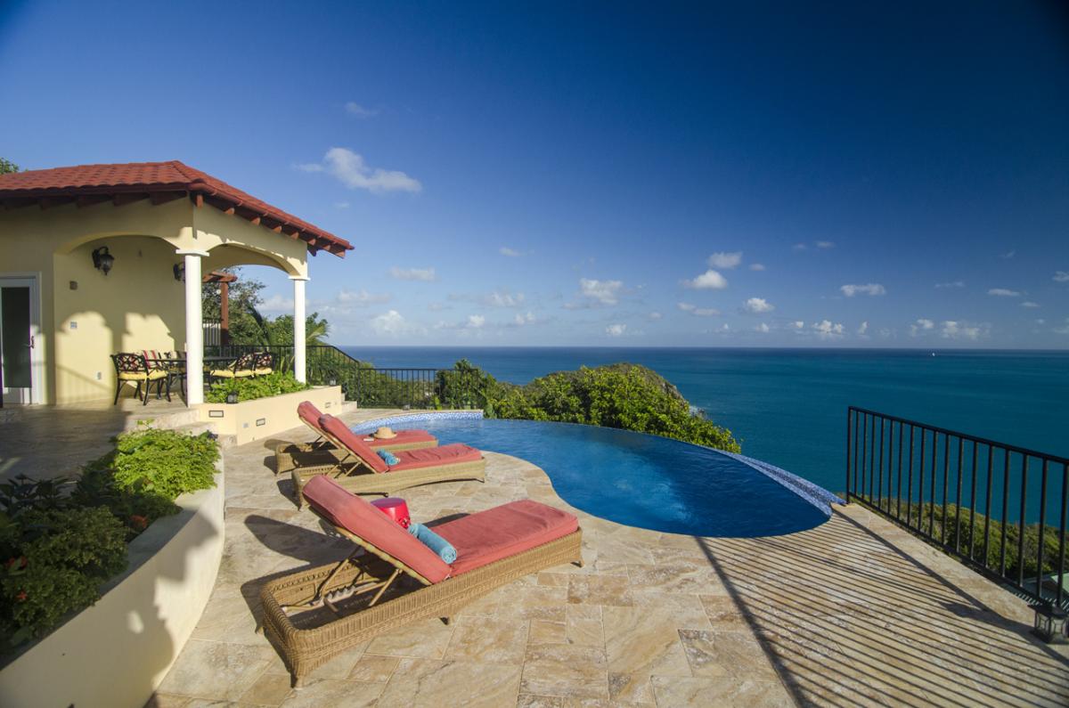 Anacapri Estate offers Italian-style architecture and one of the most beautiful panoramic views in the Caribbean. The 5000+ sq. foot estate includes 4 bedrooms (plus a queen size Murphy bed in the Office), 4.5 bathrooms, two-tiered pool deck with Infinity Pool, Gazebo, multiple covered and open porches, and a special “Place in the Rocks” patio. The Estate combines old world charm with modern conveniences of Internet access throughout, home theatre, and music sound system. Perched high on the hill in Cooten Bay, Anacapri Estate gets the most wonderful Caribbean breezes which provide for comfort and relaxation in this natural quiet setting.