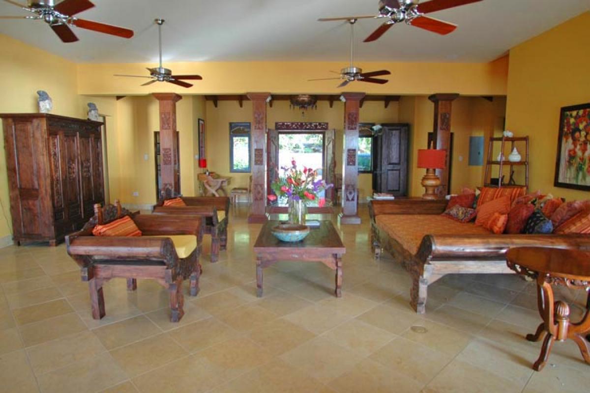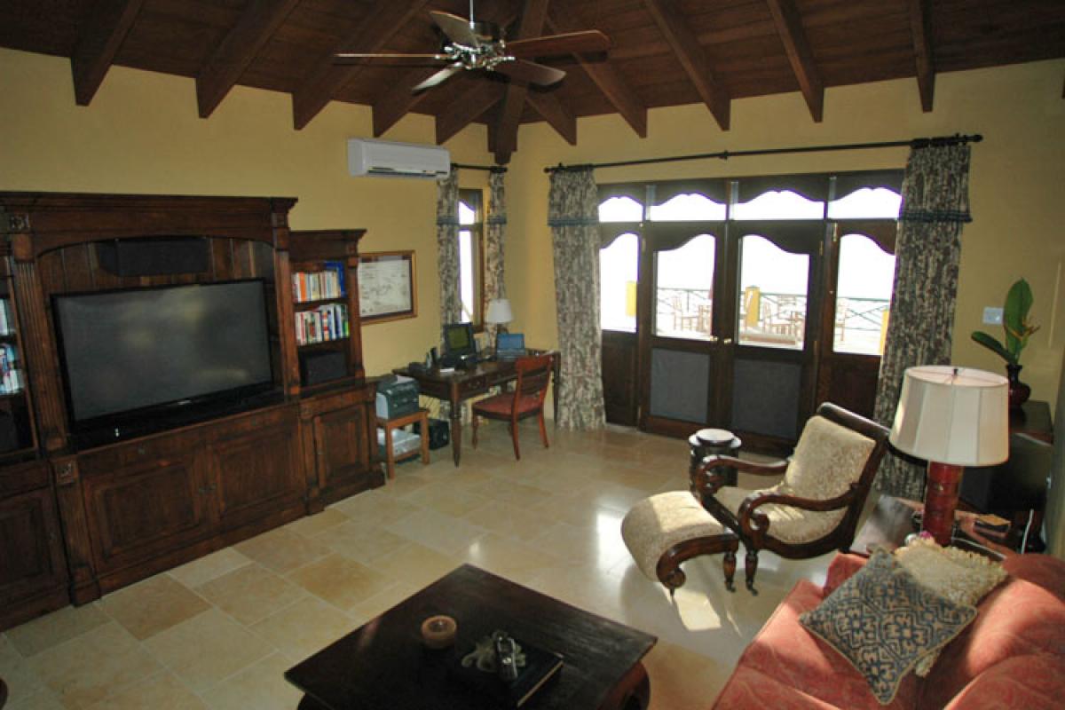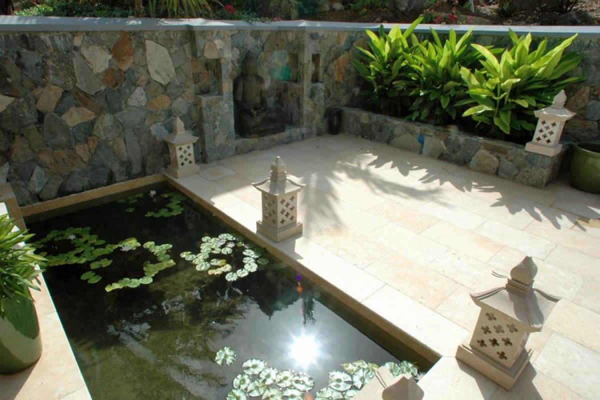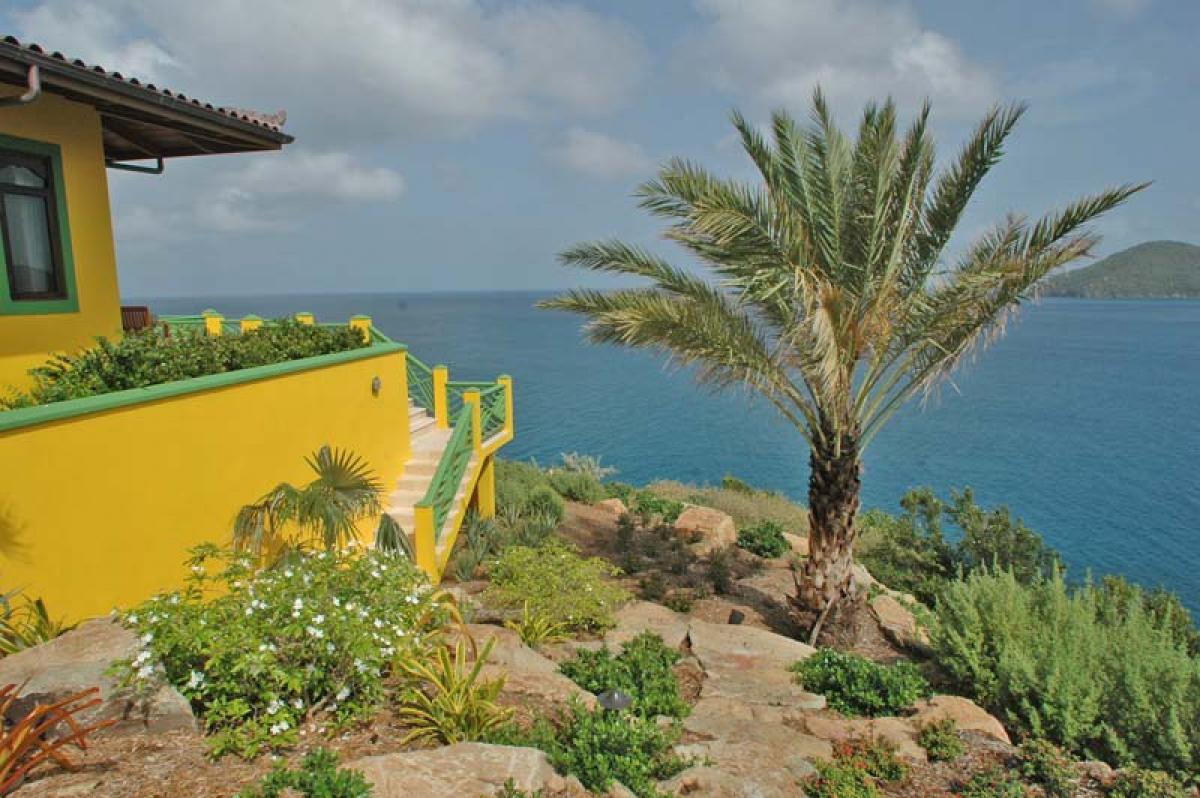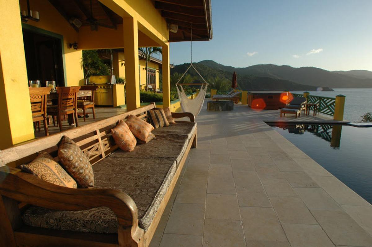 Golden Pavilion Villa is a unique property, unparalleled in Tortola. The villa presents zen tranquility and privacy, juxtaposed with modernity and meticulous details. Walking gardens, paths leading to sunken stone retreats, and sitting areas are nestled under mature plantings at cliff’s edge. Tropical birds ride warm breezes up the cliff to sip from the infinity pool. Turtles, rays, and the occasional whale can be seen from the deck. Breathtaking views complement the highest building standards with imported granites, marbles, fittings, appliances, and furnishings; Golden Pavilion Villa comforts the eye and soothes the soul. Privately situated on four gated acres, this brand new 5000 square foot, Balinese inspired villa with four bedrooms, a one bedroom guest cottage, and four and a half baths, features stunning 180 degree ocean views, a heated infinity pool, a hot tub, an outdoor gas fire pit, a second floor gallery with wet bar and pool table, a media room with a large flat screen TV and surround sound, an office with fax/pc/wireless internet, a fully equipped gym, air conditioning in all primary rooms, and a private chef. Traditional Indonesian sculptures, art, and furnishings fill the public spaces and the villa is decorated with a refined, distinctly British-Colonial flair. All bedrooms are elegantly appointed with imported four poster beds, exotic fabrics, and heavy black out draperies. Boating excursions on our 29’ fishing/ski boat, and spa services are also available. The centerpiece and one of the defining features of Golden Pavilion Villa is the heated infinity pool. Majestically centered on the ocean facing deck, with views east, north, and west, the 20 x 40’ pool will be your daily focus. Overlooking the pool and the views beyond, is the 16’ carved Balinese dining table with seating for 10. Additional cocktail seating for 8 is available poolside for breakfast, afternoon tea, or after dinner drinks. Located on the east end of Tortola, Golden Pavilion Villa is a 7 minute walk from secluded Little Bay Beach and a 15 minute drive to Road Town. Direct ocean access is available from the property for the adventuresome.