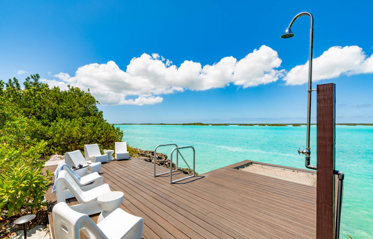 Outdoors, the villa’s design makes the most of its breathtaking location. Guests can unwind in a lagoon-front cabana, soak up the sun on the lounging deck, sway in hammocks, or gather around the firepit for stargazing at night. For those seeking adventure, this Turks and Caicos villa rental also provides complimentary kayaks and paddleboards to explore the turquoise waters, nearby islands, and secluded coves. Above Rocks offers the ideal balance of relaxation, comfort, and island exploration.