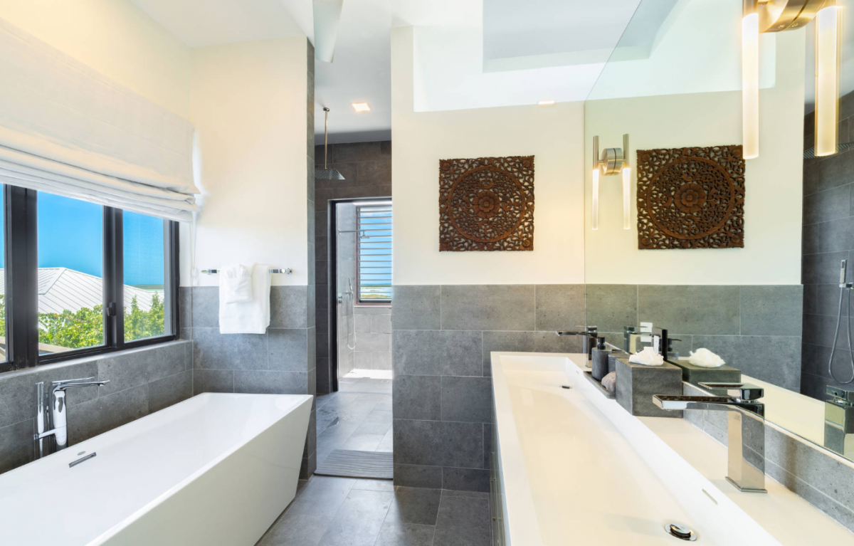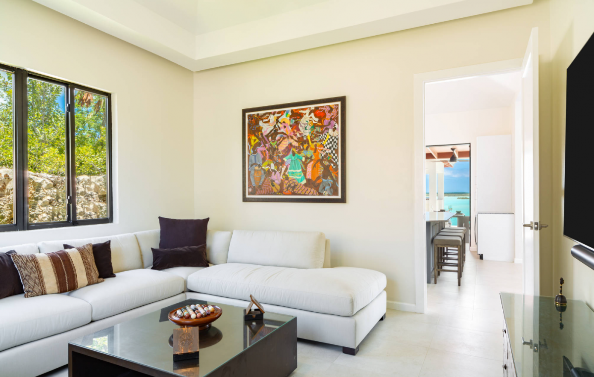 Above Rocks is a stunning Turks and Caicos villa set on the serene shores of Chalk Sound Lagoon in Providenciales. This modern four-bedroom retreat blends contemporary elegance with the island’s natural beauty, offering a perfect setting for a Turks and Caicos vacation. The main house includes two spacious bedrooms, while a separate guest house provides two additional bedrooms, ensuring both togetherness and privacy for families or groups. Each bedroom comes with its own en-suite bathroom, creating a comfortable and luxurious stay.