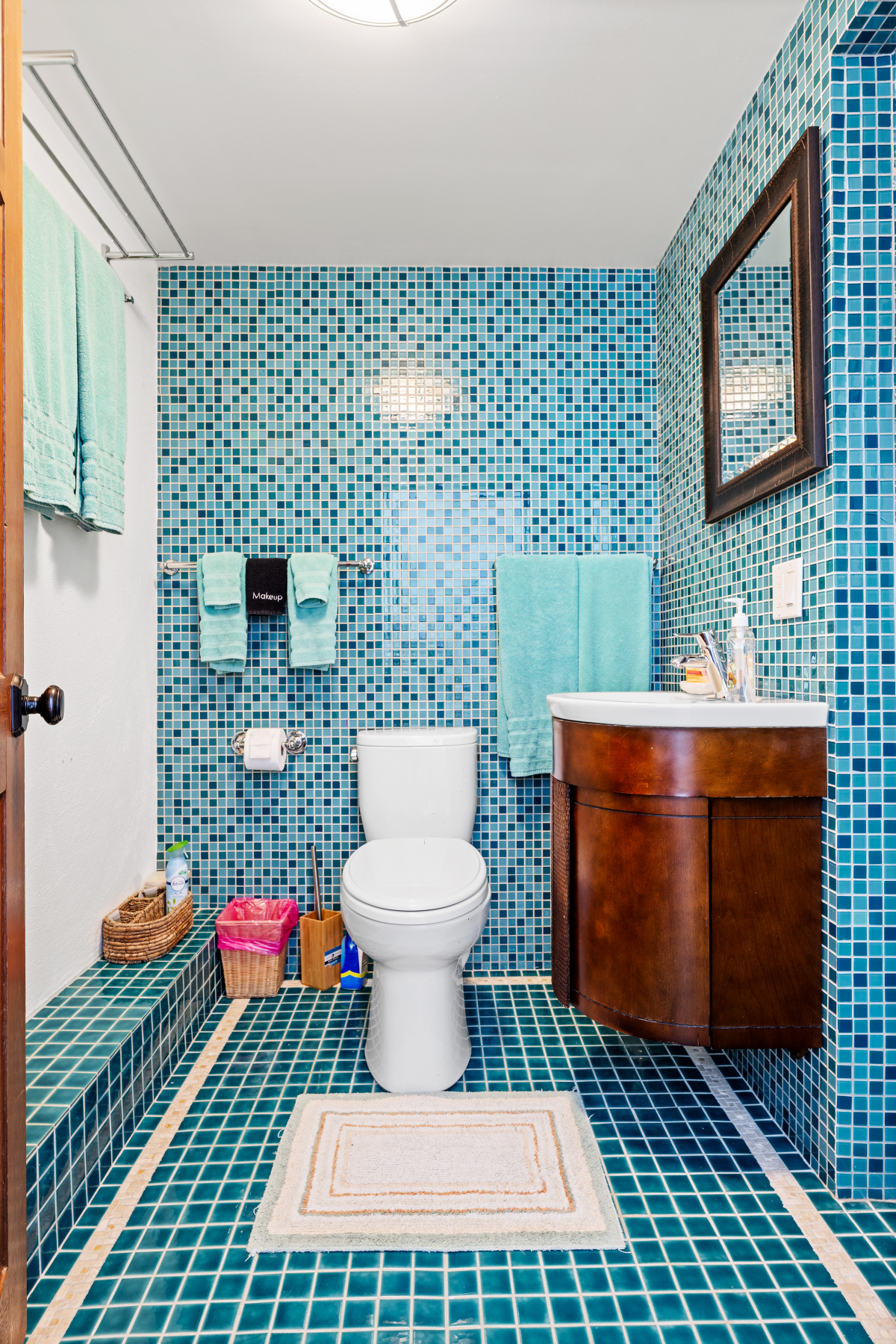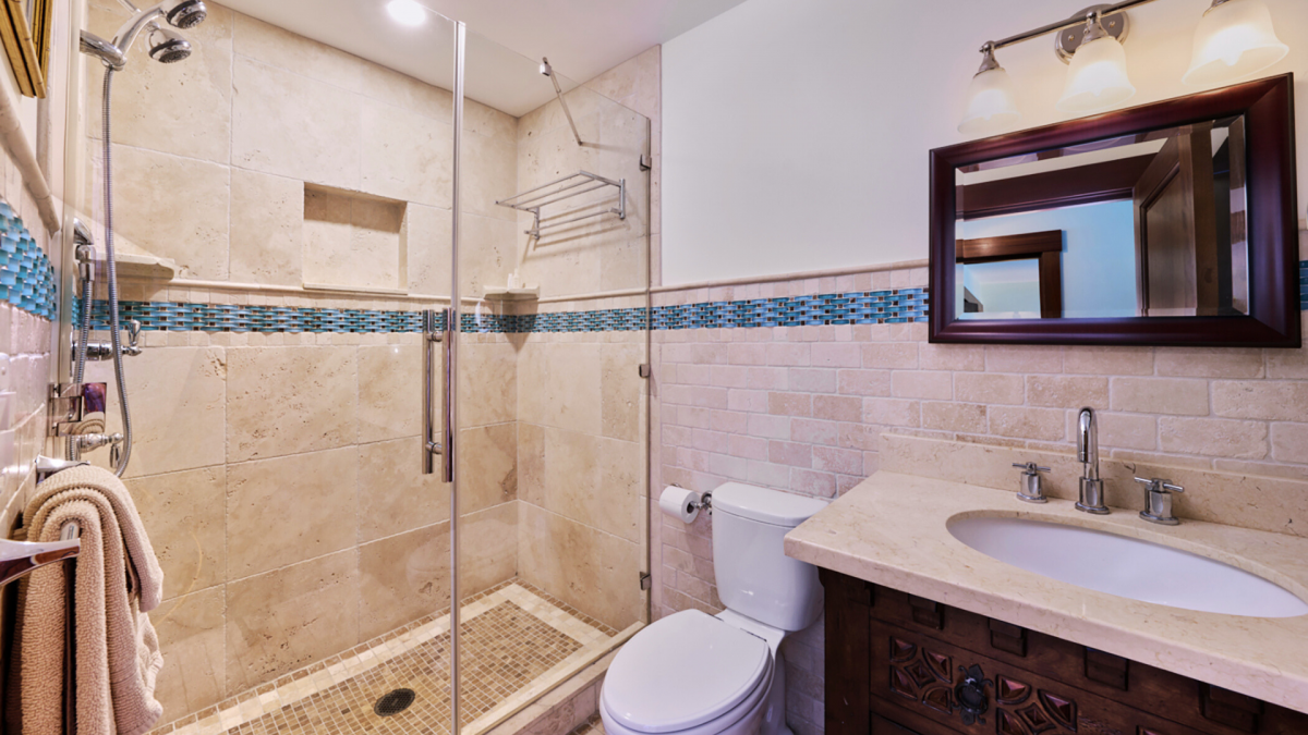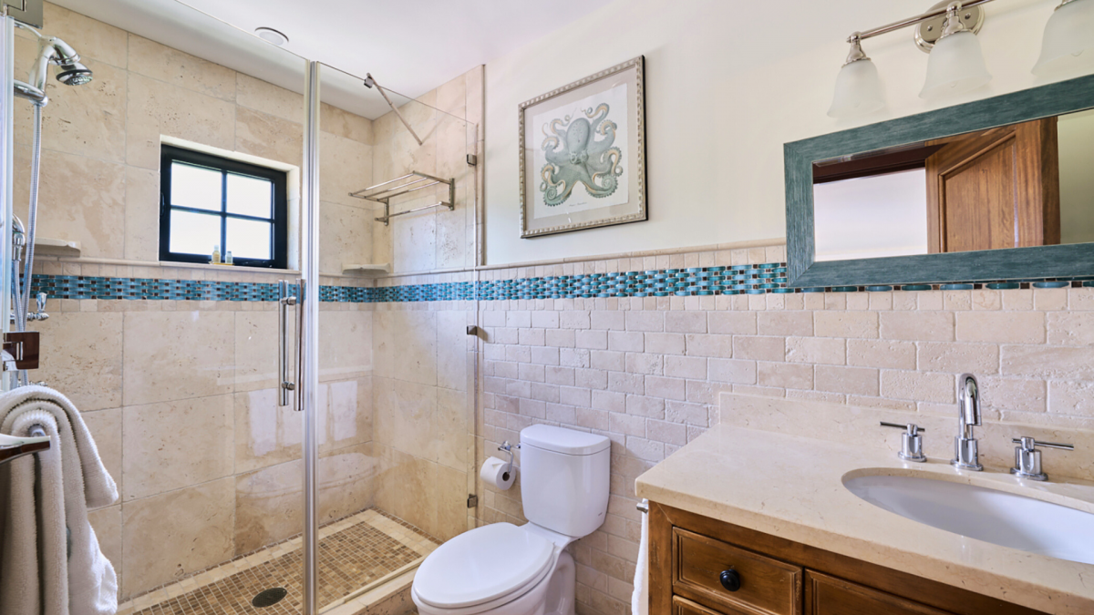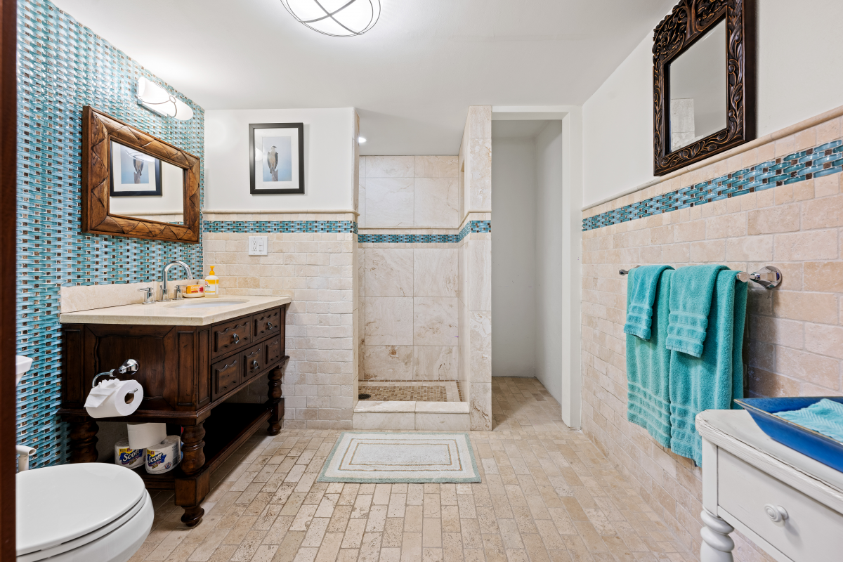 • Main Suite: King bed, walk-in closet, private ensuite bathroom, ocean + pool views