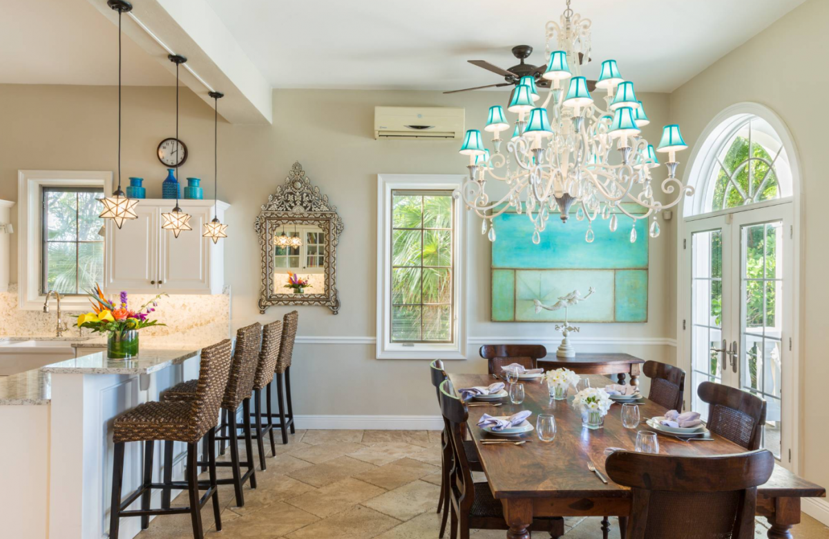 Rejuvenate in Caribbean classical grandeur at an elegant three-story beachfront estate on Grace Bay Beach. Grace Bay is voted “World’s Top Beach” year after year. Everyone is happy with room selection at Beach Villa Paprika, because the 5 spacious bedroom suites are equal in size. Each master suite has a beautiful water view, a private patio/balcony with outdoor furniture, and an en-suite bathroom. Villa Paprika sleeps 12 people comfortably with 7 king beds. There are 5 full baths and 2 half baths. The covered, poolside dining table comfortably seats 12 to 14 people and is perfect for large groups and special celebrations. The indoor table seats 10. Enjoy the outdoor grill and fully-equipped gourmet kitchen, or hire a villa chef or catering service to prepare memorable dining experiences.