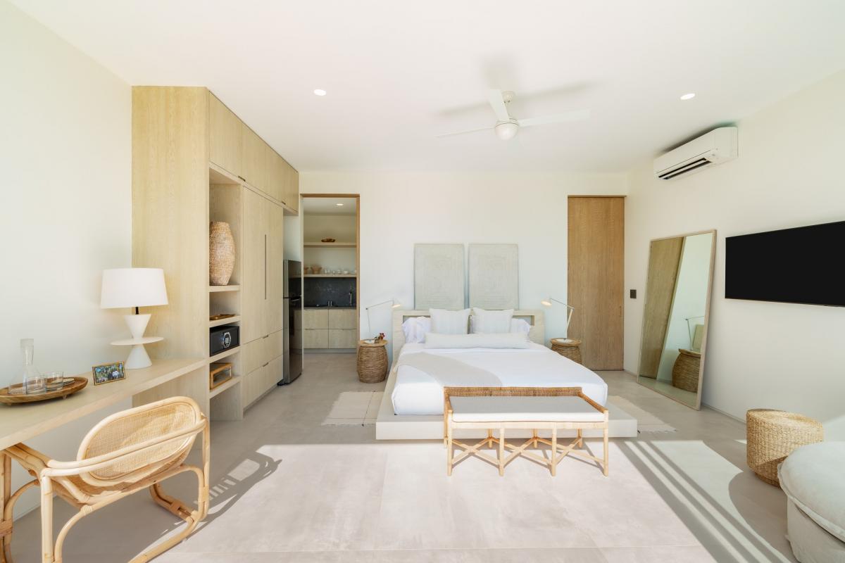 Casita 1: This room has a king-sized bed, an open-concept closet with a safe, a TV, and an ensuite bathroom with a double sink.