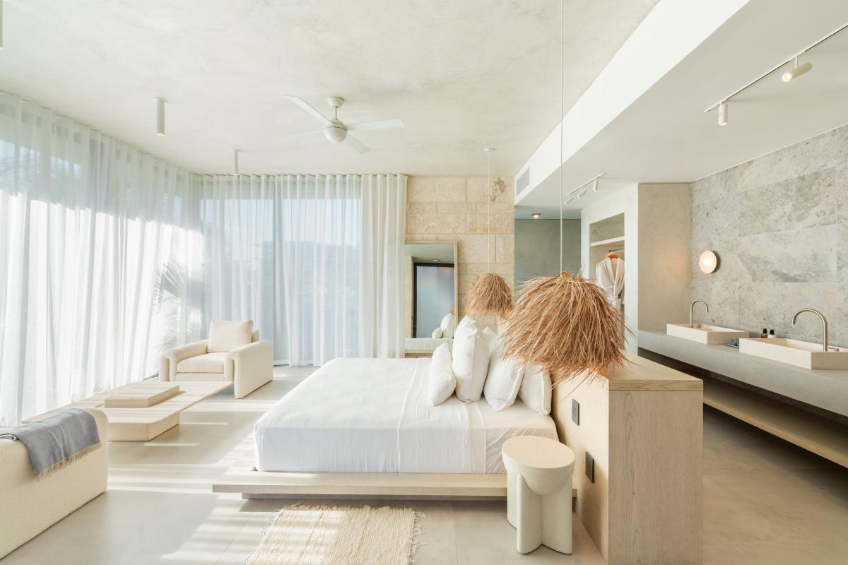 Main House: The main house has three bedrooms upstairs; all rooms have king-sized beds, a balcony, a TV, an open-concept closet with a safe, and an ensuite bathroom with double sinks.