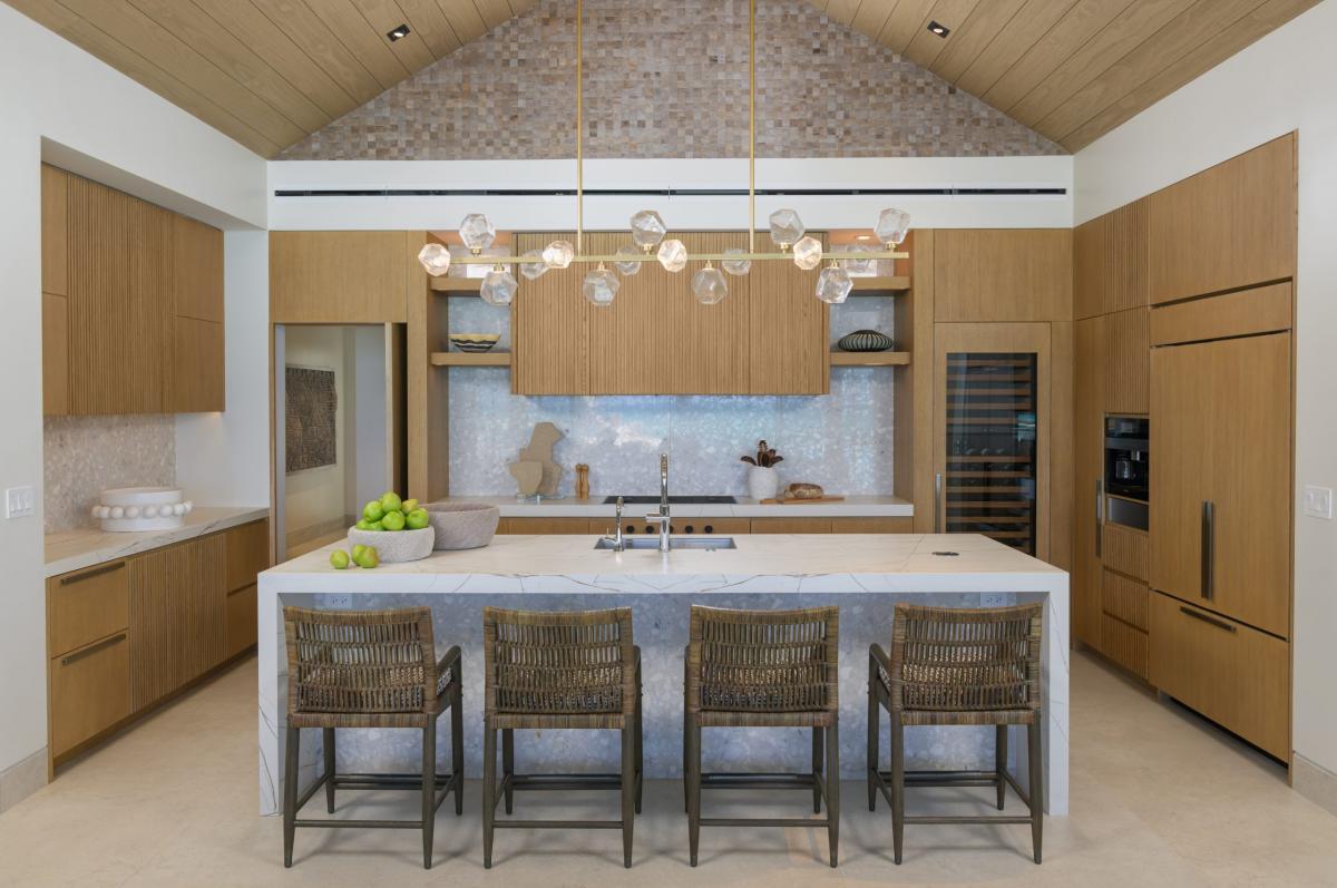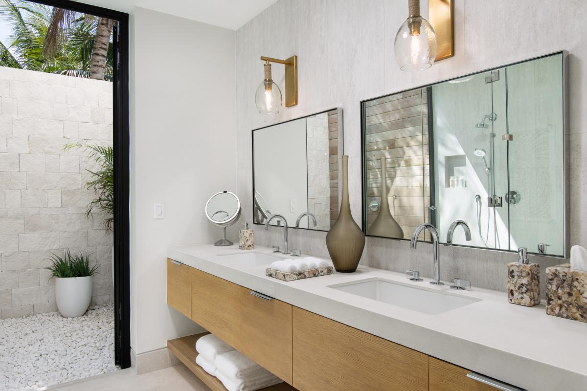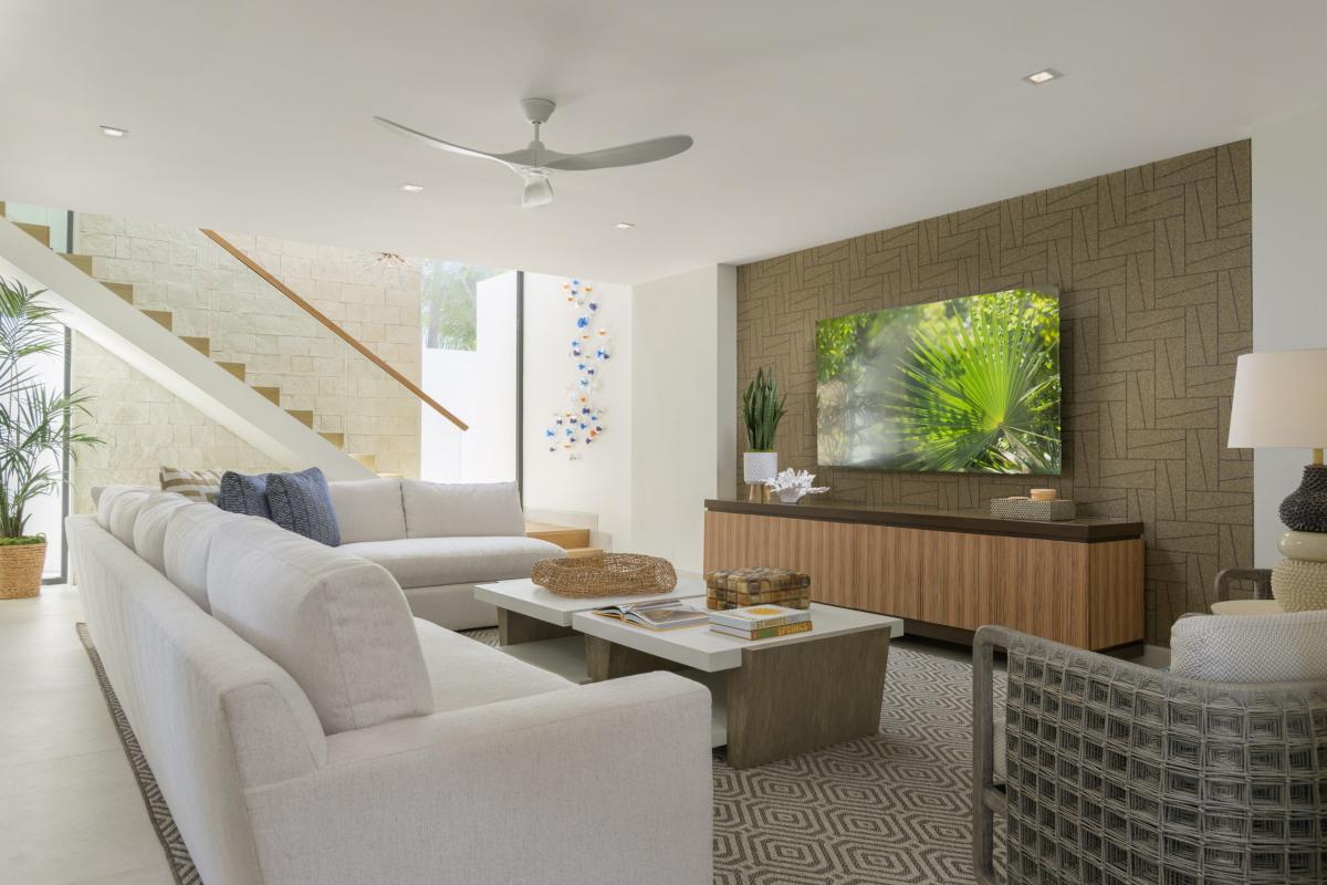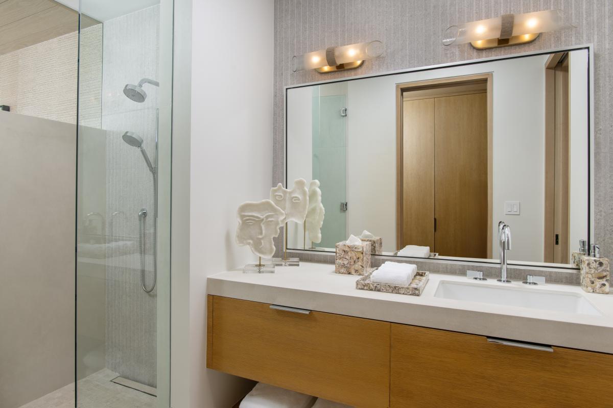 Just steps above the white sands, the expansive terrace is the heart of outdoor living, centered around an oversized infinity-edge pool with a tanning ledge, hot tub, and daybeds perfect for lounging under the Caribbean sun. Guests can dine alfresco, unwind by the firepit, or enjoy evening games on the floodlit pickleball and half-basketball court. Despite its proximity to the beach, the property offers a feeling of complete seclusion, enhanced by thoughtful design that maximizes both comfort and style.
