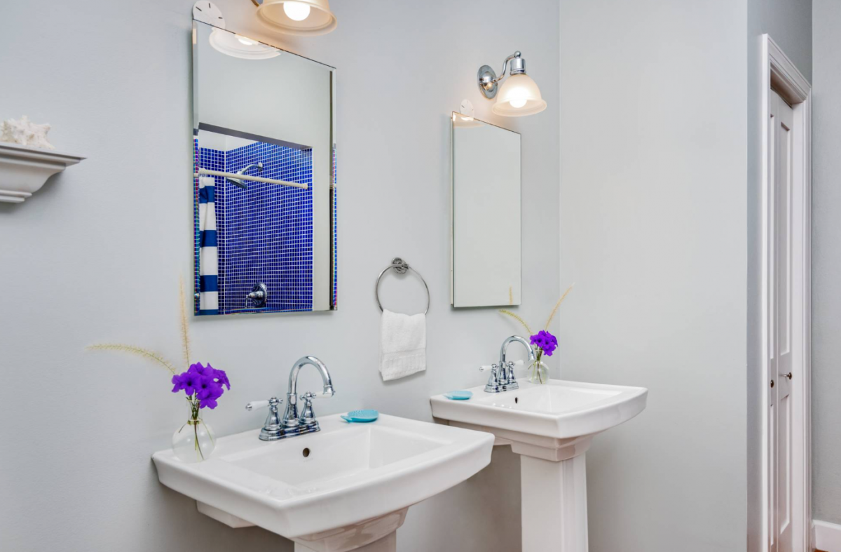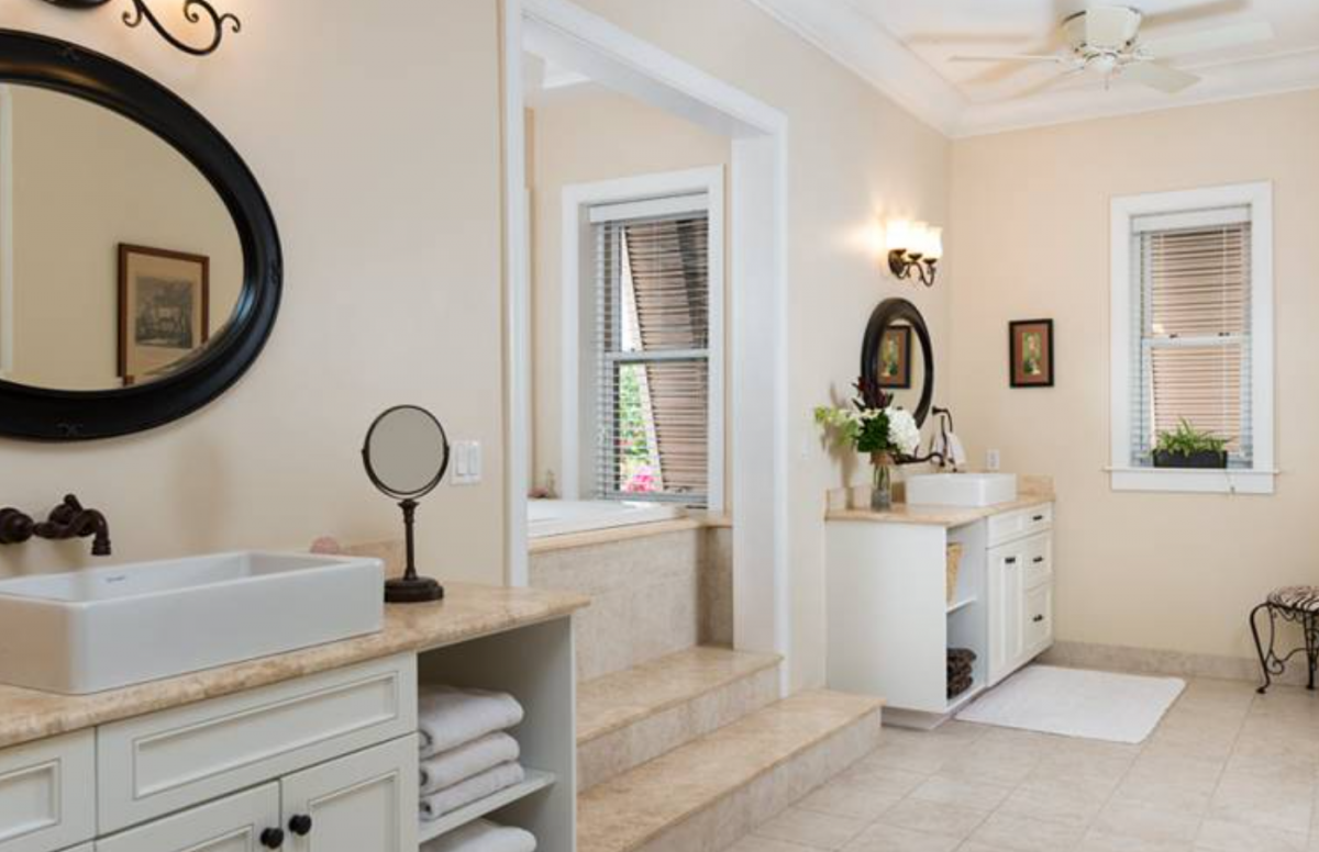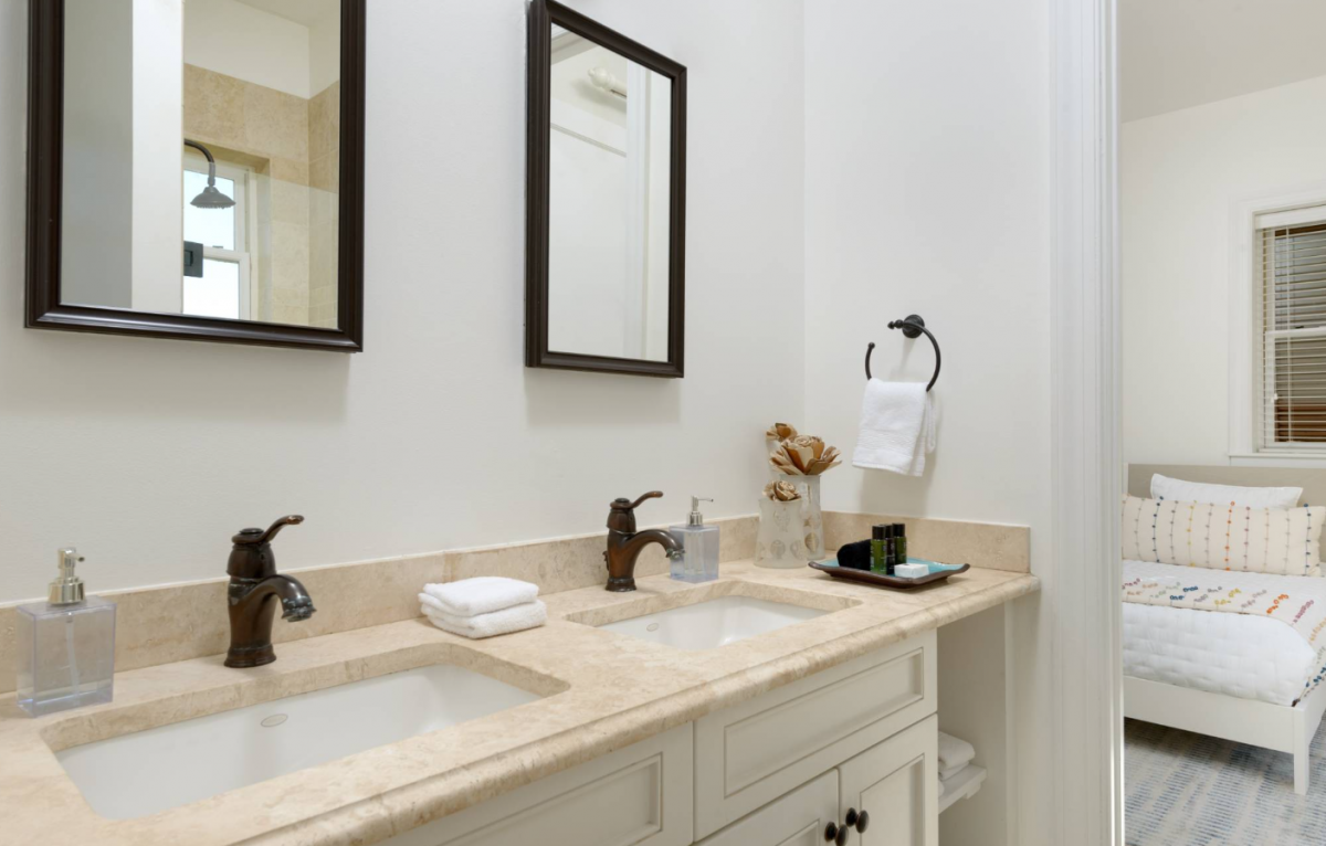 - Bedroom 4: King bed (can be converted into two twin beds), shared bathroom with stand-alone shower, dual vanity, TV, ceiling fan