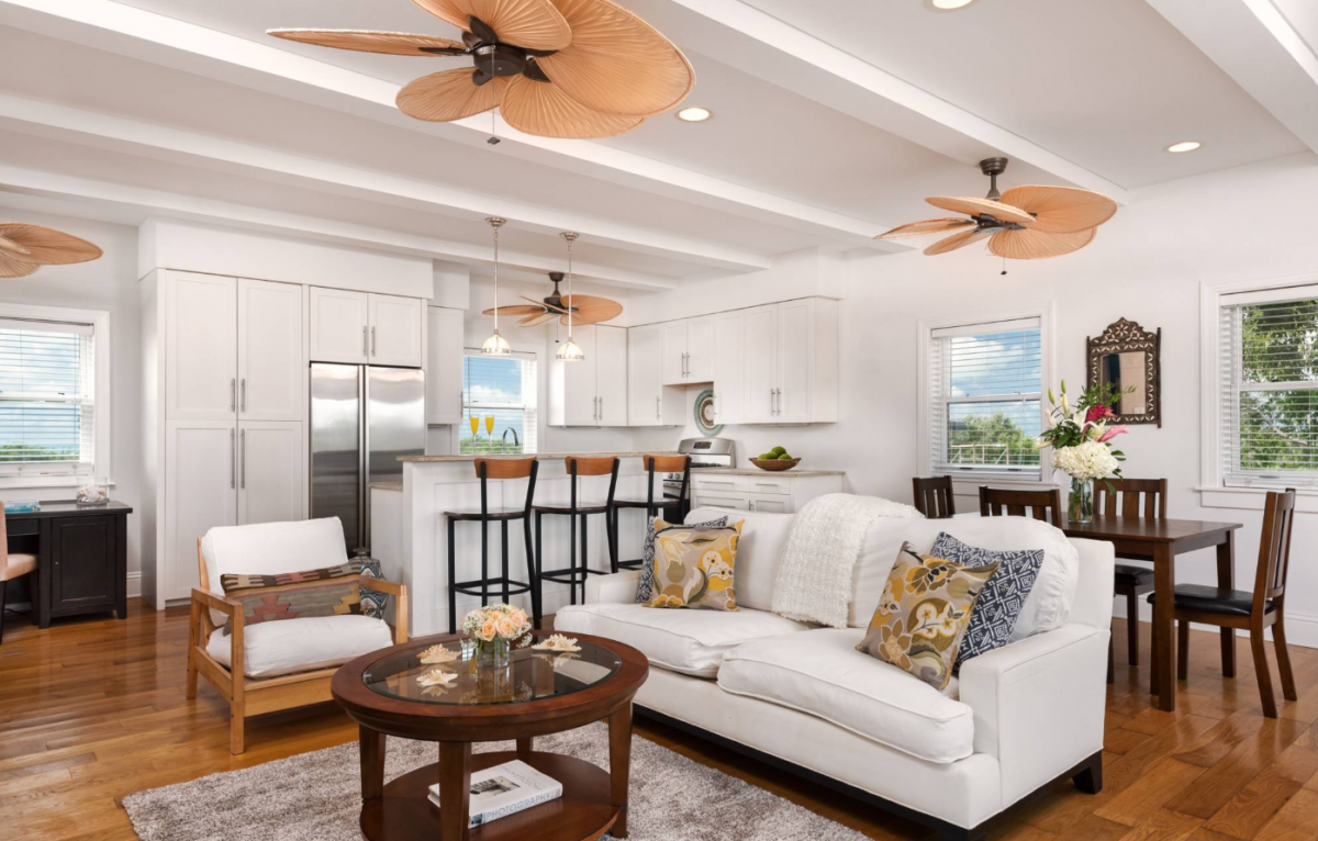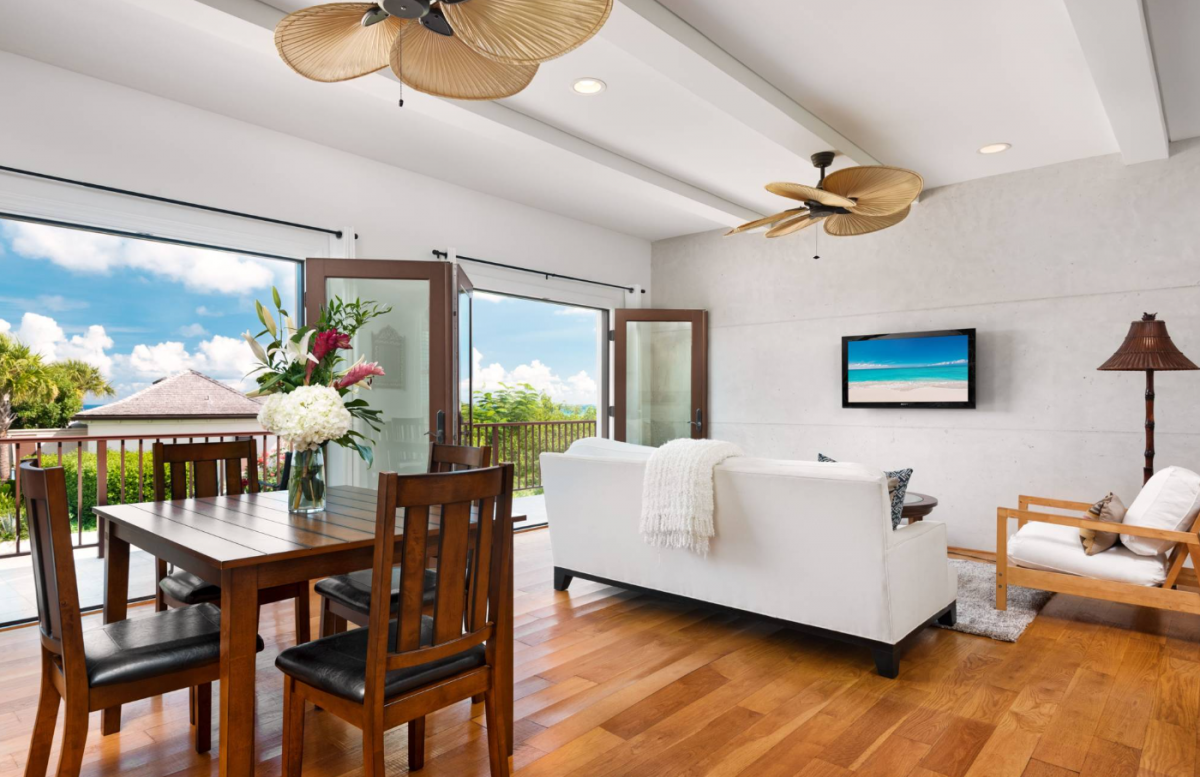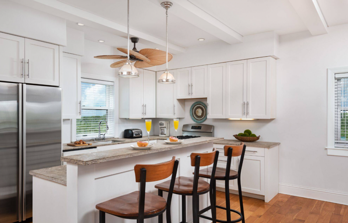- Bedroom 2: King bed, en suite bathroom with stand-alone shower, TV, ceiling fan