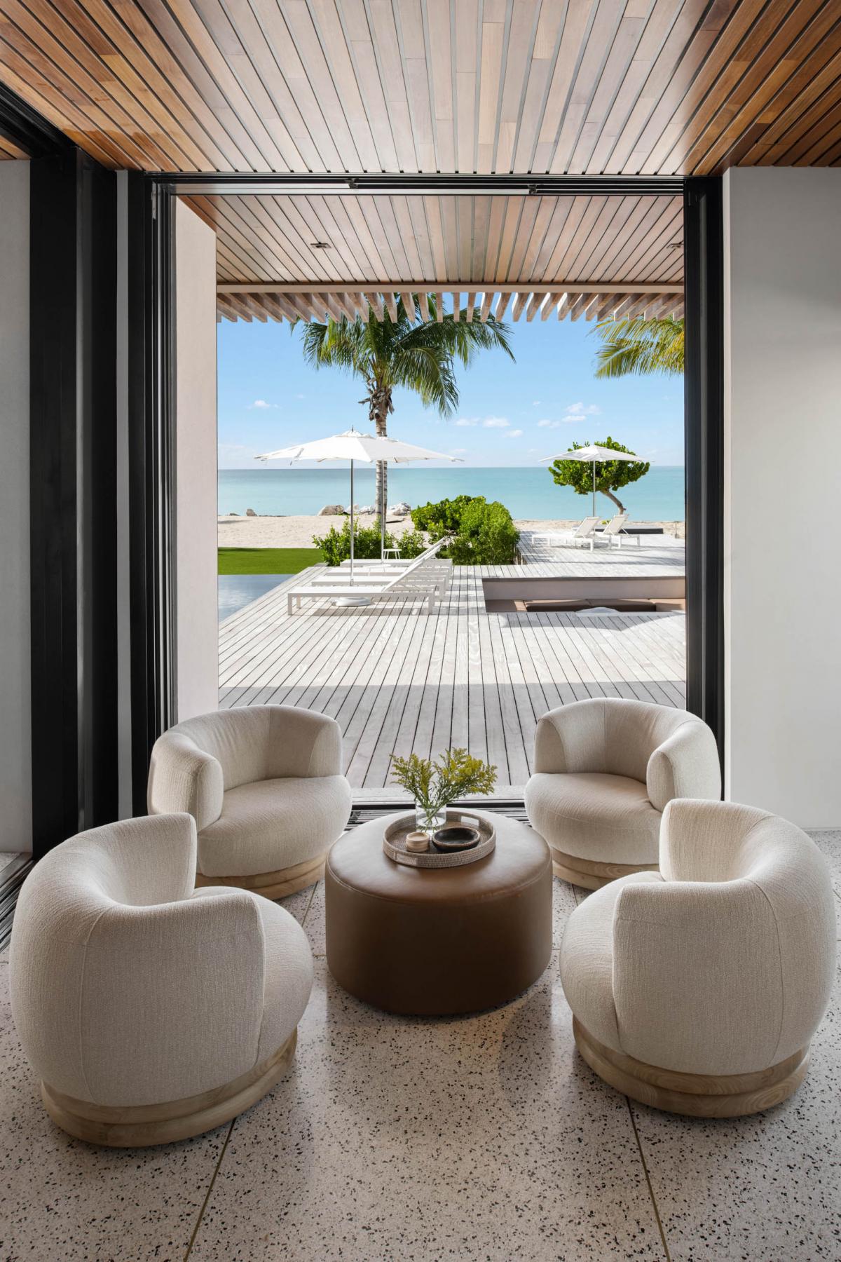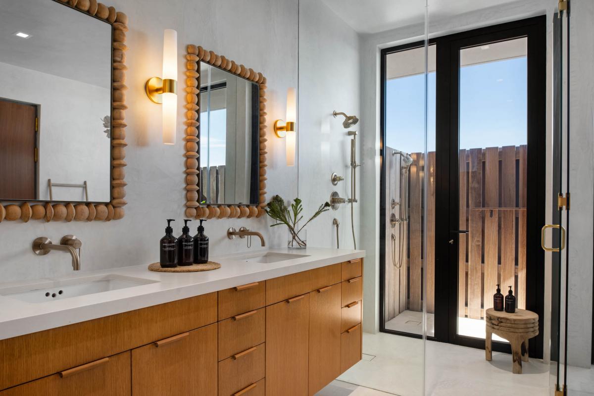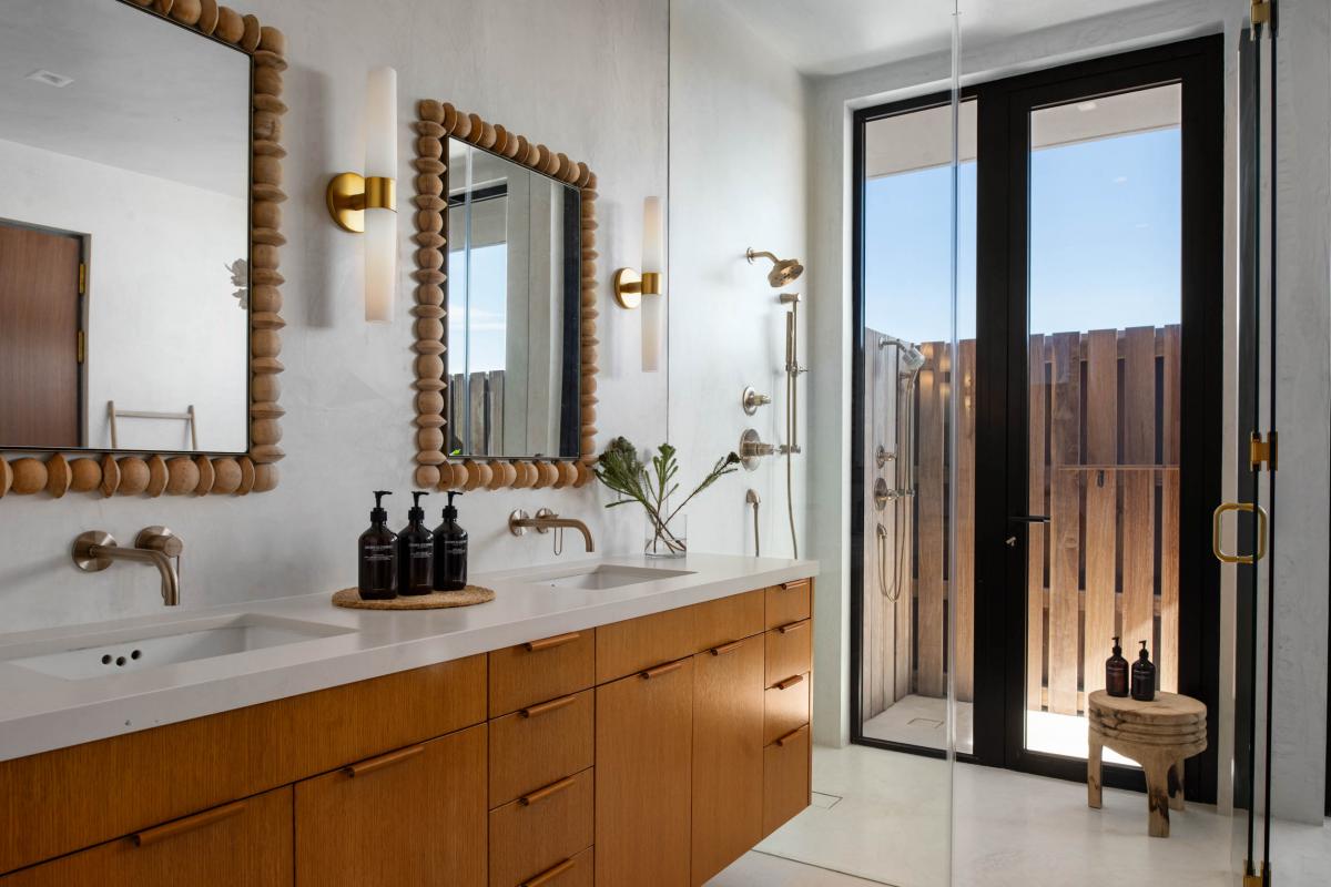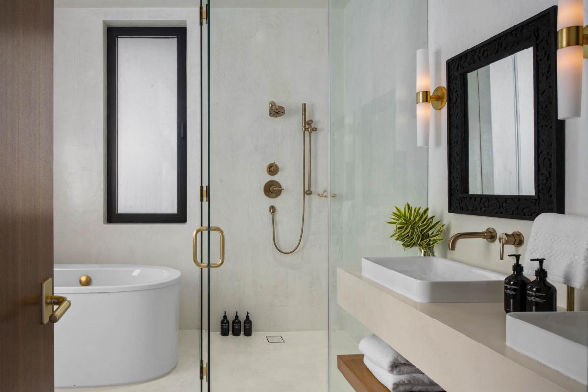 The six bedrooms and elegant ensuite bathrooms feature brass touches and beautiful hardwood floors, adding a touch of luxury and sophistication to each private space. The attention to detail in the design of the bedrooms is a commitment to providing guests with a high level of comfort and style. The luxurious primary suite, complete with indoor and outdoor showers as well as a circular tub, adds an extra layer of indulgence. This suite provides a retreat within a retreat, allowing guests to pamper themselves in a serene and stylish environment.