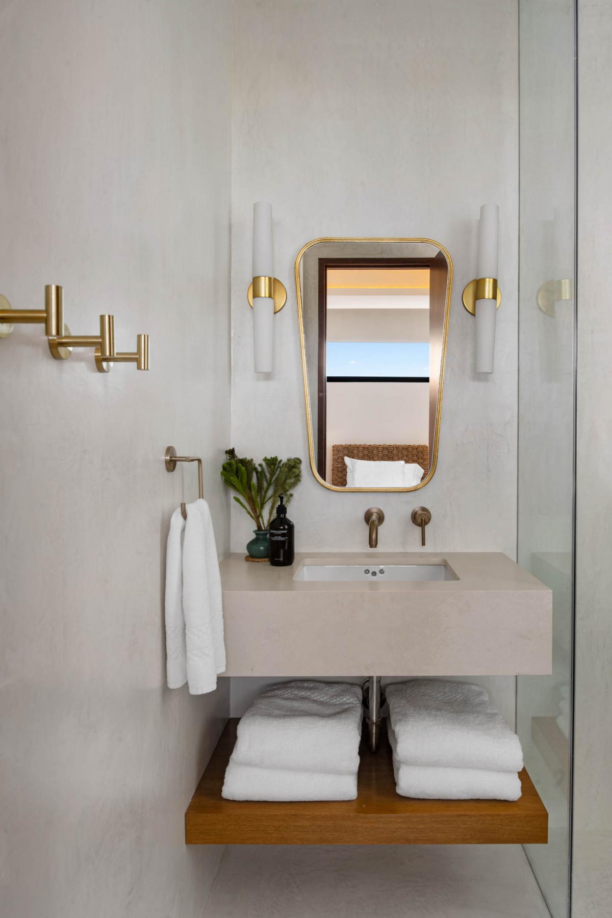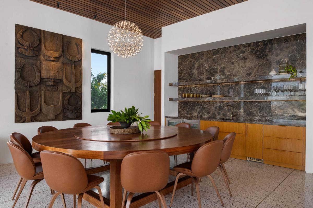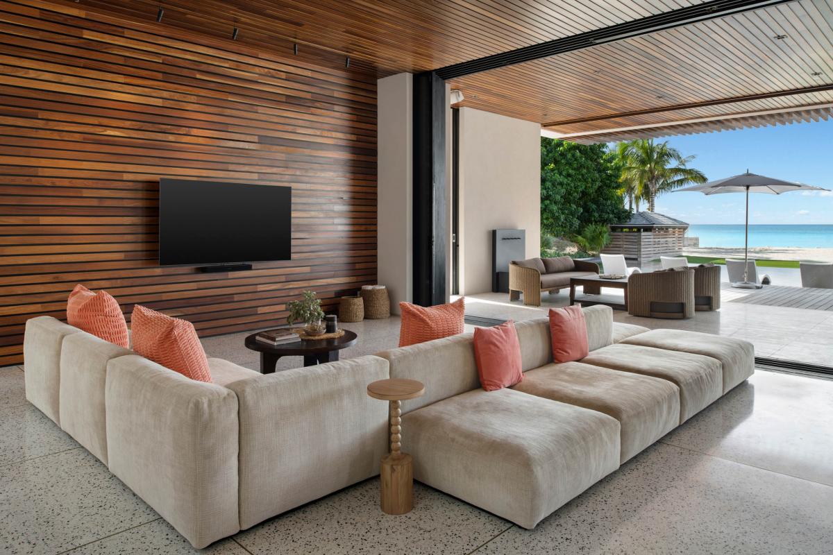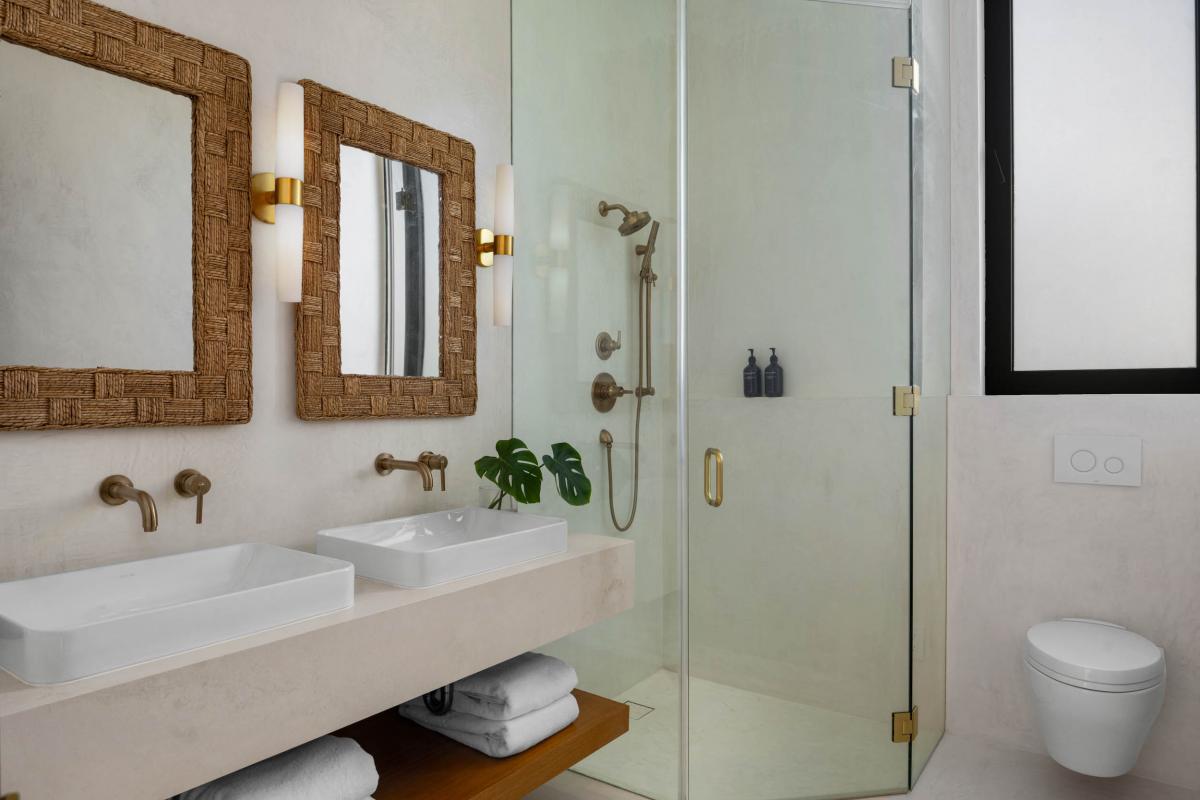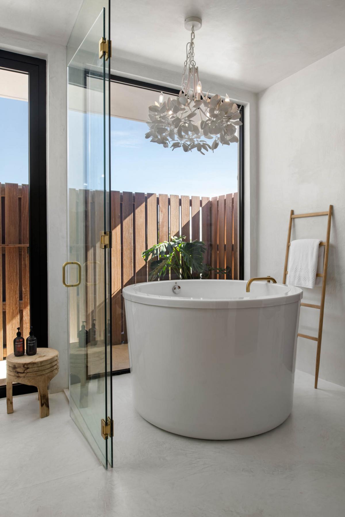 The six bedrooms and elegant ensuite bathrooms feature brass touches and beautiful hardwood floors, adding a touch of luxury and sophistication to each private space. The attention to detail in the design of the bedrooms is a commitment to providing guests with a high level of comfort and style. The luxurious primary suite, complete with indoor and outdoor showers as well as a circular tub, adds an extra layer of indulgence. This suite provides a retreat within a retreat, allowing guests to pamper themselves in a serene and stylish environment.