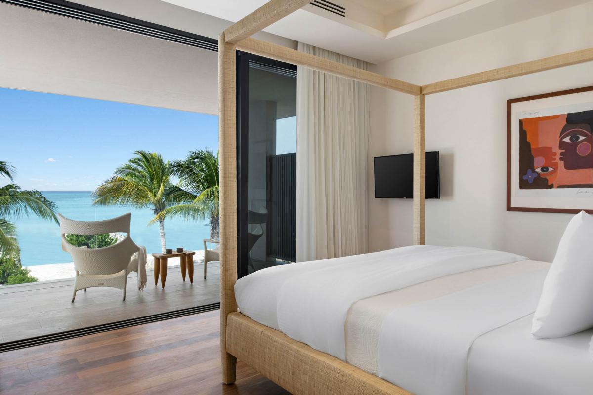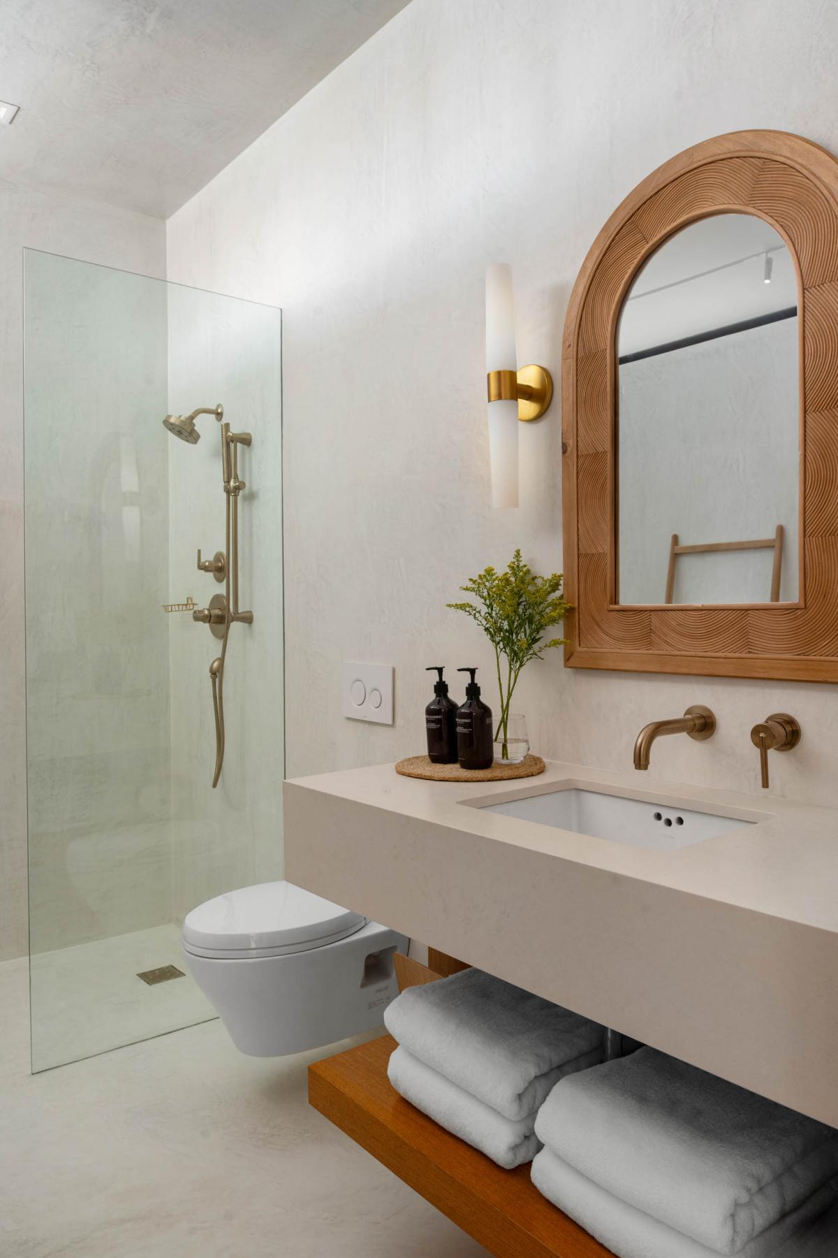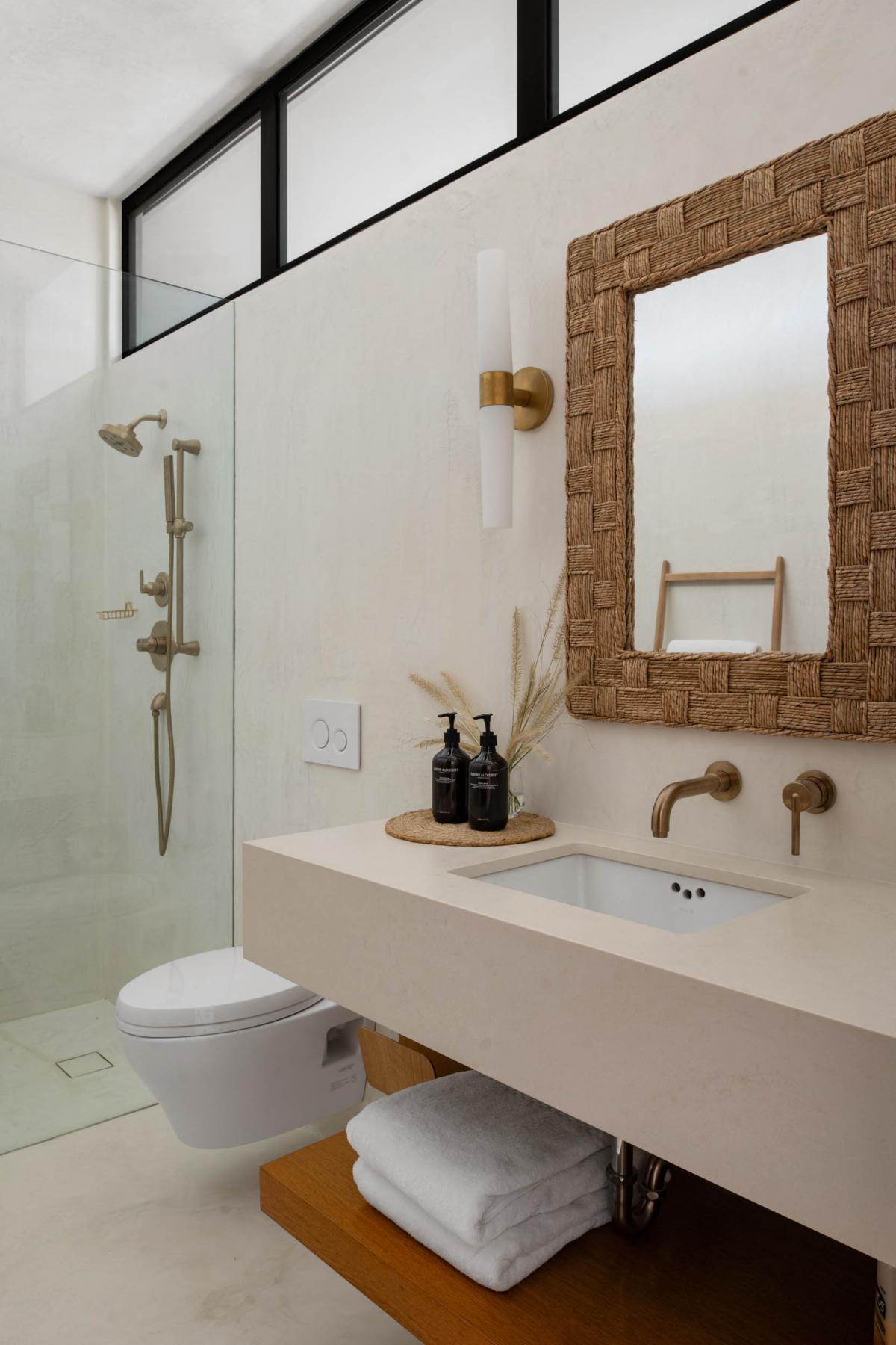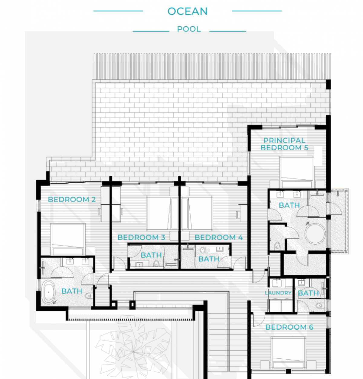 The six bedrooms and elegant ensuite bathrooms feature brass touches and beautiful hardwood floors, adding a touch of luxury and sophistication to each private space. The attention to detail in the design of the bedrooms is a commitment to providing guests with a high level of comfort and style. The luxurious primary suite, complete with indoor and outdoor showers as well as a circular tub, adds an extra layer of indulgence. This suite provides a retreat within a retreat, allowing guests to pamper themselves in a serene and stylish environment.
