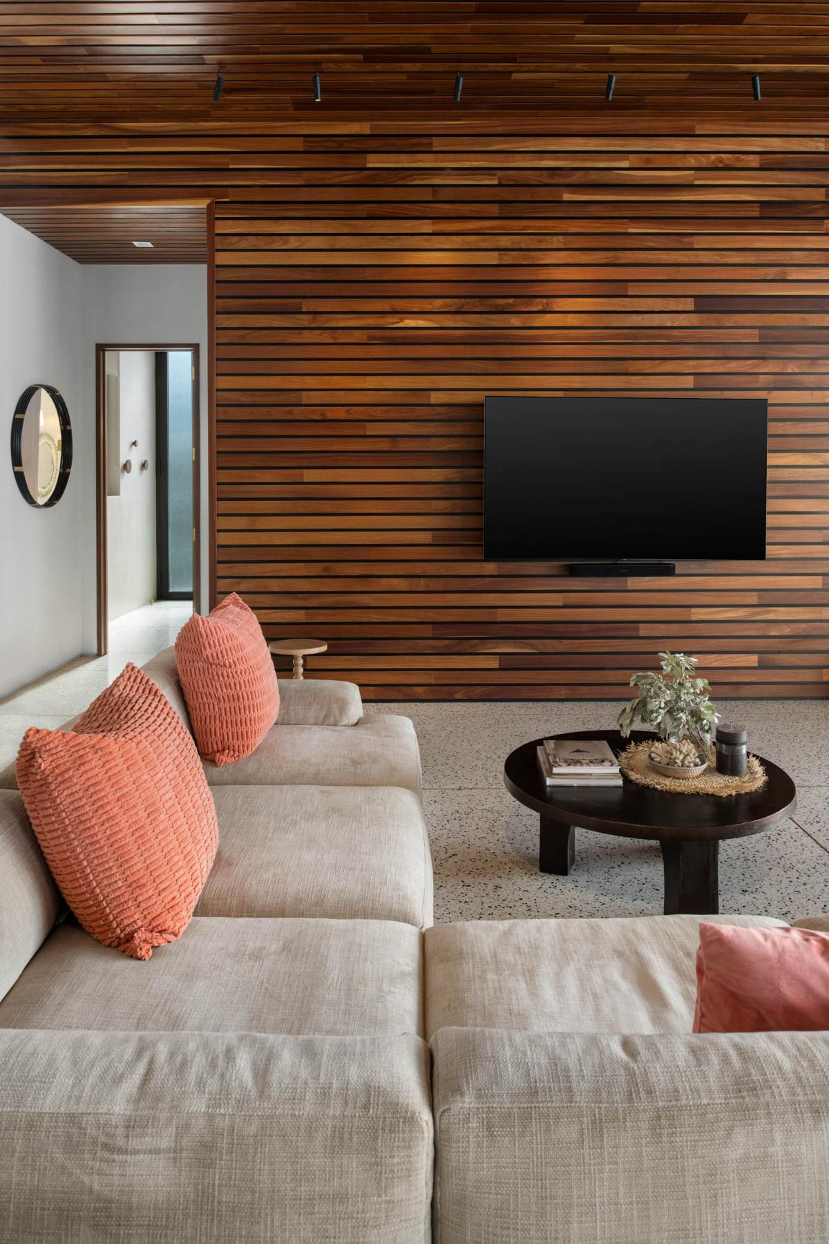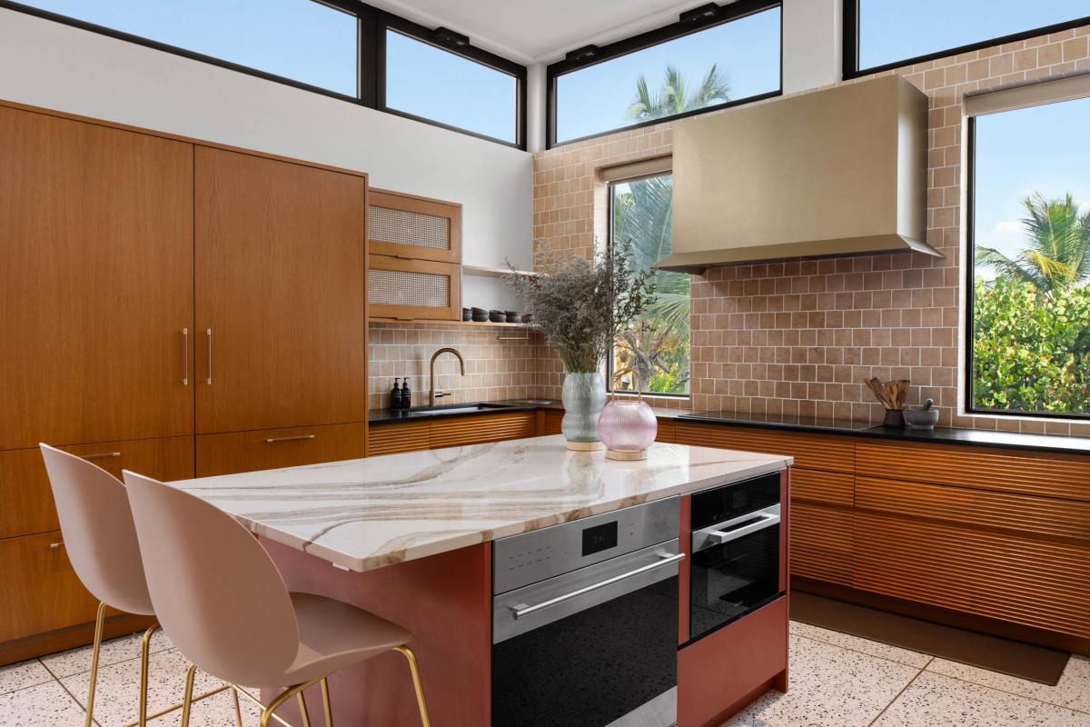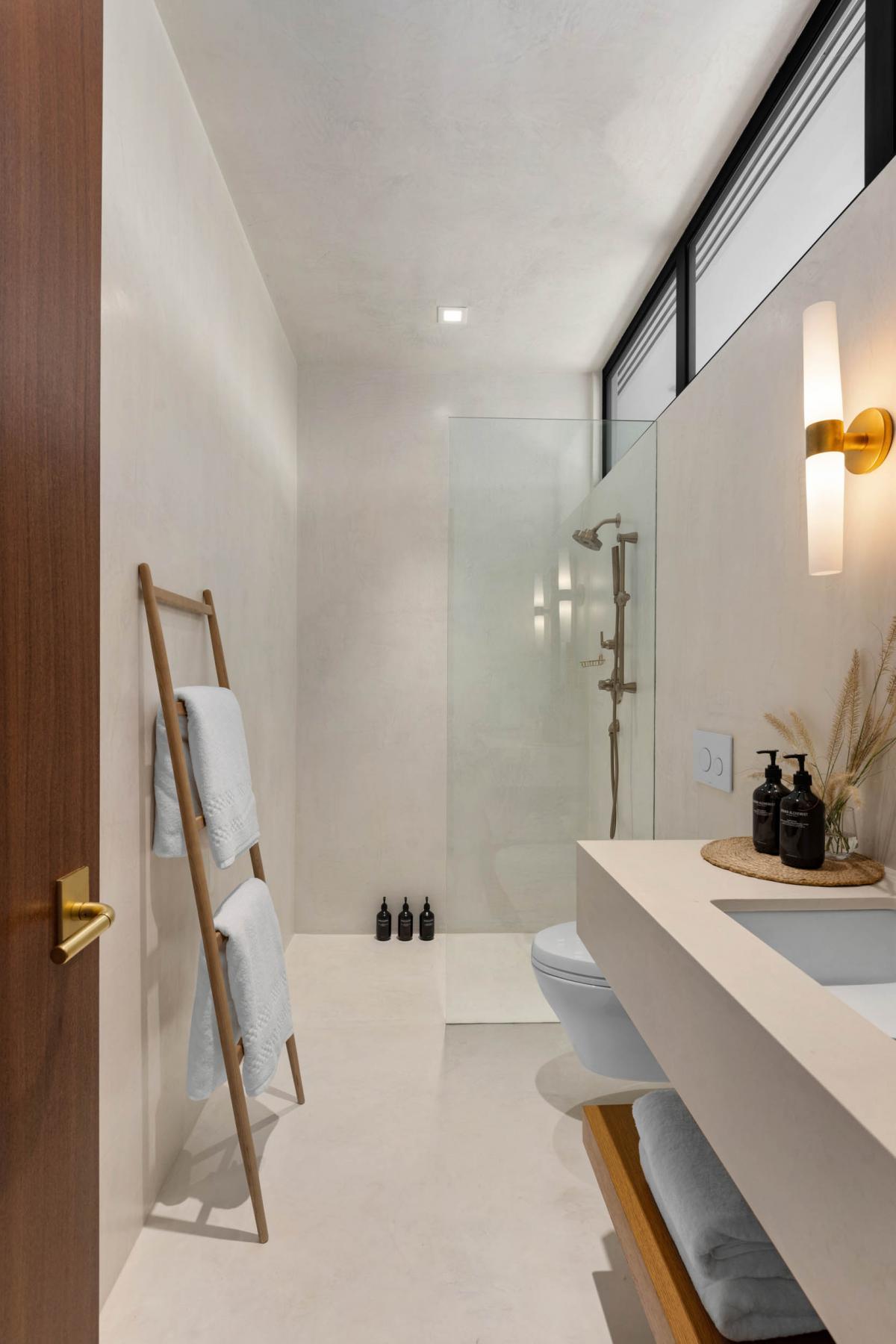 Marahuyo offers a seamless blend of modern and organic design elements, providing a sophisticated and comfortable atmosphere for its guests. The timber-clad ceilings and terrazzo floors contribute to the organic and contemporary feel of the interior, creating a harmonious living space. The fully pocketing doors in the living area are a wonderful touch, allowing guests to enjoy the surrounding outdoor beauty and creating an open and airy environment. This design choice enhances the overall experience, bringing the outdoors in and connecting the living space with the natural surroundings.