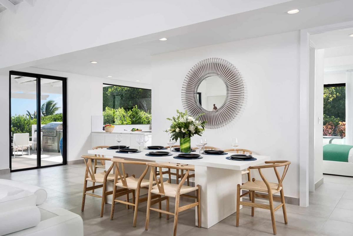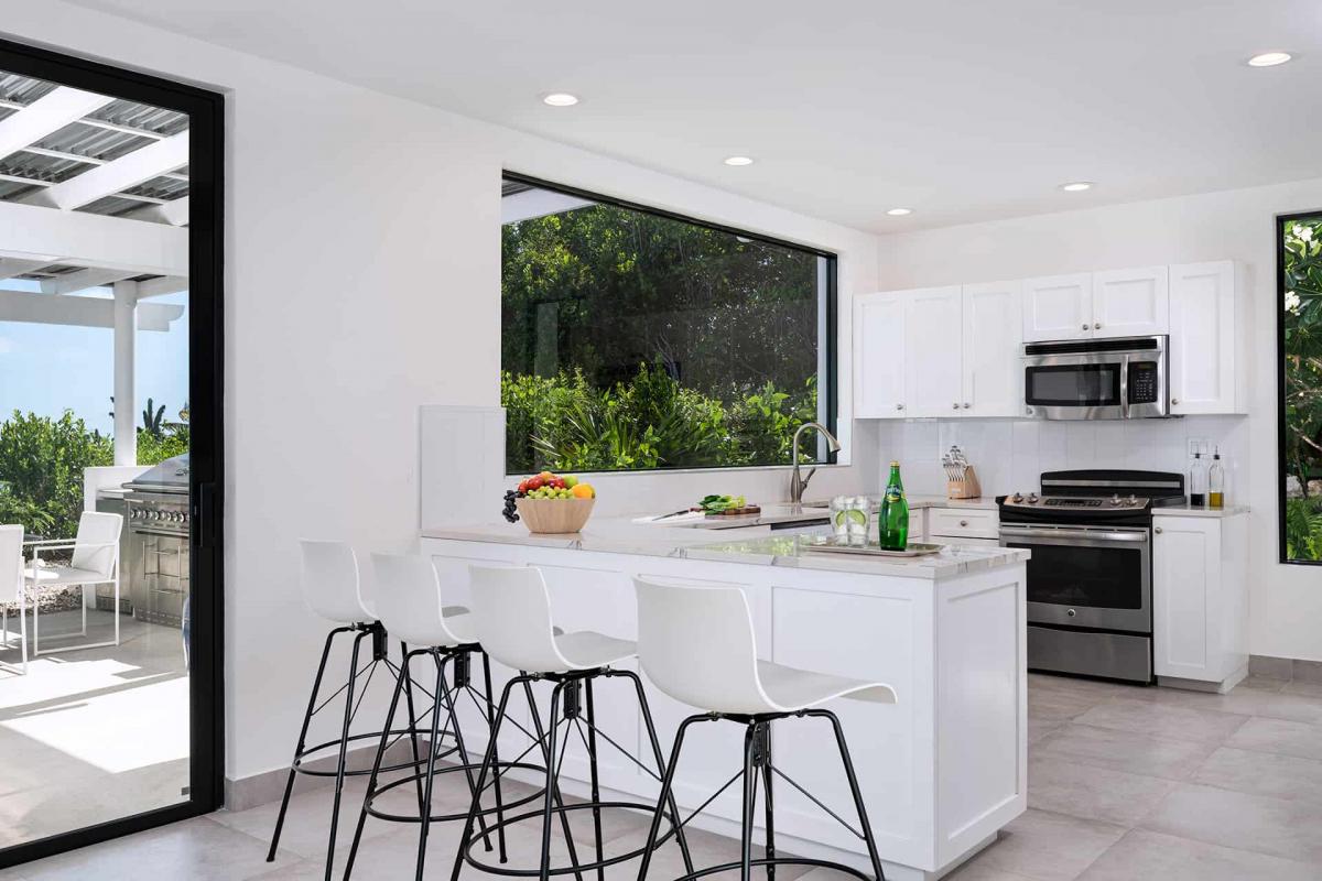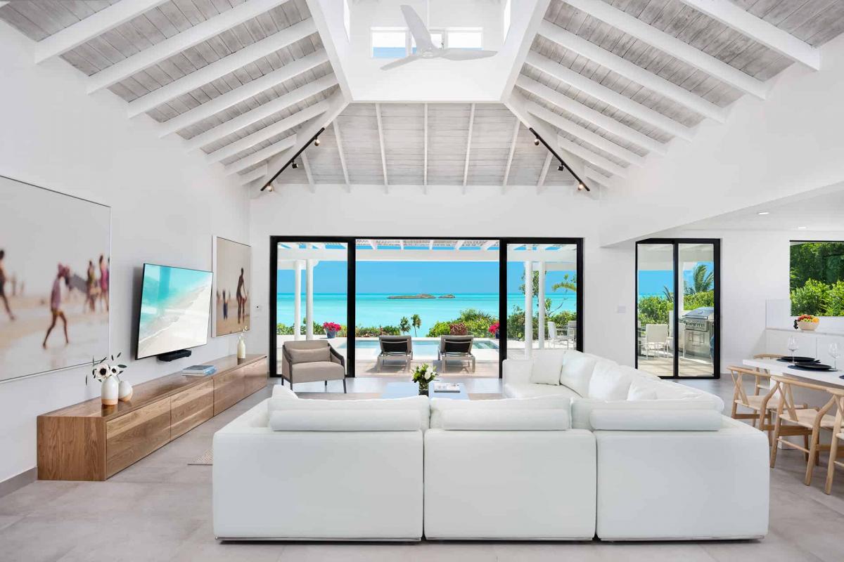 Sandy Shore Villa has a spacious, open-plan living and dining area. The architecture boasts seven 10-foot circular support columns and a two-story-high cupola with exposed beams. An 18-foot telescoping sliding-door system (with slide-away screens) overlooks the pool, the Caribbean Sea, and the nearby Five Little Cays.