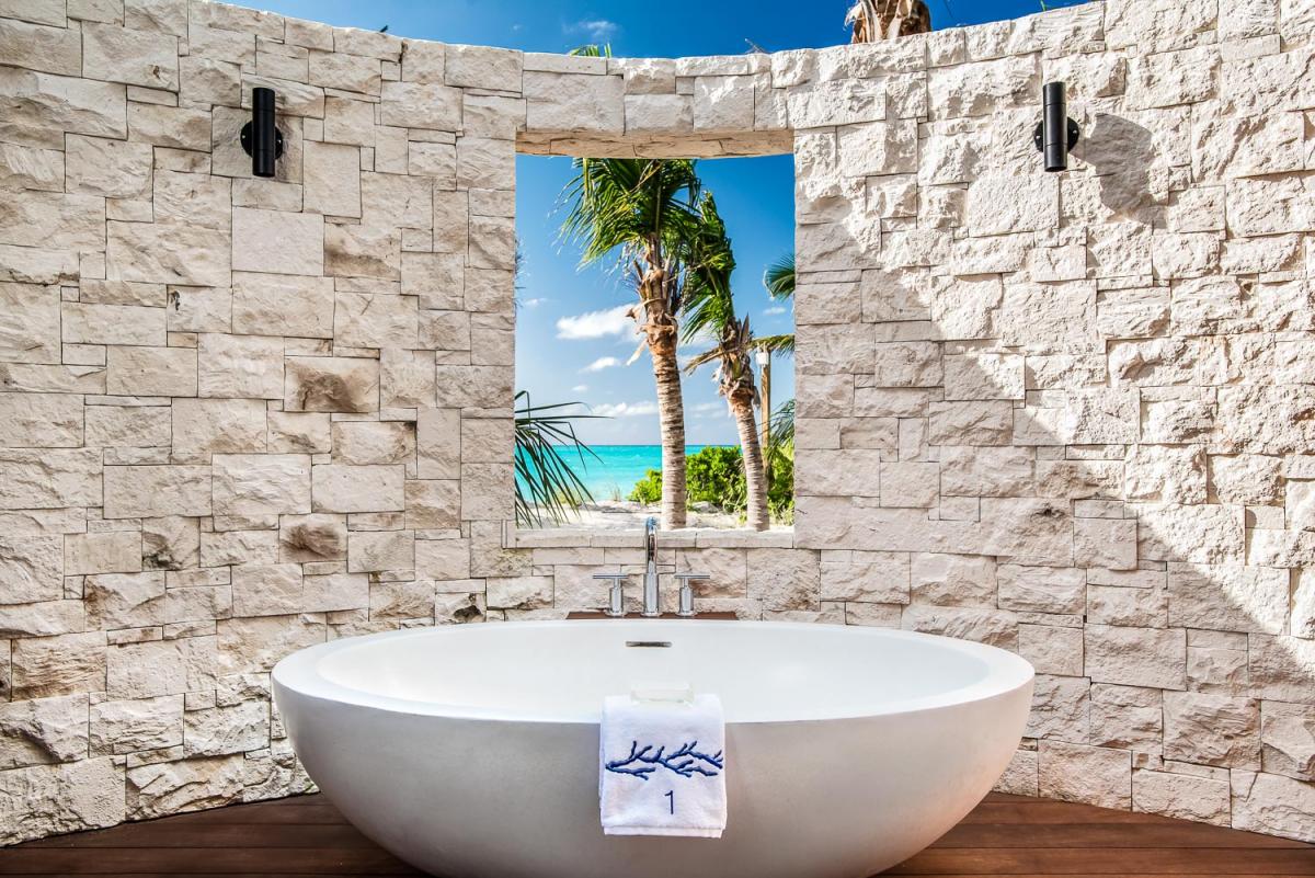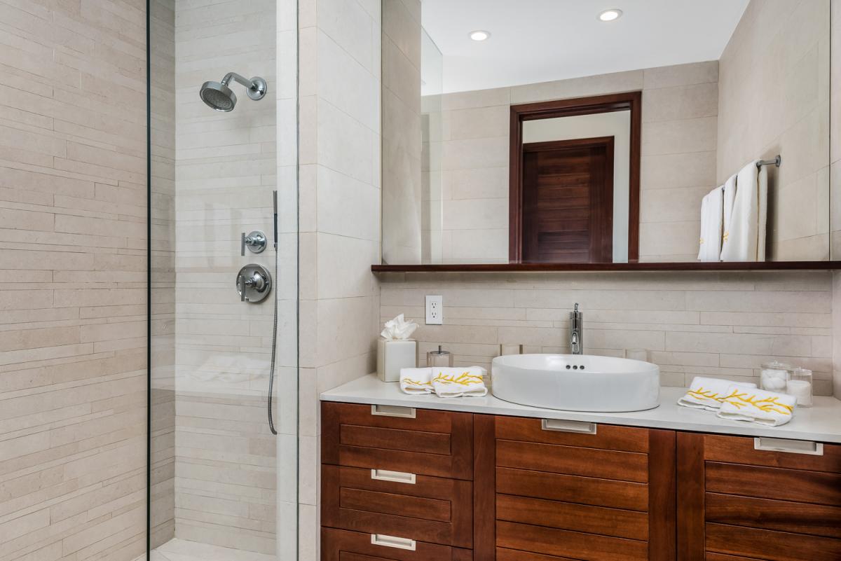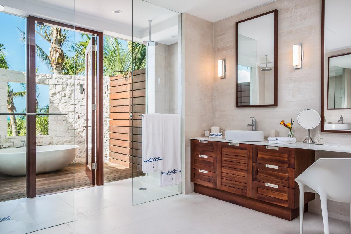 • Bedroom 1: King bed, en suite bathroom with shower and bathtub, al fresco rain shower, walk-in closet, TV, phone, AC, ocean view