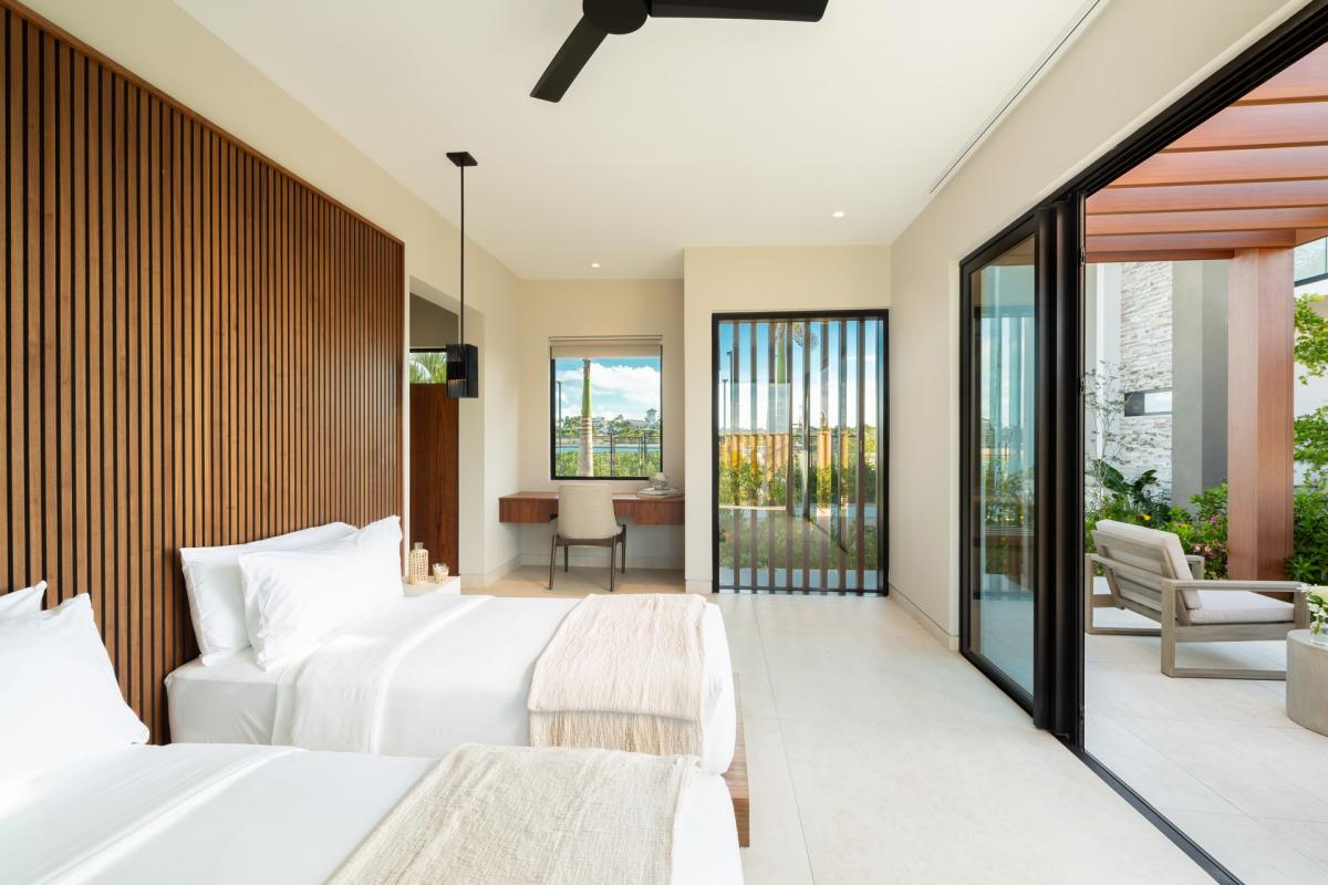 Bedroom 7: Second floor, lagoon and garden view, two twin beds convertible to king, ensuite bathroom with double sink, rain shower.