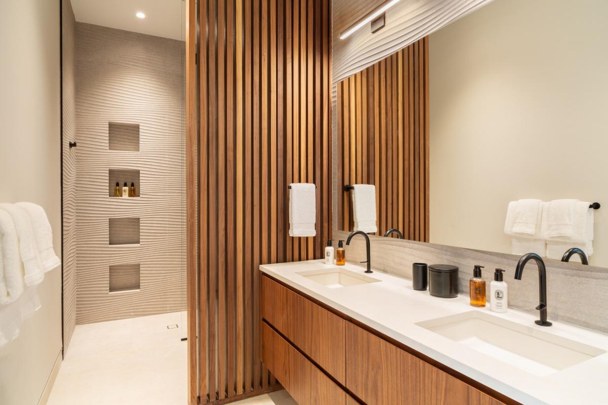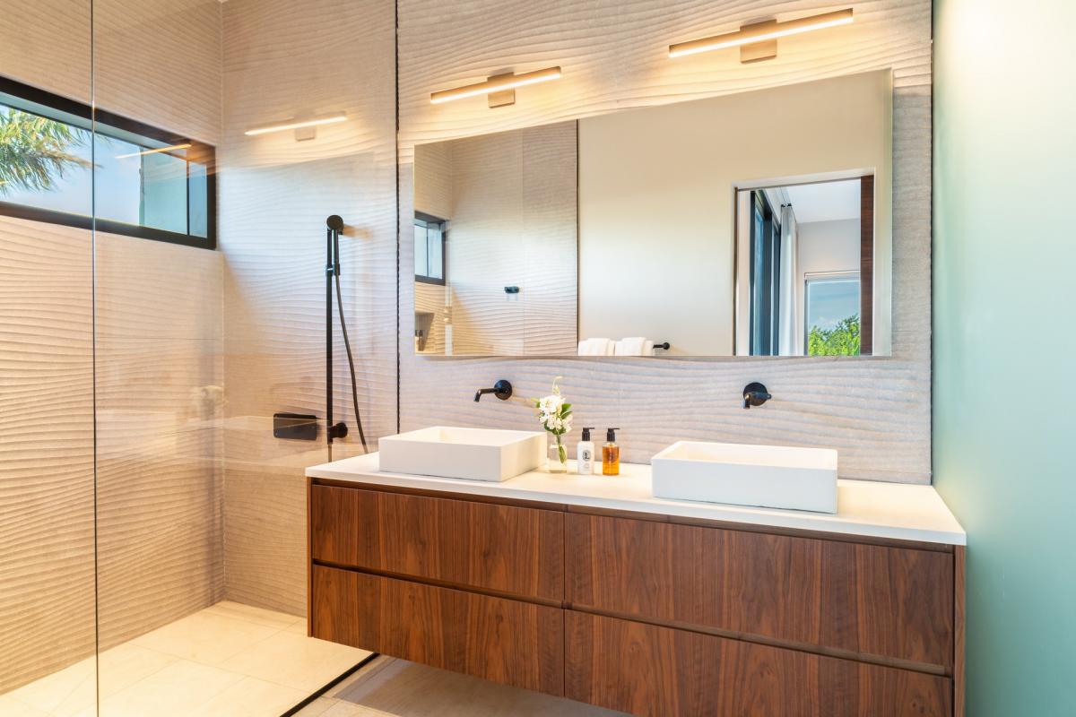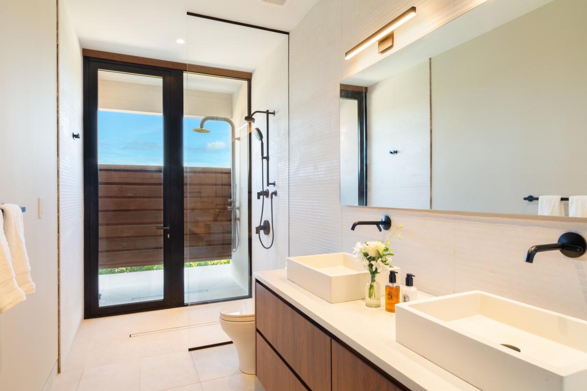 Bedroom 2: Second floor, lagoon and garden view, two twin beds convertible to king, ensuite bathroom with double sink, rain shower.