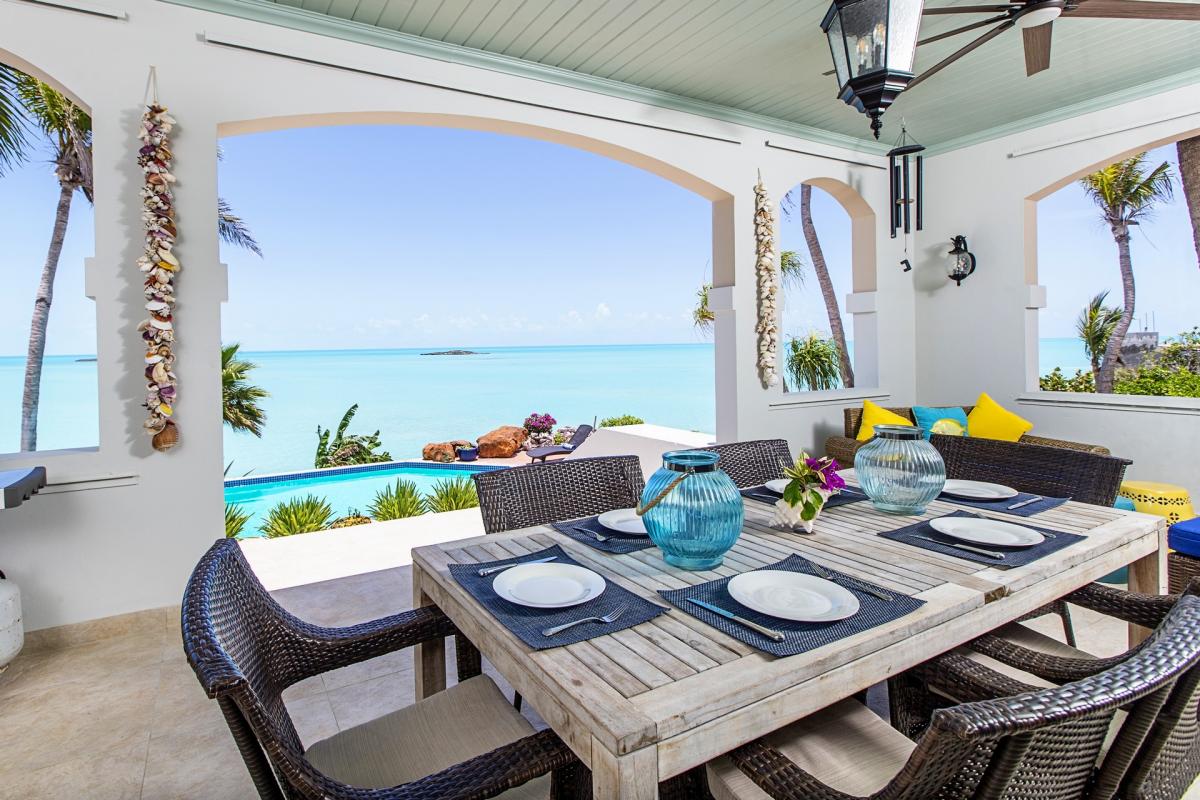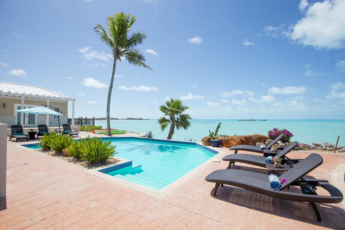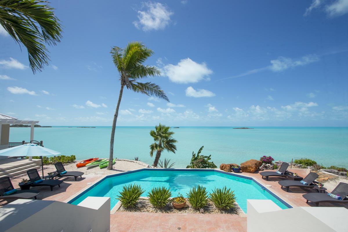 A 4000 sq. ft. Mediterranean styled palace in the sun, this four bedroom Three Cays Villa with 150 feet of water frontage has brand new stainless steel appliances, living, and bedroom furniture. The views from this Turks and Caicos villa in the tropics are endless and are some of the best on the island. Three Cays Villa's master bedroom has beautiful wooden french doors that open up to its own terrace allowing you to read your favorite book while you bask in the ever present trade winds. Additionally, with a semicircular stone staircase that literally disappears into gin clear water in the rear of the villa, you have never been closer to the water. Sit by the pool in the fully landscaped, mature gardens or lounge by the ocean on the large coral stone tile patio. For those who love to snorkel, Three Cays Villa is named as such because directly behind the villa, are three natural reefs teeming with sea life. For those lazy days you may wish to sit around in the ocean front fully covered terrace and listen to your favorite tunes with a sound system that has exterior speakers and can be heard anywhere in the pool area. Spend your Turks and Caicos vacation here!