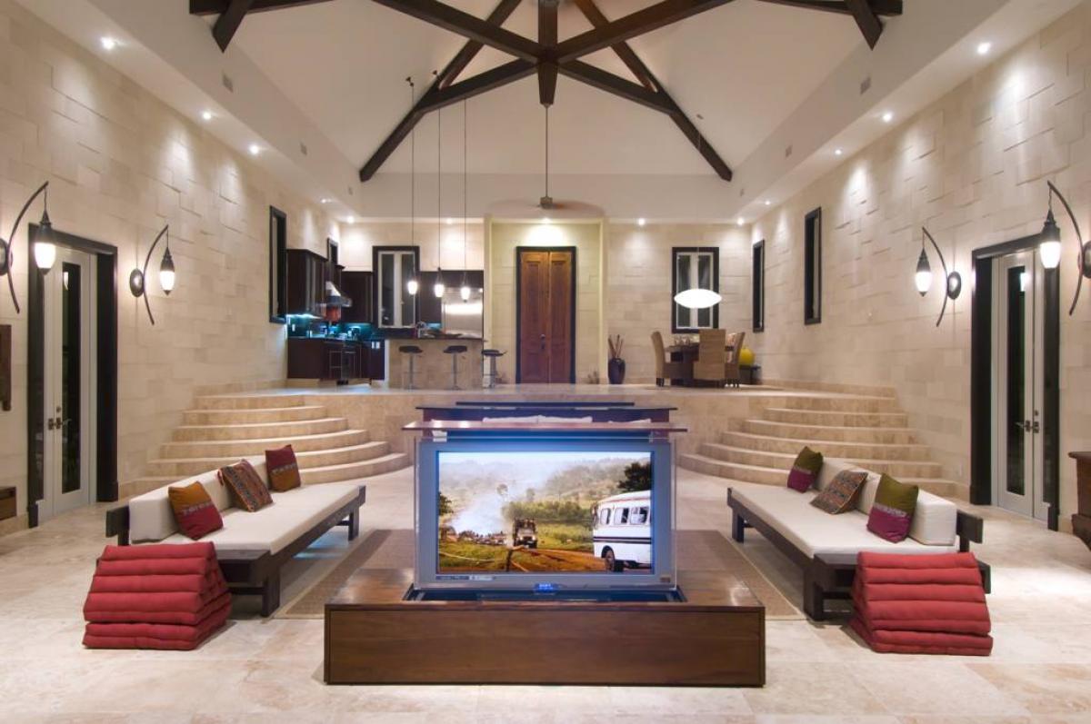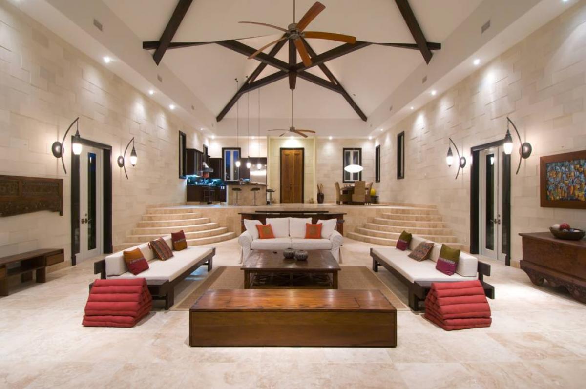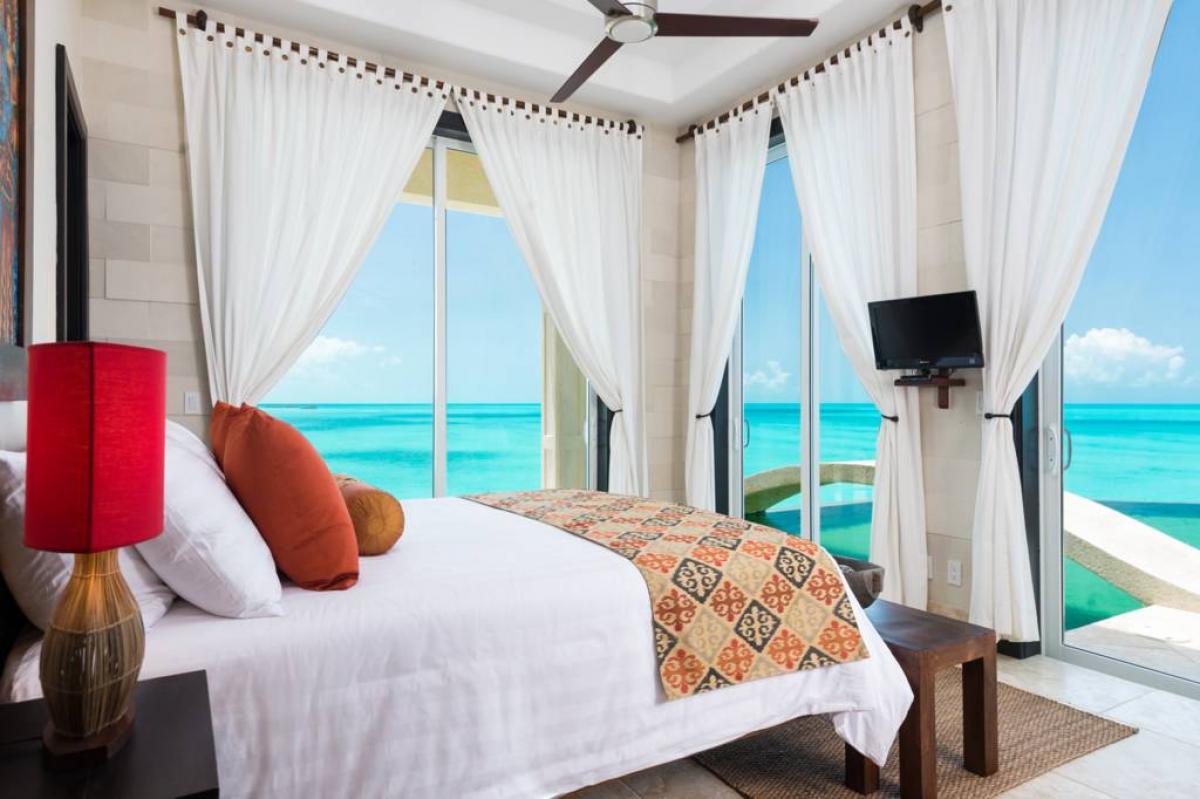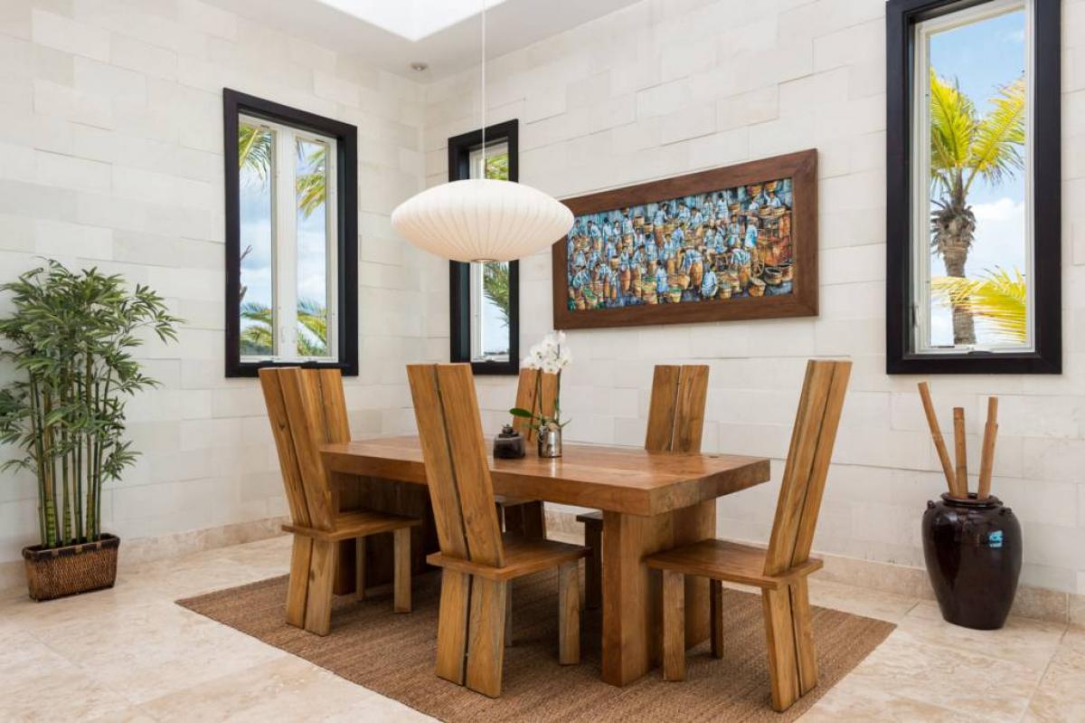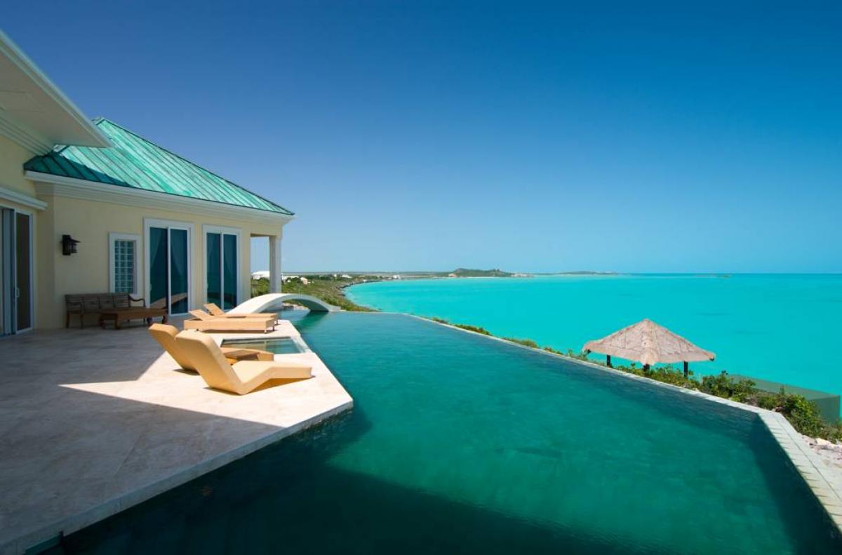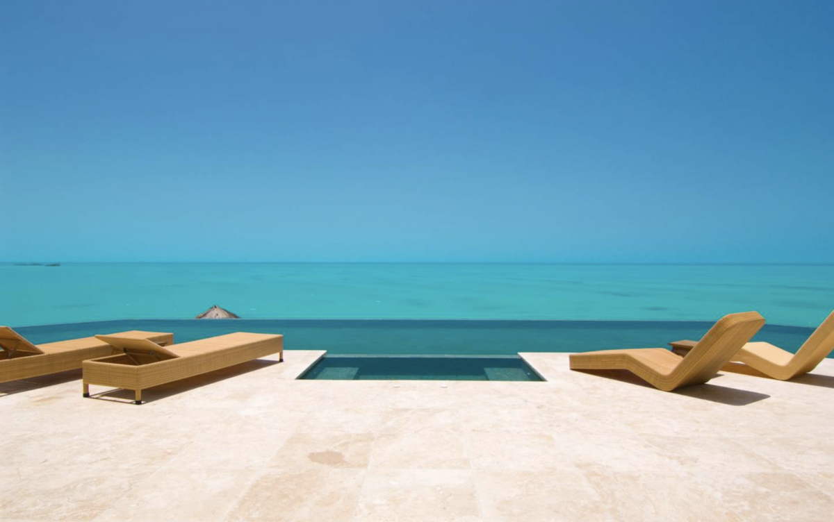 Villa Balinese is a new, luxury oceanfront vacation villa located on the south shore of Providenciales. Designed and built by its ingenious and talented owners, it creates an exciting architectural coupling of the finest in Caribbean style and exquisite Balinese interior themes. Built on an elevated crescent shaped ridge overlooking the Caribbean waters of the Turks and Caicos Banks, Villa Balinese is surrounded by the clear blue panorama of spectacular ocean vistas and cooled by the constant trade winds. Here is an extraordinary vacation home with simply the best of everything. The villas's exterior entrance features a 75' river stone bank of cascading waterfalls flanked by a row of coconut palms. 4,200 square feet of interior space begins with a great room of vast proportions and bold design. Travertine marble flooring, towering 30' vaulted ceilings of cedar beams, and walls of intricately patterned Asian pearl stone tiles will be found in this beautiful home. The kitchen, off to the right, is a gourmet chef's delight with clean lines, stainless steel Viking appliances, 6 burner gas stove, custom wood cabinetry, black granite countertops, and center island counter with stools for informal dining. A formal dining area to the left is furnished in Indonesian teak providing seating for 6. Stunning ocean views fill the entire great room as one progresses to a large sunken living room with adjoining granite bar, including ice maker, fridge, and 2 wine coolers. The 50' plasma TV and music center is recessed beneath low cabinetry and raised by hydraulic control for viewing. 25' high pocket, wall to wall glass doors recess and expand the living room to the large outdoor pool terrace overlooking the Caribbean sea. The master bedroom wing adjoins the angular pool and comprises a 35' x 35' suite with 90 degree glass doors looking out to sea, from which one steps directly into the pool. The opposite wing houses two ensuite oceanview bedrooms, each with wall to wall glass doors giving access to poolside. The second guest room also embraces the angle of the swimming pool and has steps leading into it. Each of the guest rooms has a private balcony furnished with handcrafted Balinese daybeds. Furnished with impeccable taste and style in a mixture of imported Balinese-Indo style with superior hand made contemporary and antique pieces, ornamentals, and artwork, the villa is replete with custom design elements of innovation and functionality. The stunning centerpiece of the villa's living and terraced pool area is the three angled, over sized infinity pool constructed in emerald green stone. The pool spans the house's breadth and is embraced by its two extreme angled bedroom wings, together forming a hexagon. An arched pool bridge spans the pool at one end. Cascading over the main pool is a rectangular 8' x 5' infinity edge heated Jacuzzi pool. Both cascading pools create a dramatic visual connectivity to the ocean below. A limestone walkway leads to the ocean, via a coconut and 'alang alang' thatched gazebo furnished in meditative Asian pieces, and roll down straw blinds; a perfect spot for daily massages, or contemplating the soothing waterfront environment. The pathway continues down to the ocean, accessed by several steps for a delightful swim.