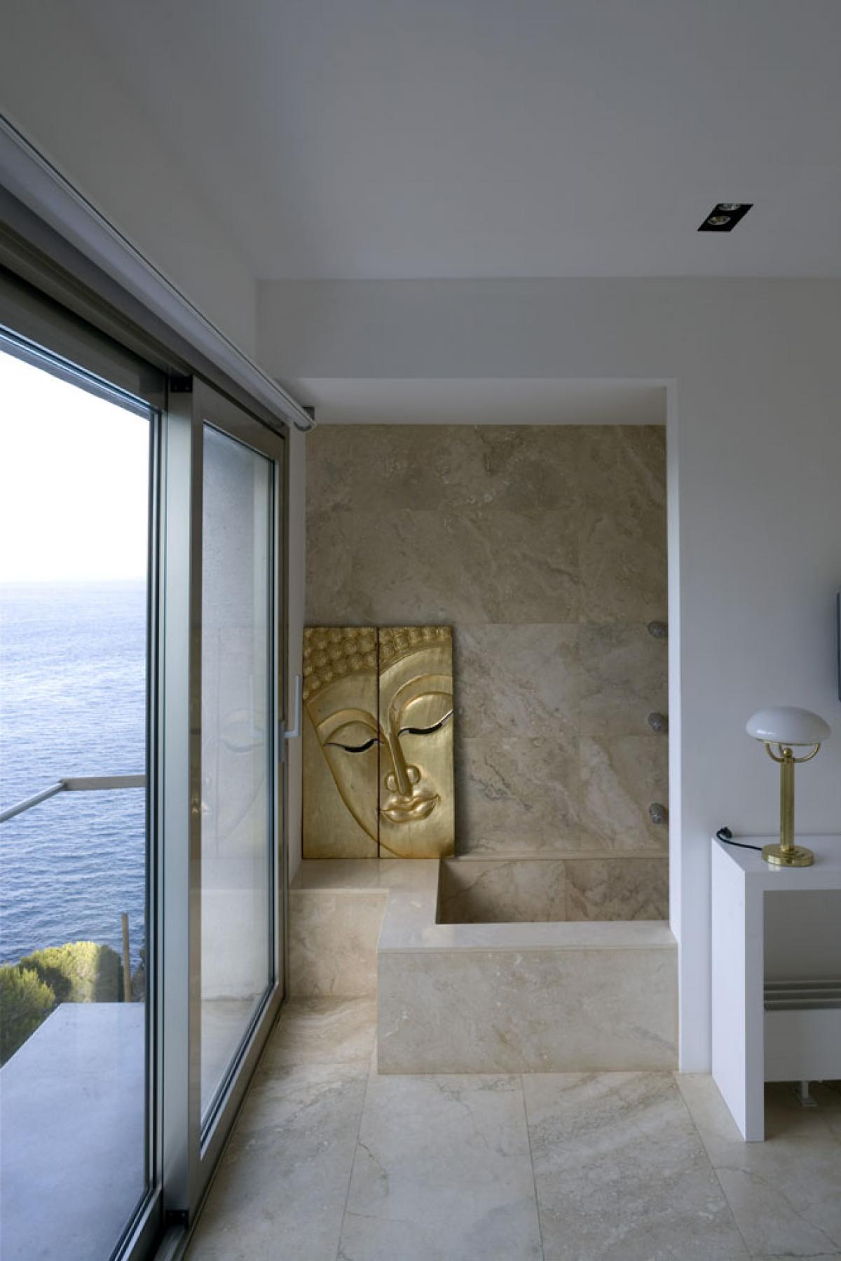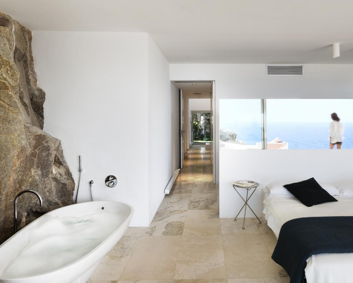 The level beneath the living level is home to two beautiful guest suites, each with panoramic sea views and the sound of crashing waves. The first guest bedroom, the gold suite, has a queen size bed as well as fainting sofa, private terrace and en suite bath. The second suite sits seaside and offers floor to ceiling views, as well as a cliff hanger office area, king size bed, sitting area, fireplace and en suite bath with separate tub.